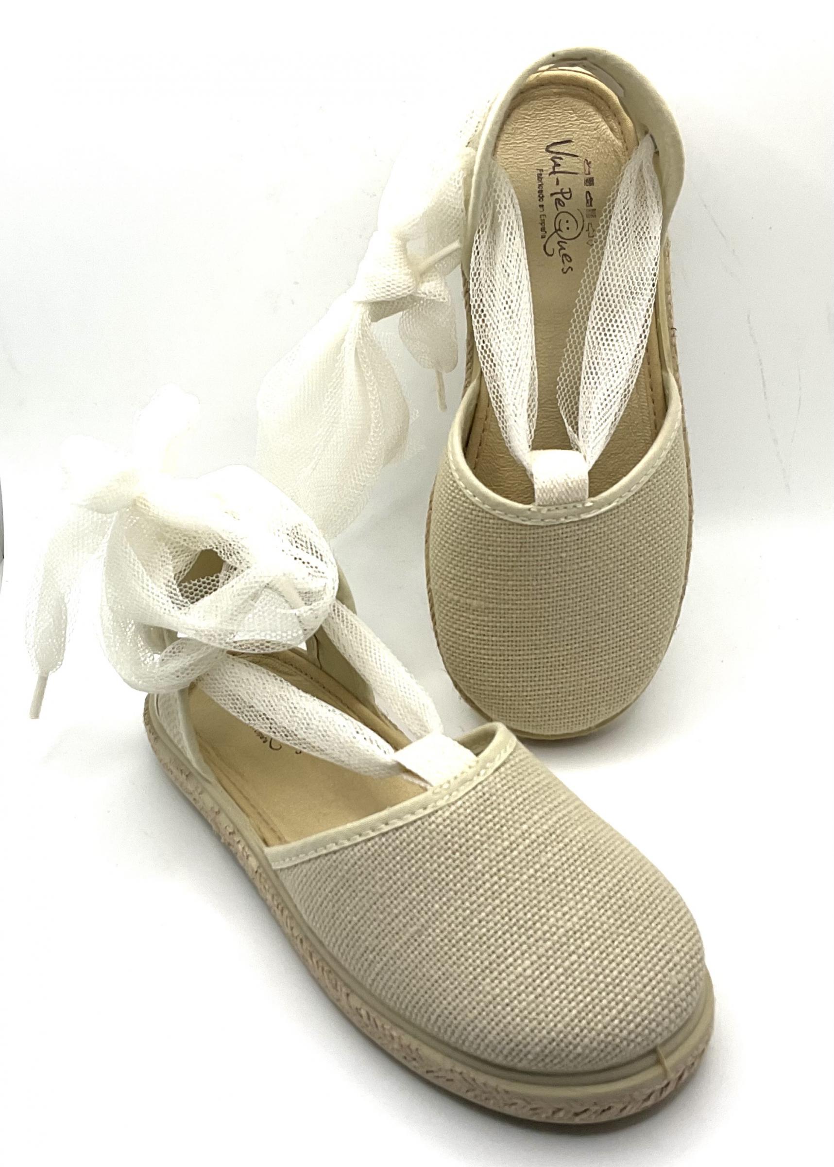 Valenciana de esparto con cinta de tul, se ata a la pierna, está fabricada en lino de algodón de color beige, El piso es de goma con cinta de esparto inyectada son ligeras y flexibles