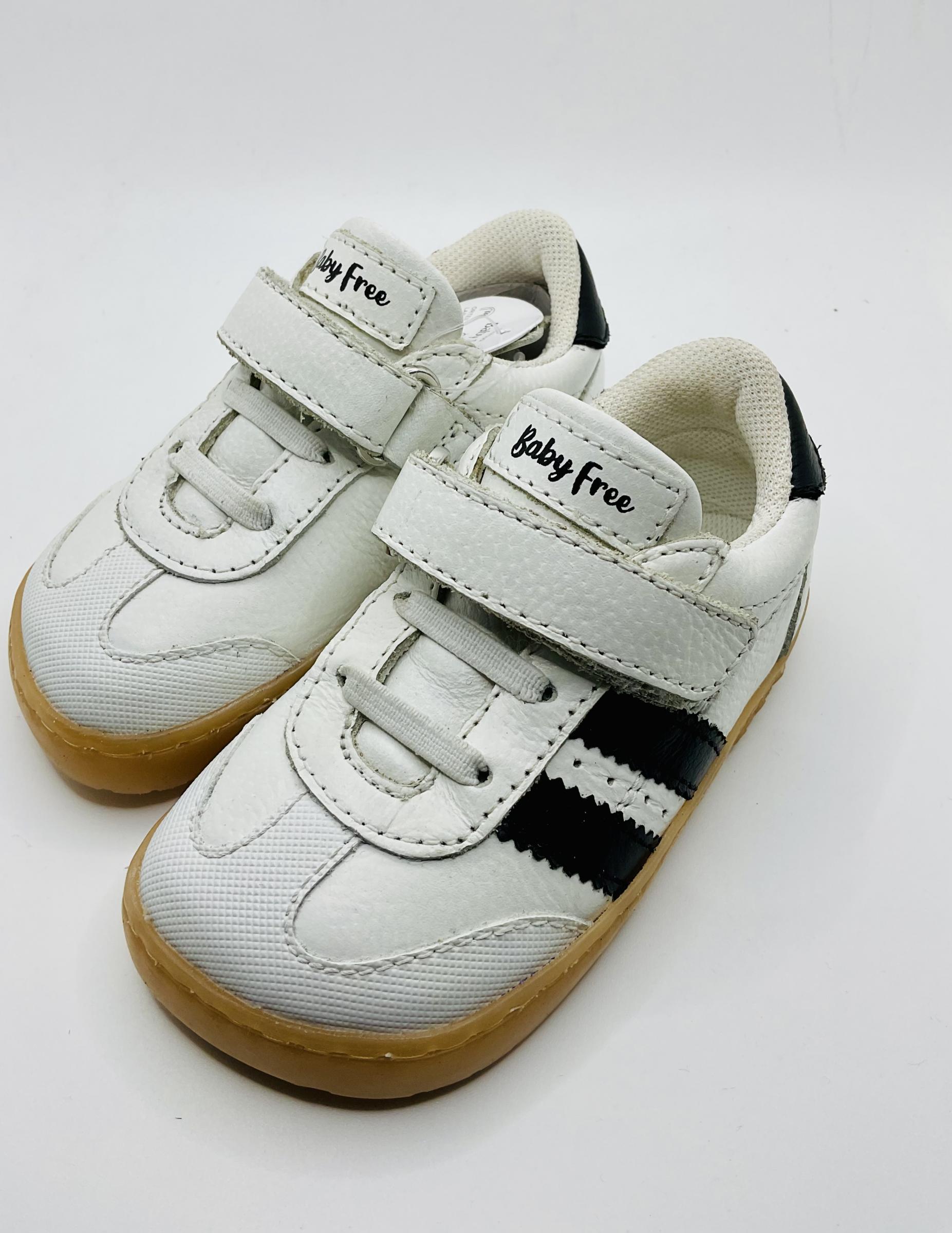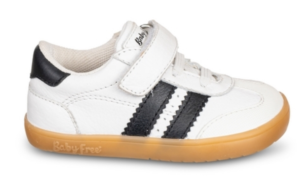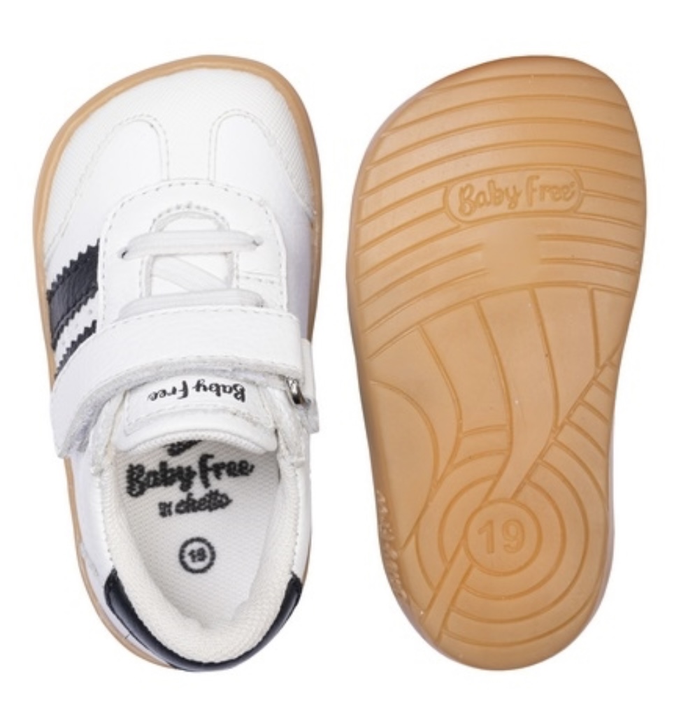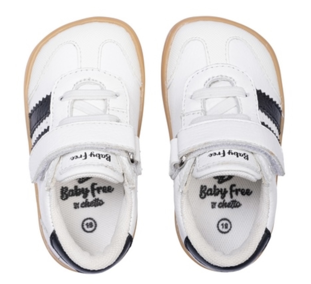 Deportiva Barefoot, Blanca con bandas Marino ,con velcro y cordones elásticos, ligeras y flexibles, totalmente respetuosas con la pisada de tu hijo.