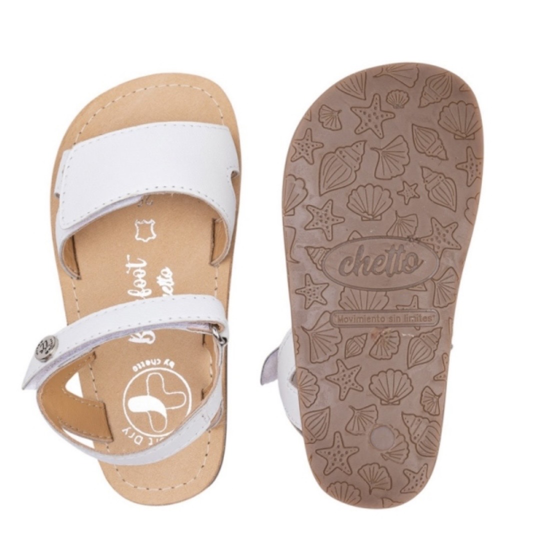 Sandalia Barefoot de la marca Chetto, fabricada en piel blanca, con ajuste en el empeine mediante un velcro y ajuste en el tobillo también con Velcro