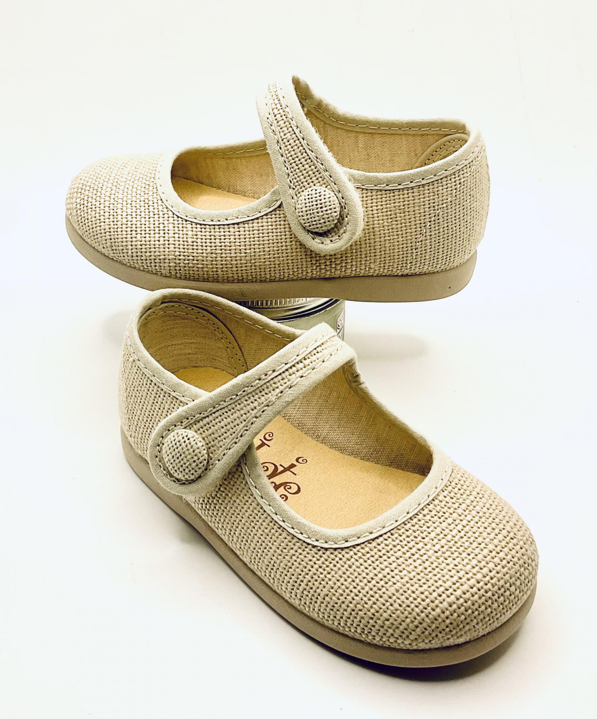 Merceditas, con ajuste de velcro y botón de adorno, fabricada en color hielo en tejido natural, con piso de goma, muy