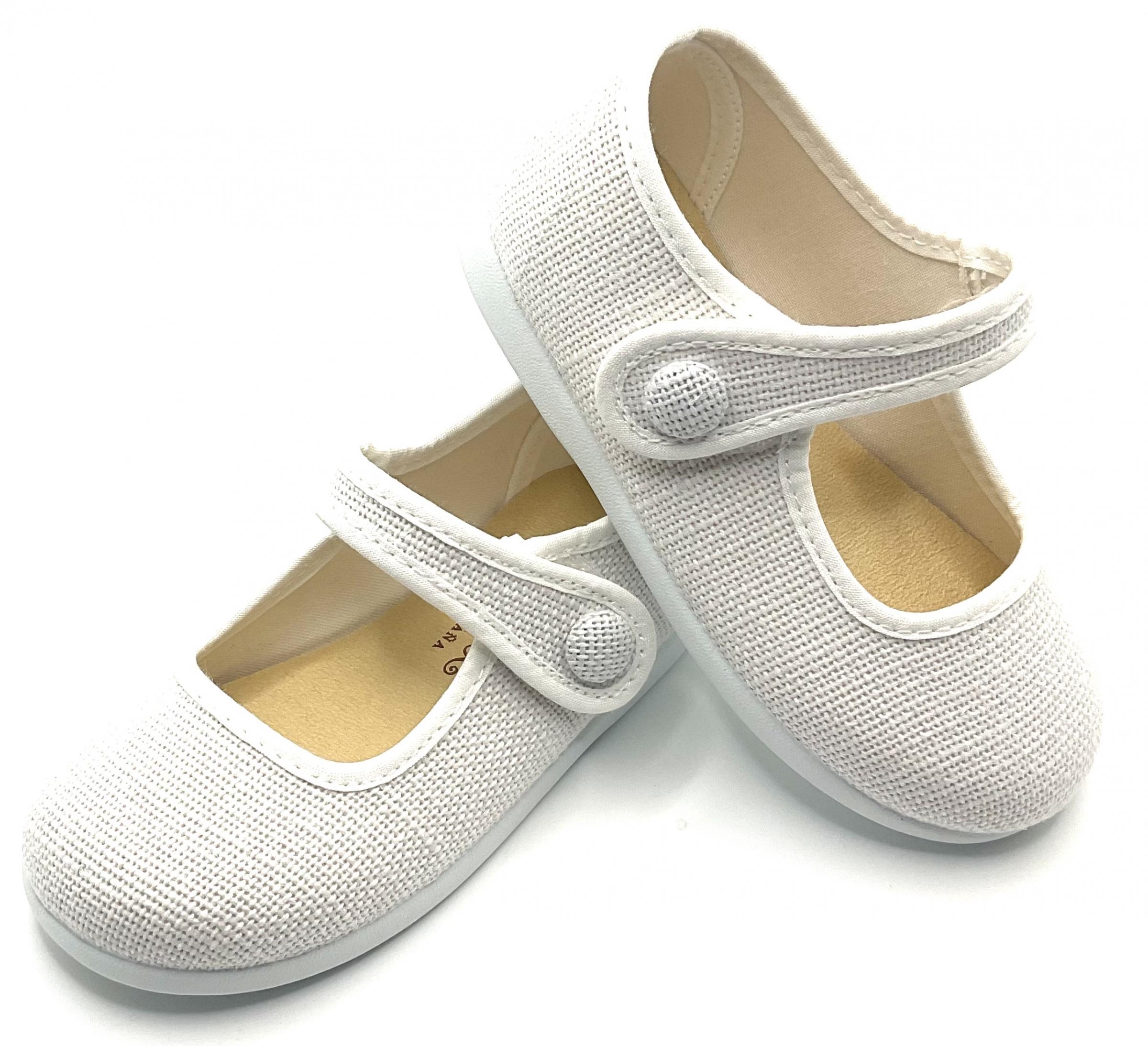 Mercedita de la marca chocolate fabricada en lino blanco, ajuste con velcro y botón de adorno.
