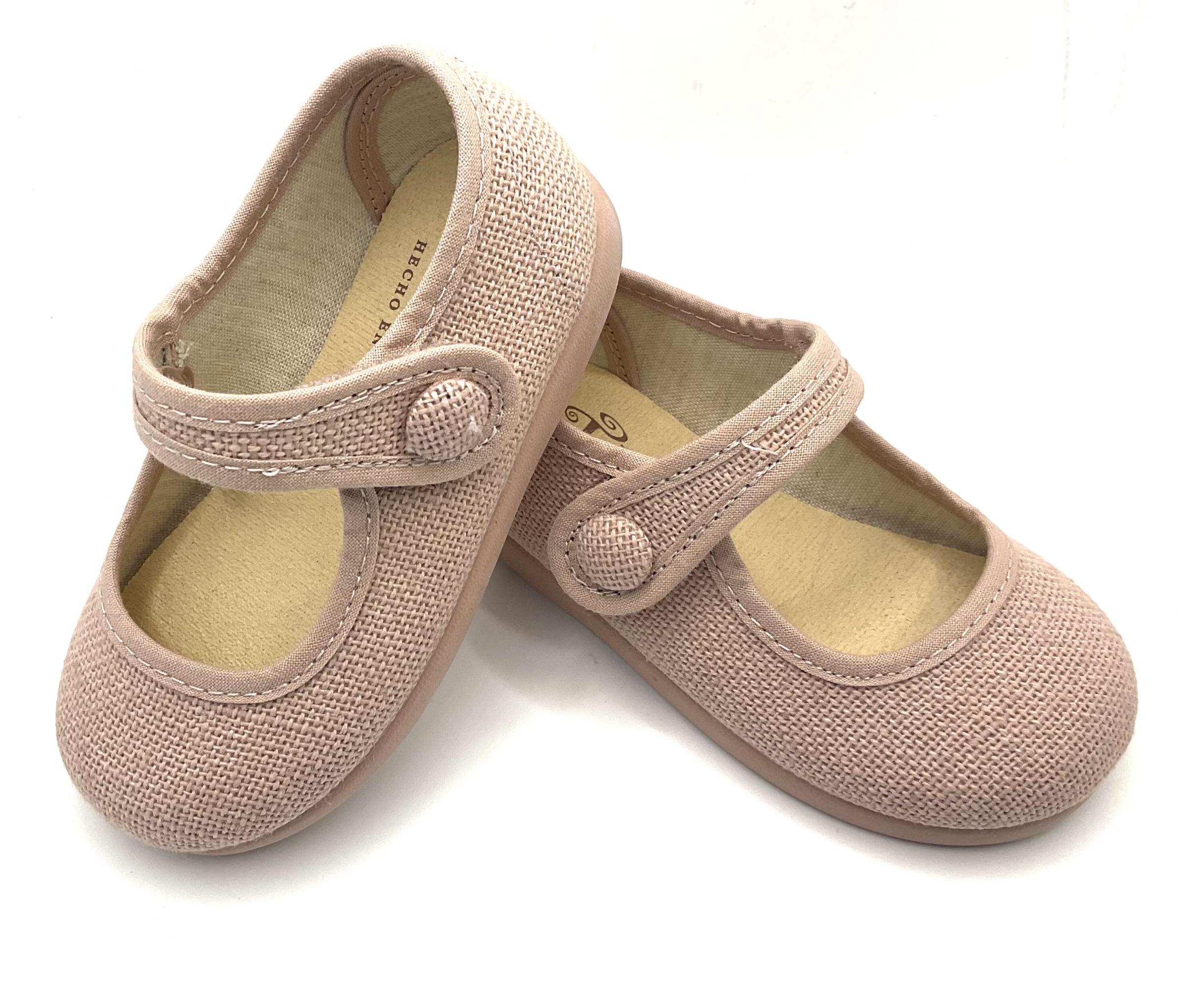 Merceditas de lino en color rosa maquillaje ,con ajuste de velcro y botón de adorno