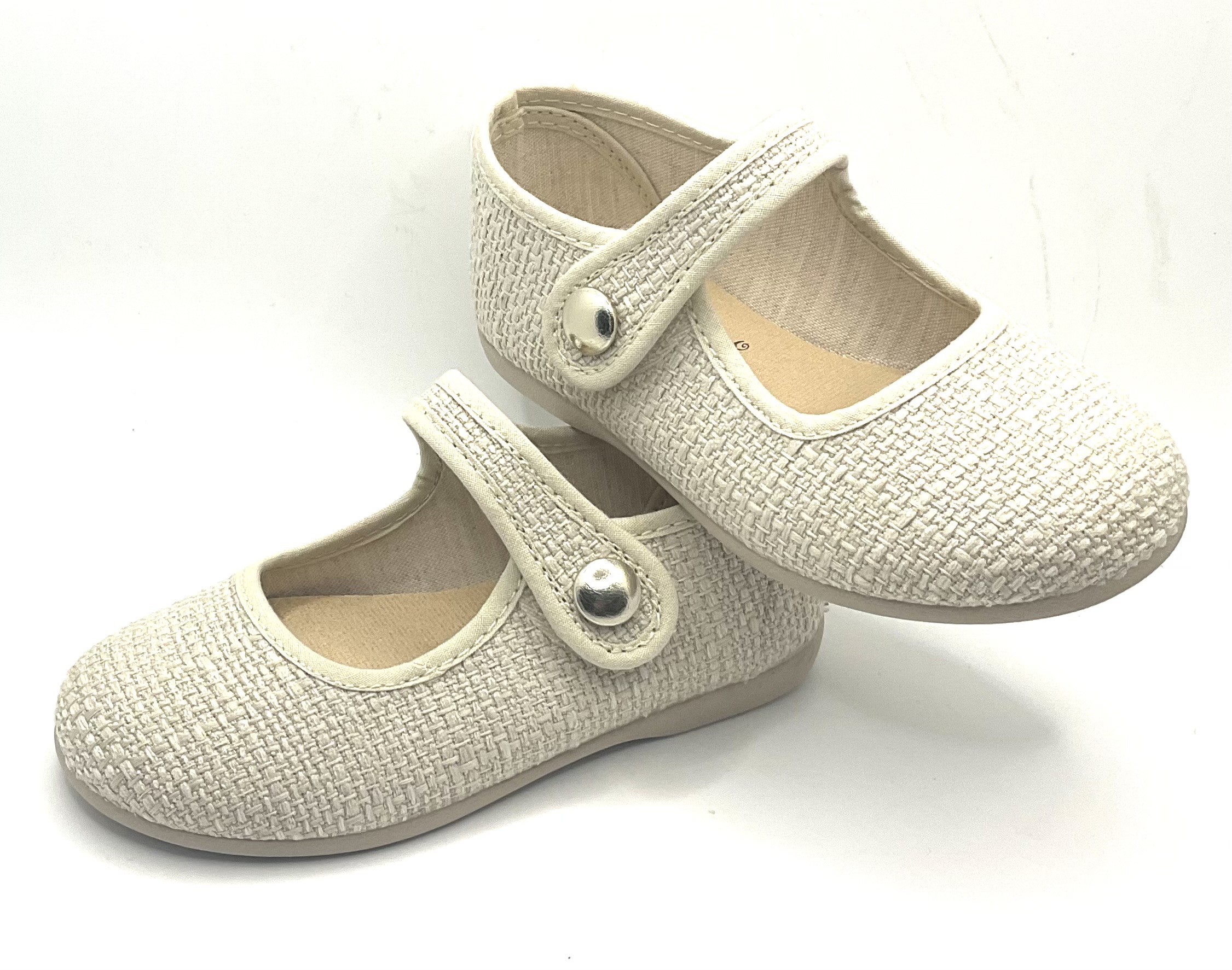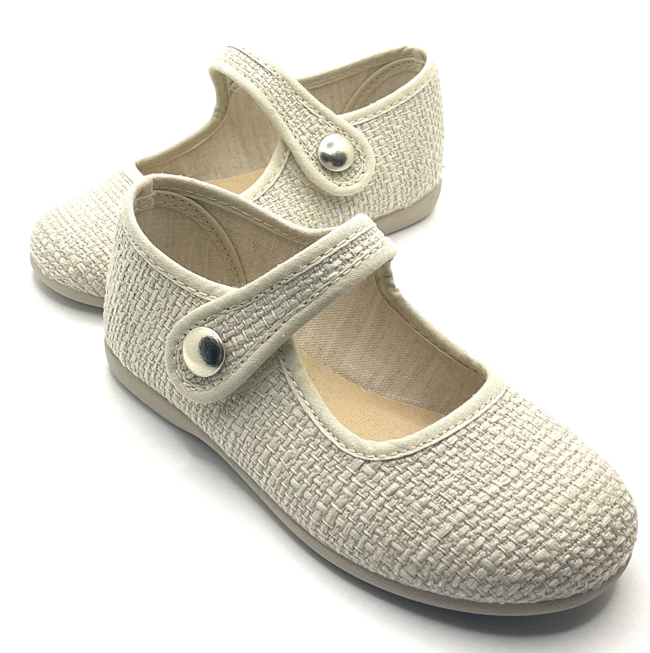 Merceditas de lona En color beis con ajuste de velcro y botón metalizado de adorno piso de goma ligeras y flexibles