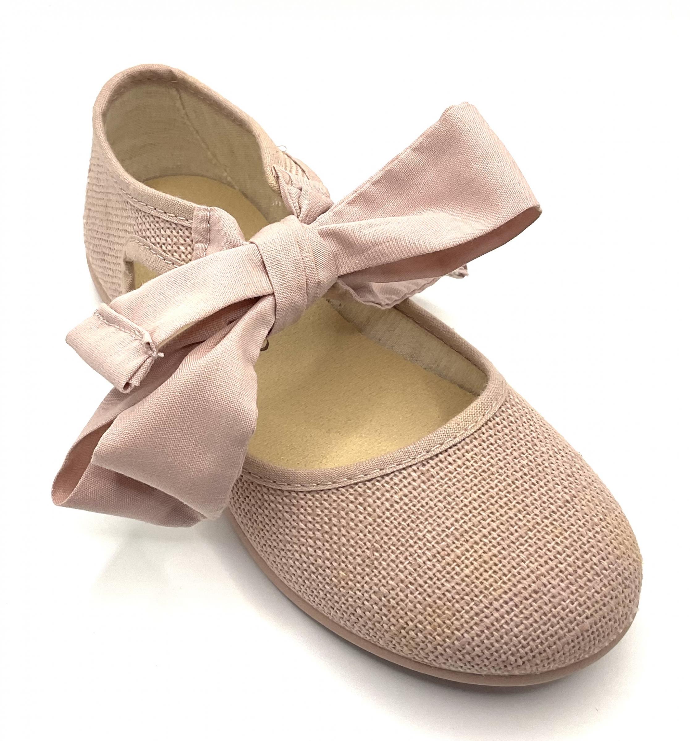 Angelito fabricado en lino de color rosa maquillaje, con ajuste y cierre en lazada sobre el tobillo .