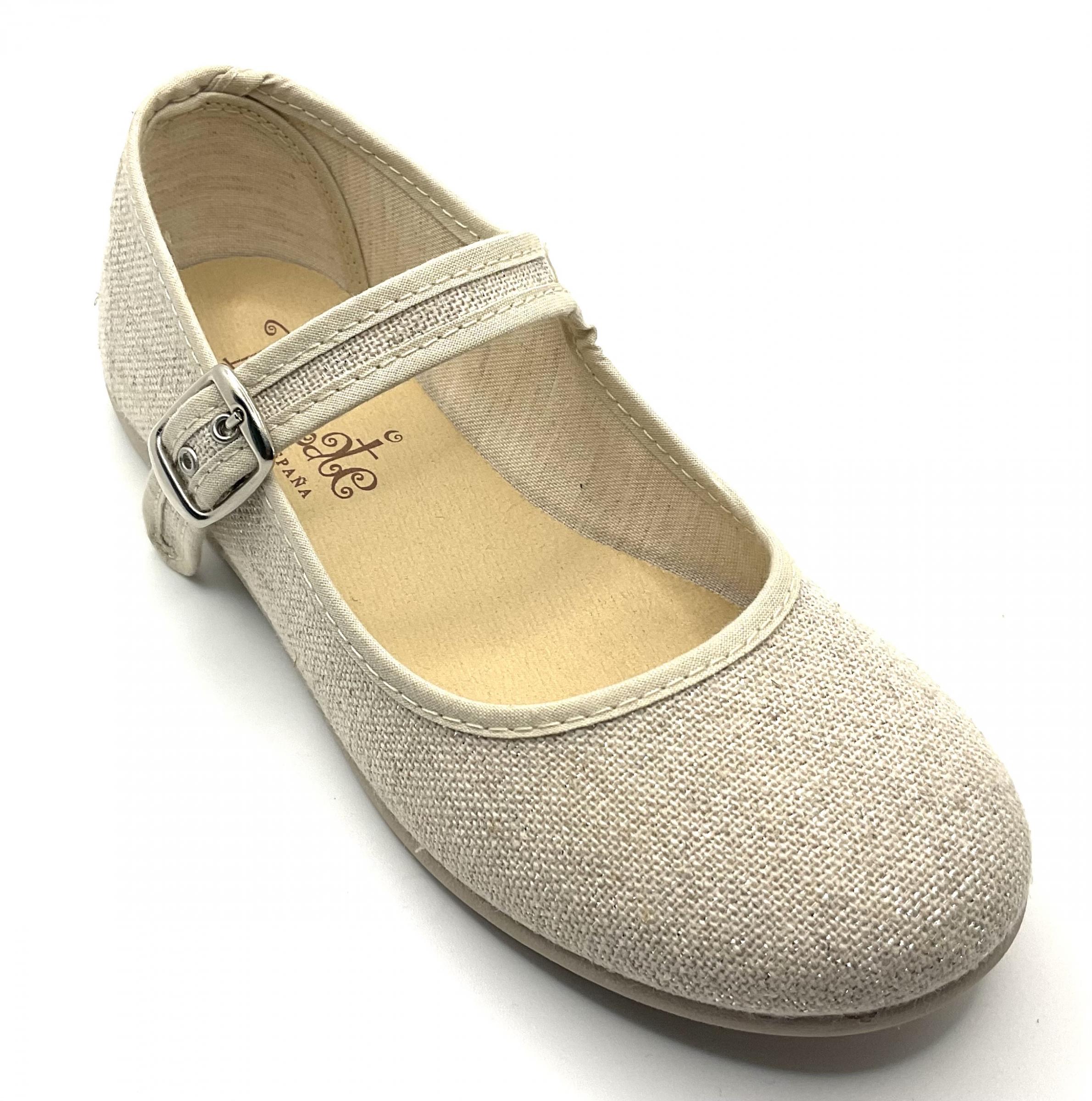 Merceditas, fabricadas en lino de algodón, color natural, metalizado, con ajuste y cierre de hebilla