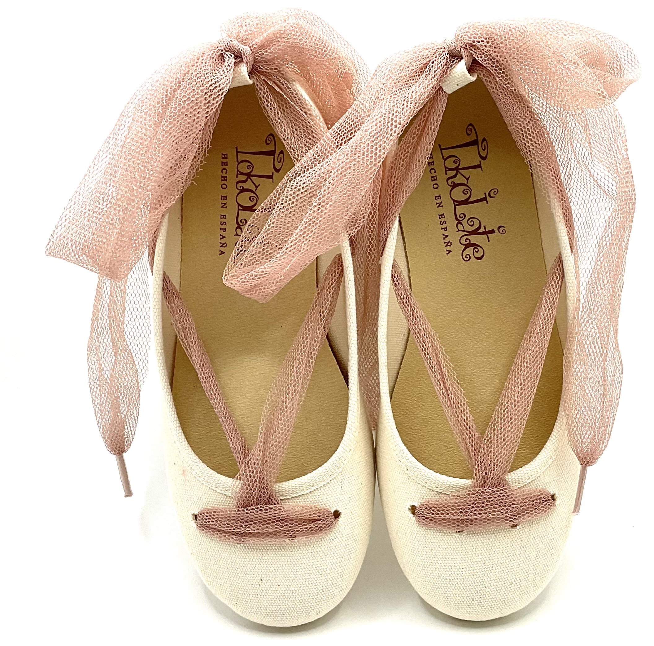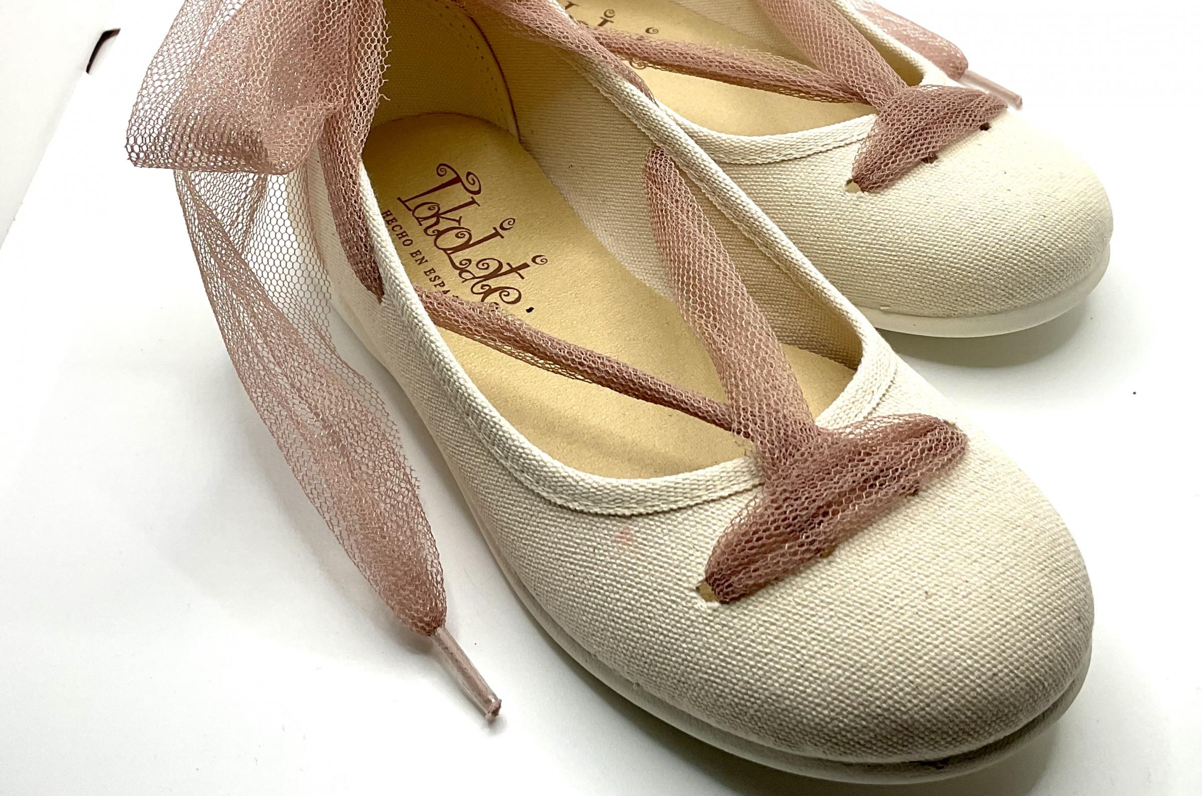 Manoletinas fabricadas en lino de algodón beige. Ajuste con Cinta de tul Cruzada al empeine al tobillo, piso de goma ligeras y muy flexibles.