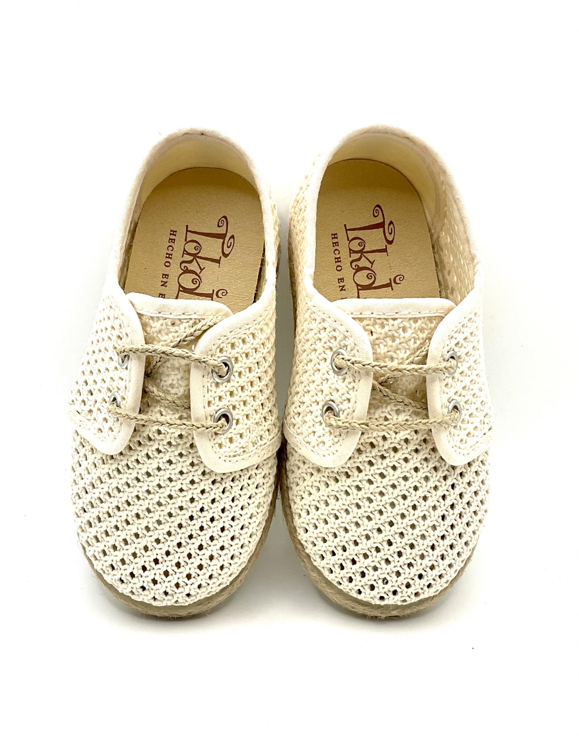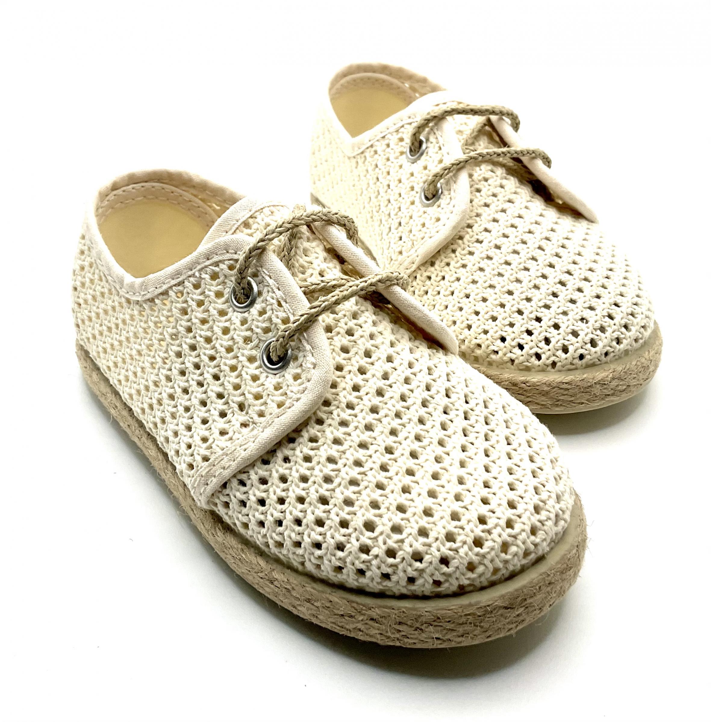 Blucher para niño fabricado en tela de rejilla de color crudo, ajuste con Cordones, piso de goma con embellecedor de Esparto