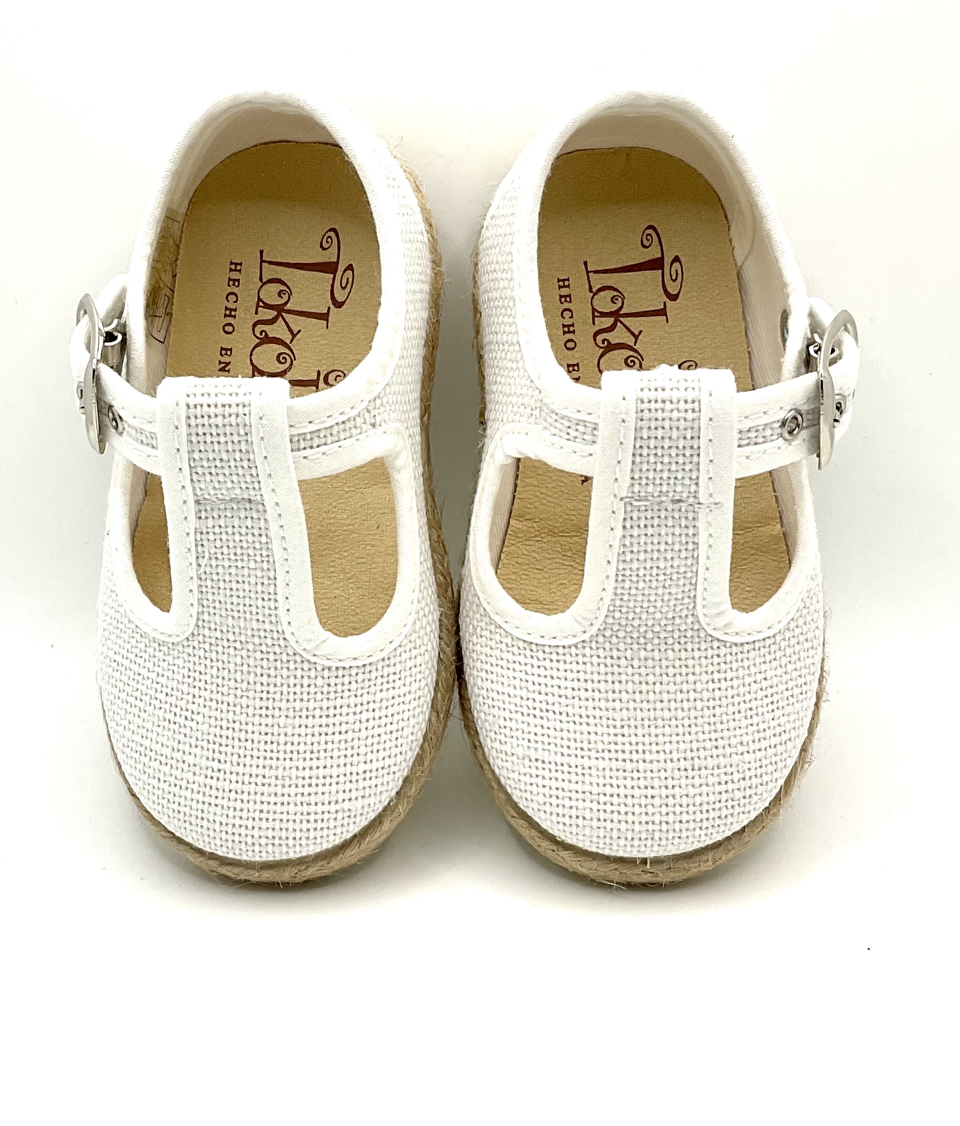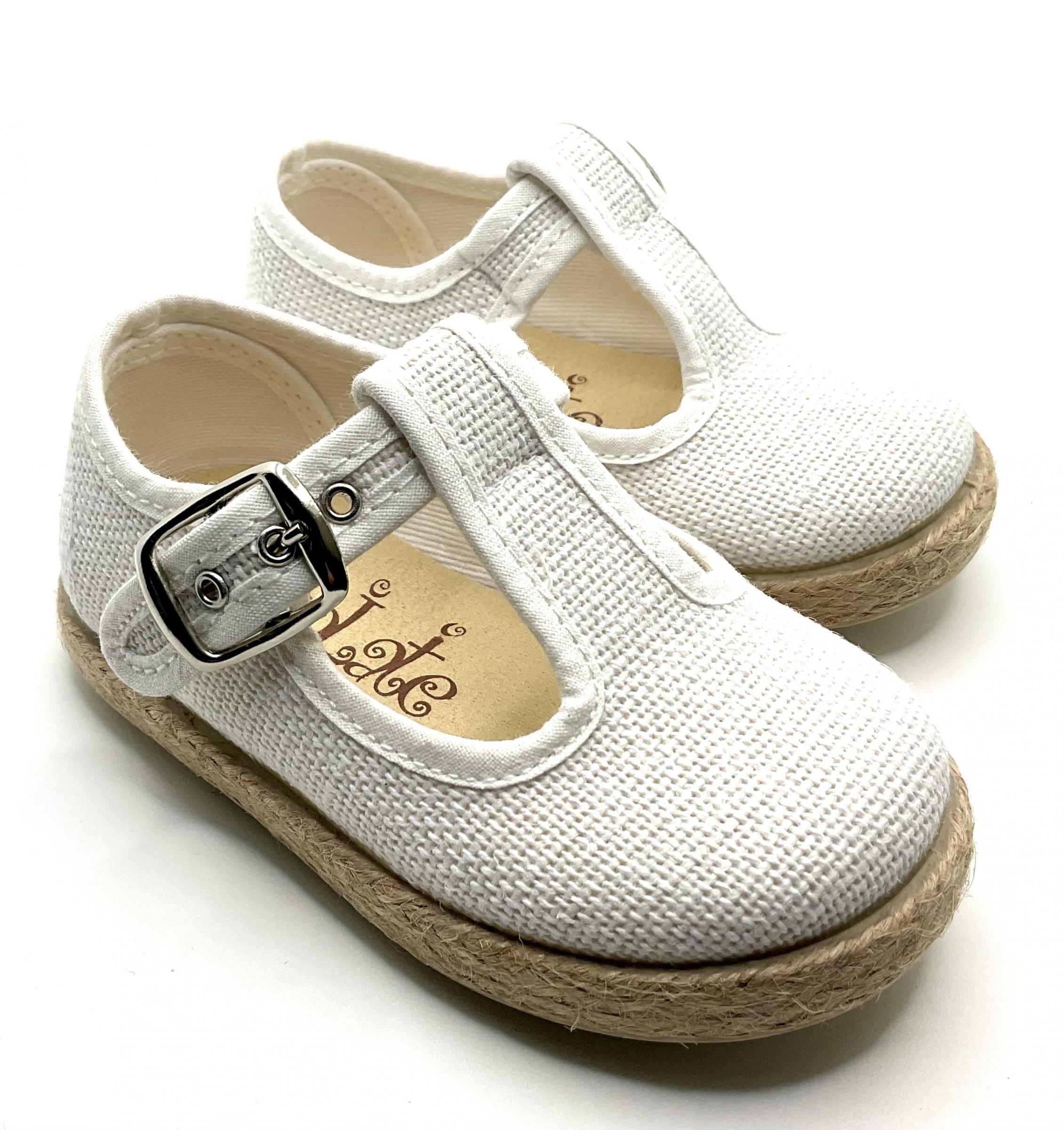 Pepito de De lino blanco, con piso de goma y embellecedor de esparto, se ajusta con hebilla, ligeros, lavables y flexibles.