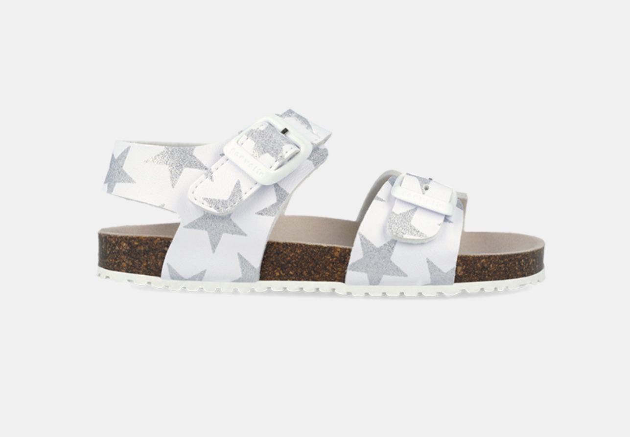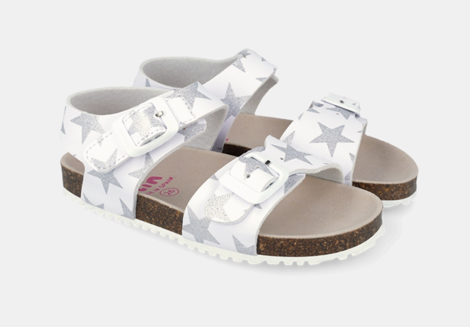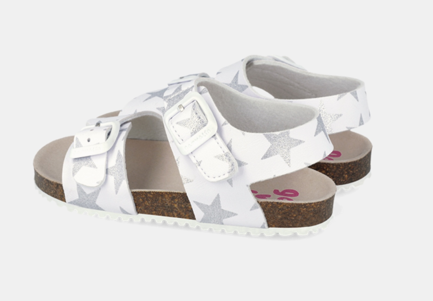 sandalia Con horma Bio, de la marca Garvalin, con piso de caucho y piel sintética blanca con estrellas plateadas de purpurina, ajuste con velcro adornado con hebillas.
