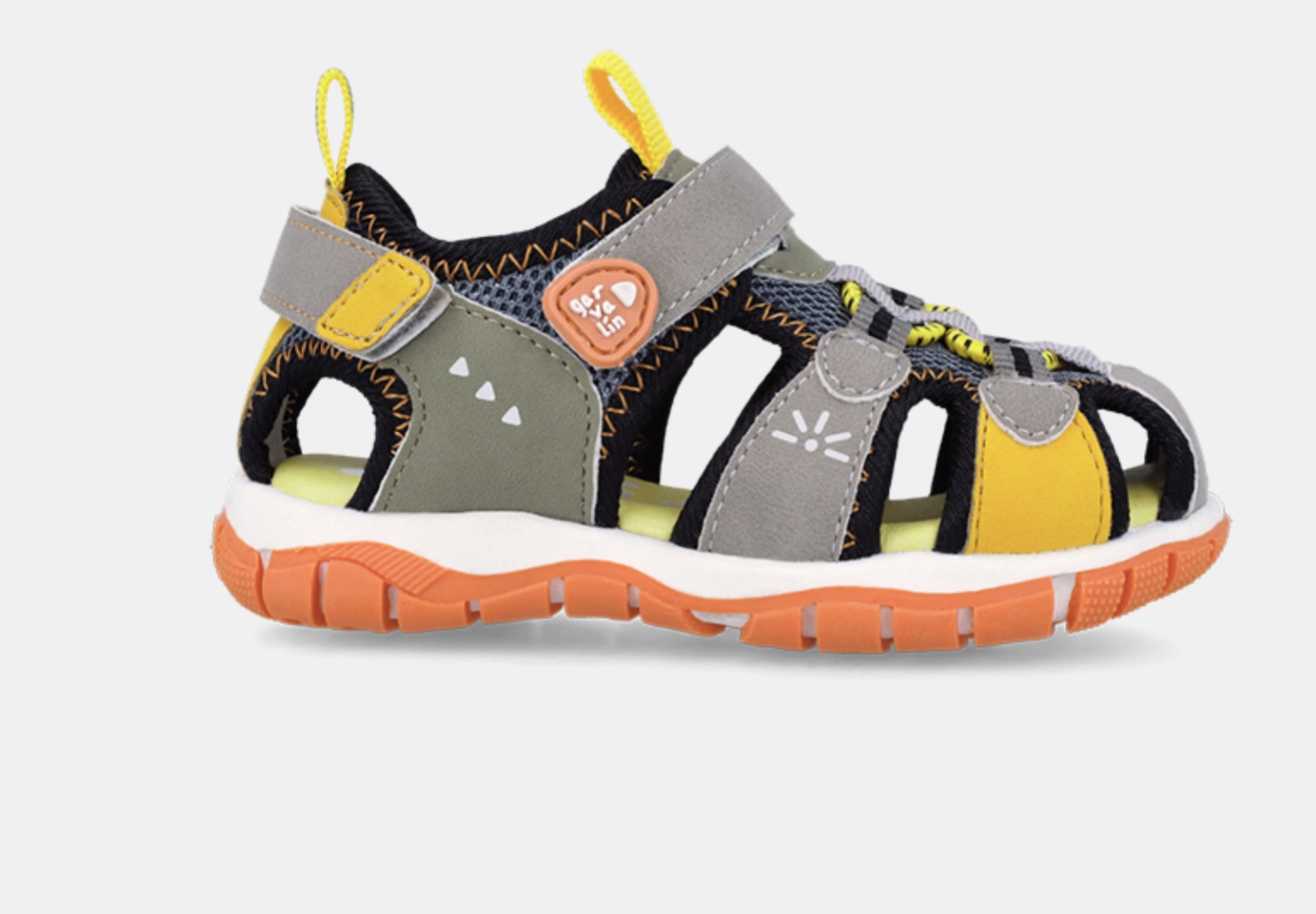 Sandalia trekking con una línea muy Sport para niño en tonos grises, verdes, caquis y amarillos muy flexible con puntera reforzada y ajuste con Velcro. Perfectas para campamentos y juegos al aire libre