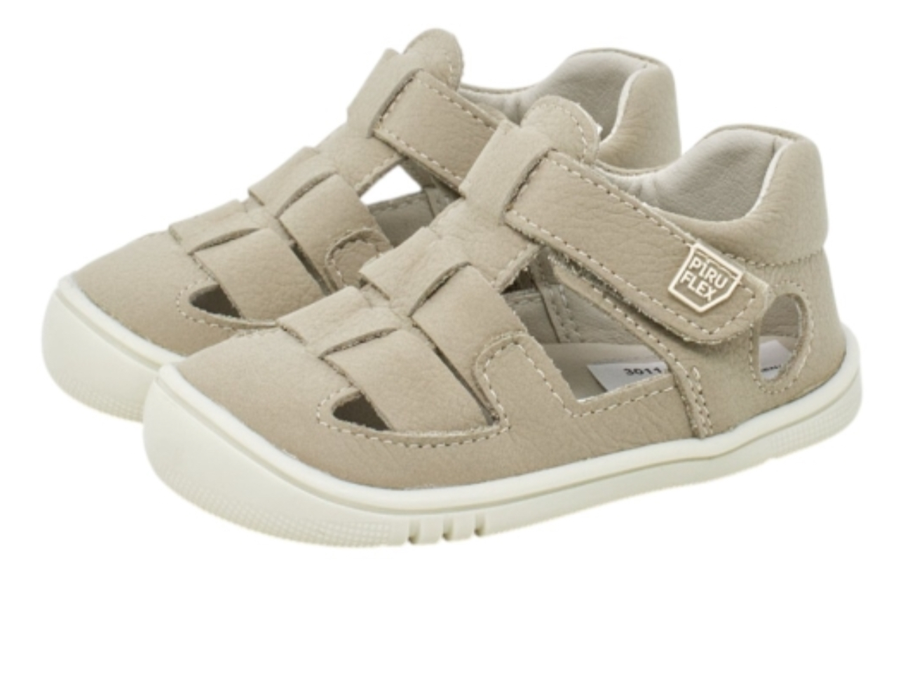 Sandalia tipo cangrejera de la marca Pirufin , completamente respetuosa, fabricada en piel natural de color piedra, ajuste con velcro muy ligera y muy flexible