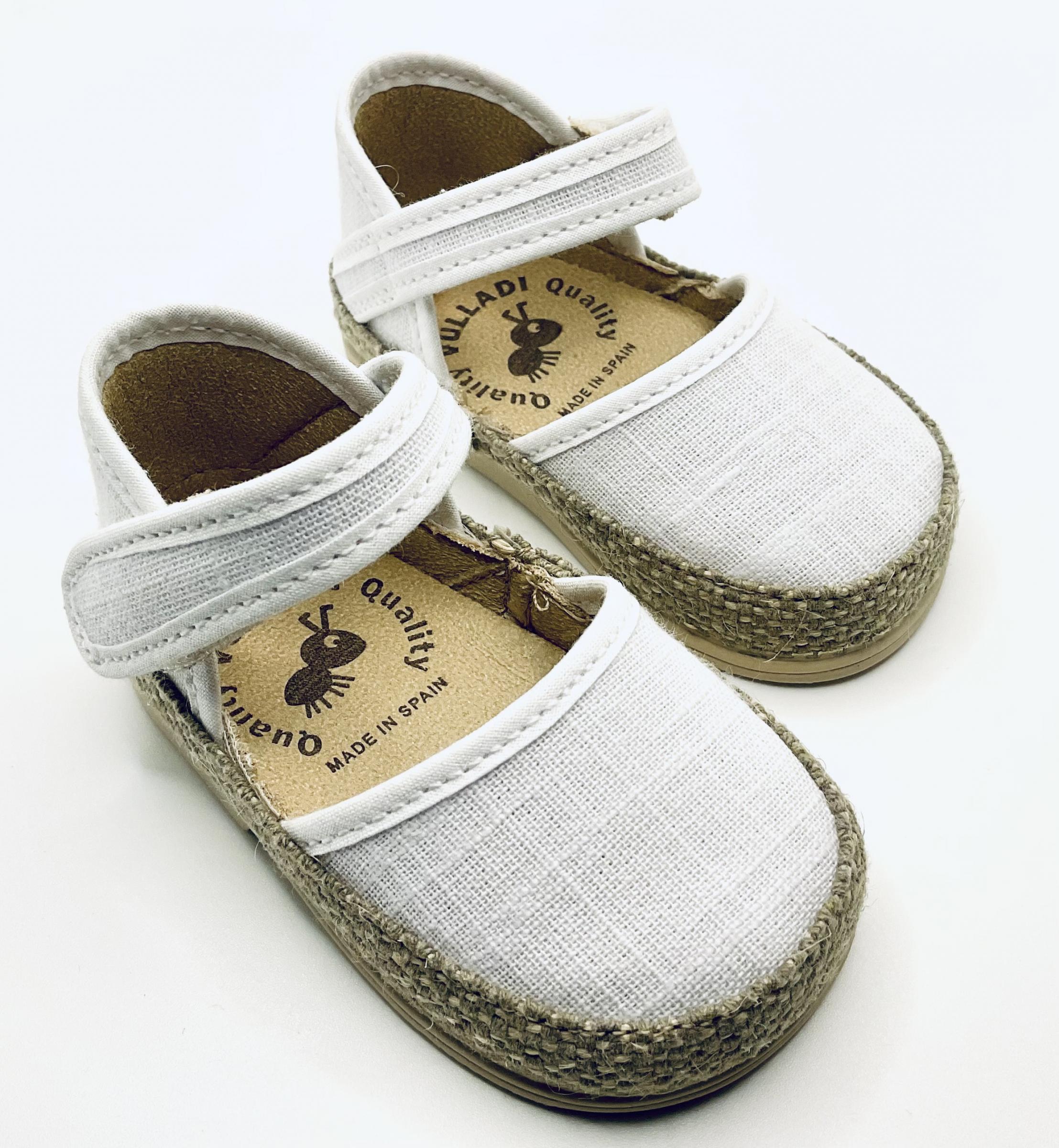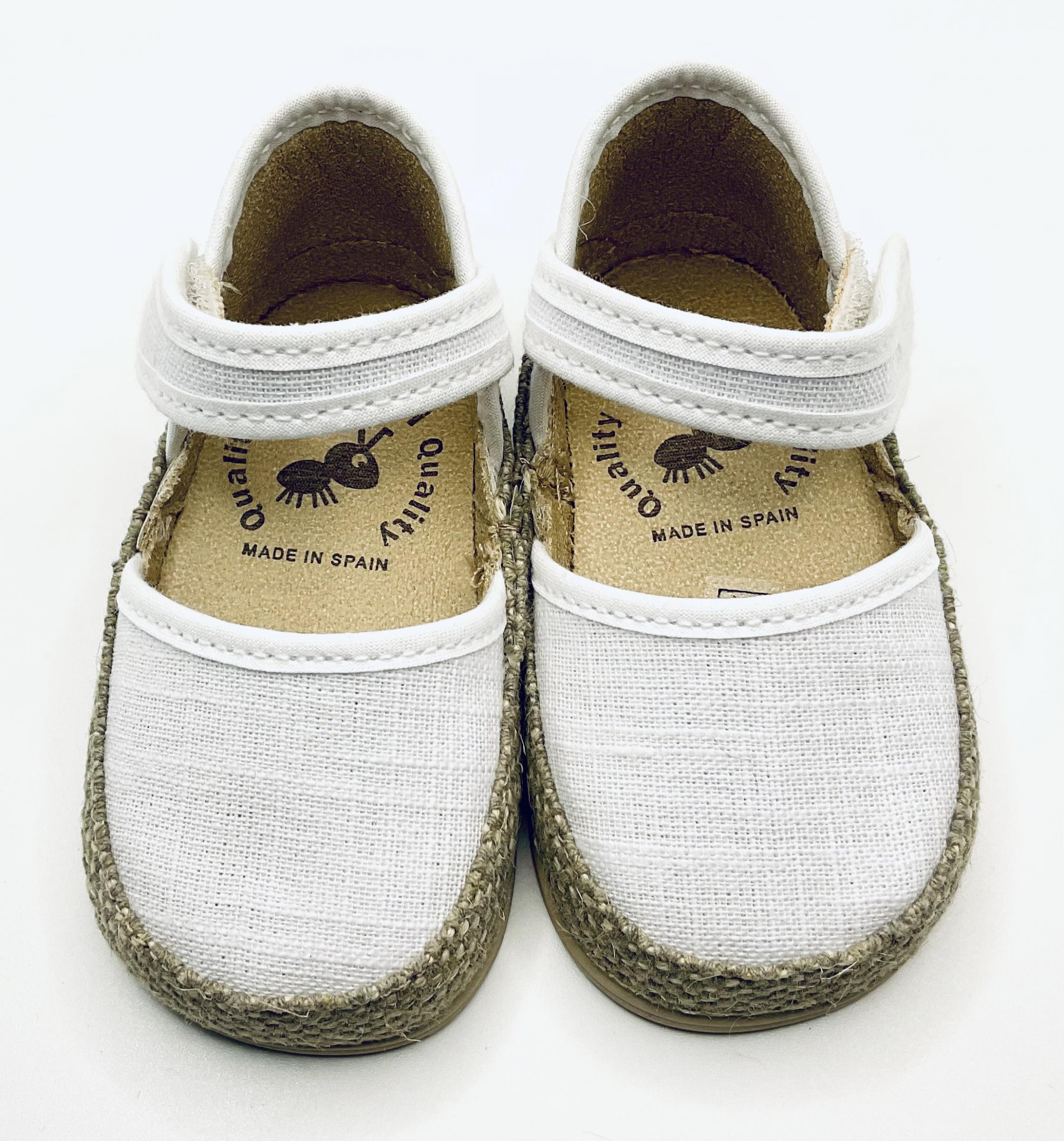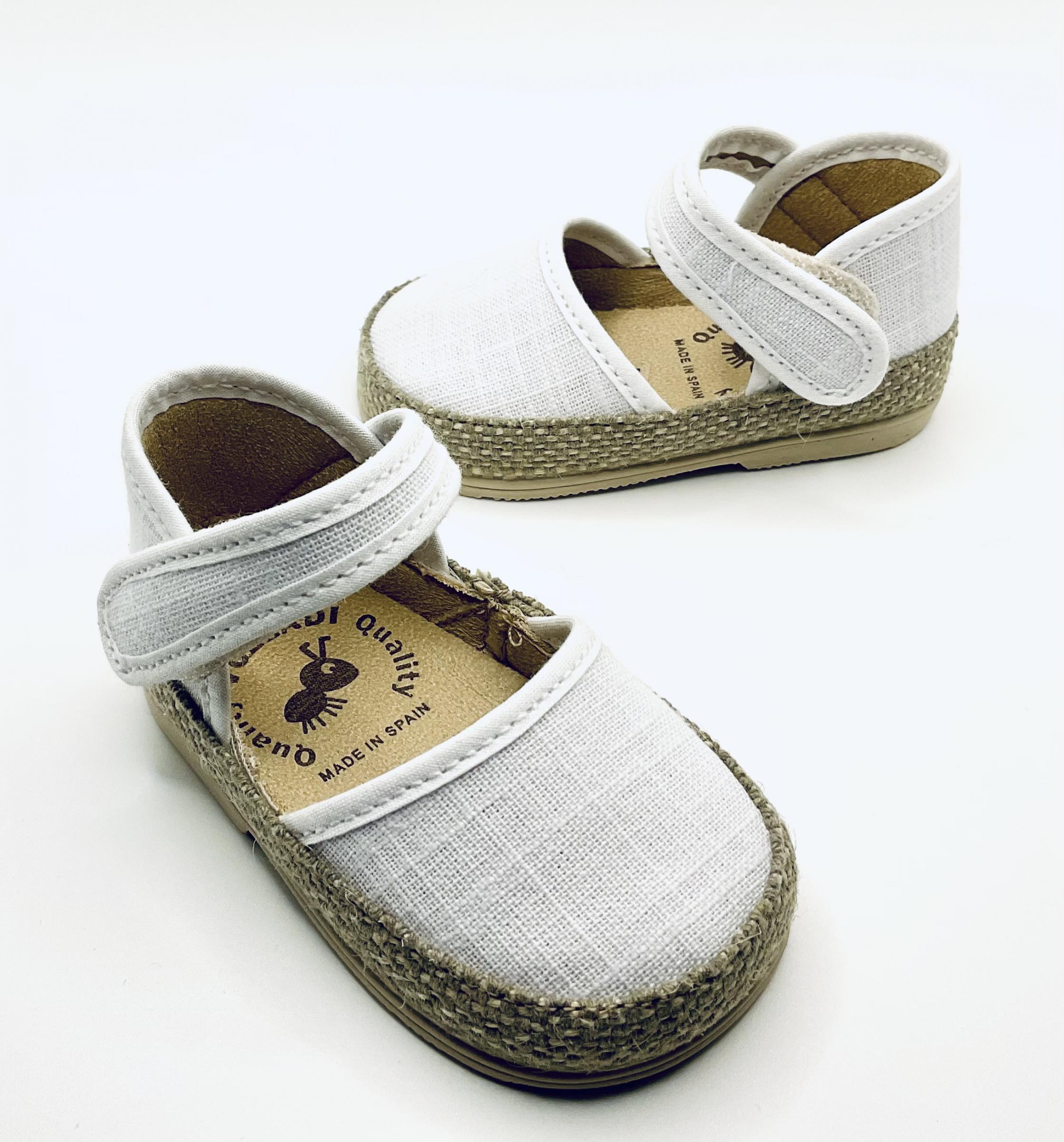 Merceditas de lino blanca con piso de goma y embellecedor de rafia, ajuste con velcro, muy ligeras y muy flexibles lavables en el lavadora. Horma, completamente respetuosa.