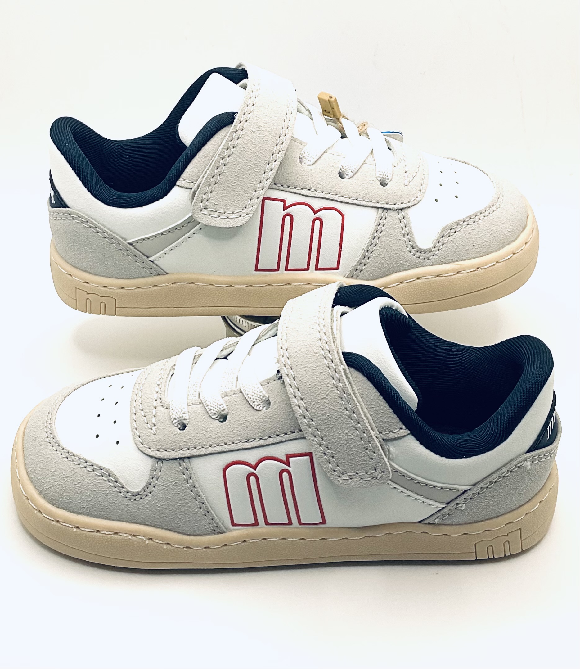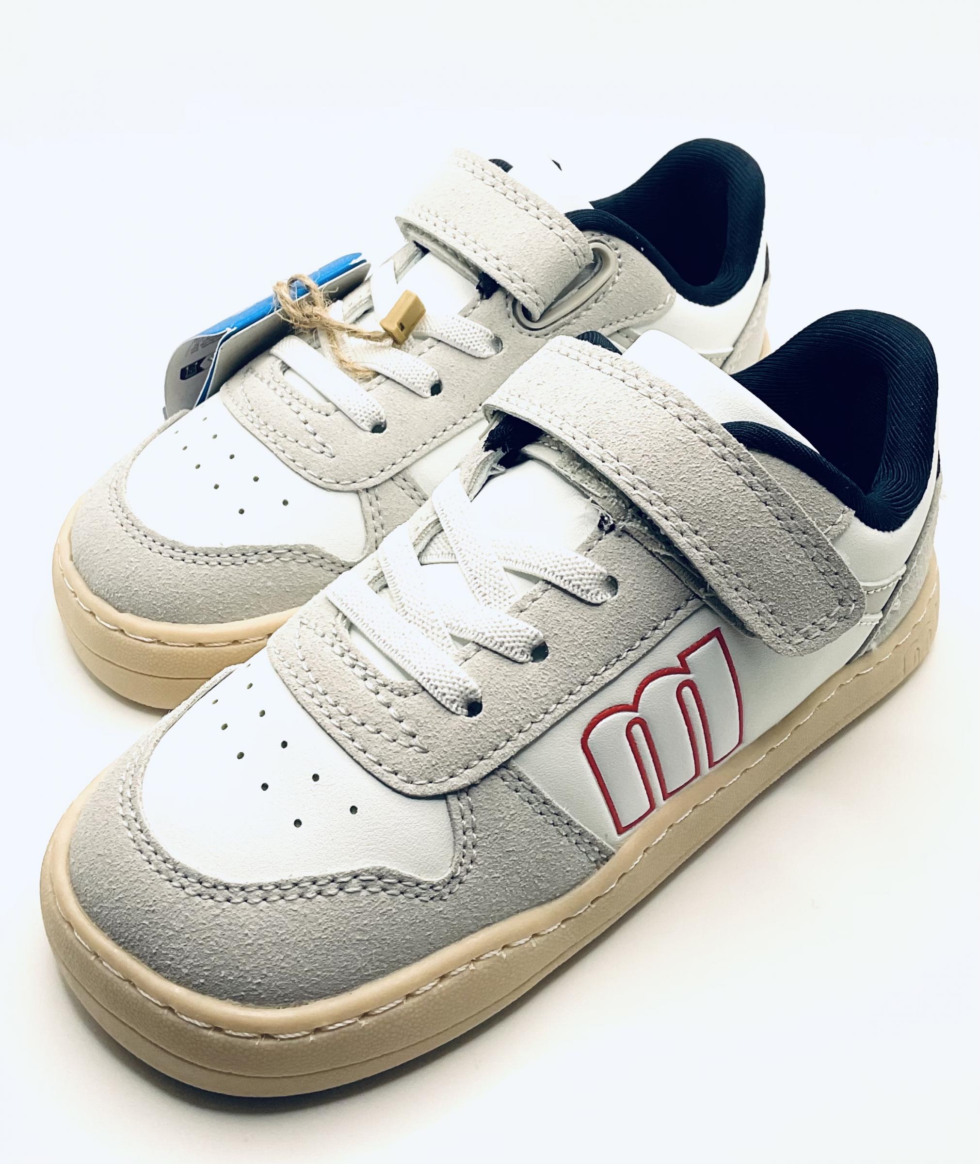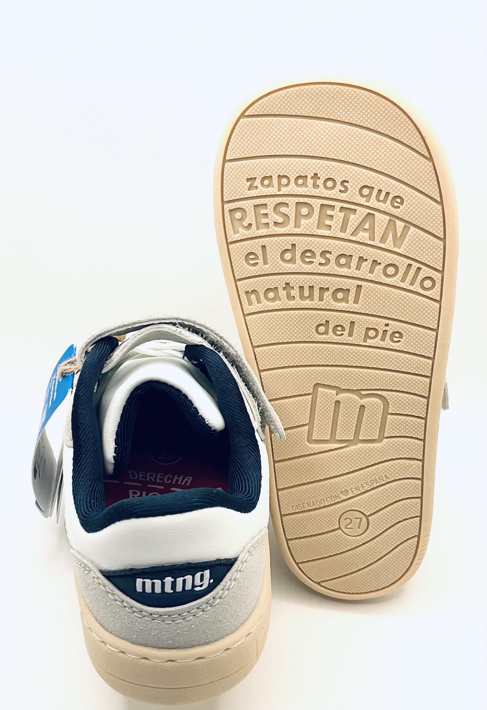 Deportivo Barefoot y respetuoso de la marca Mustang en color blanco, combinado con azul marino, cierre de Velcro, plantilla extraíble, sin contrafuertes, puntera ancha y redonda y con cordones elásticos