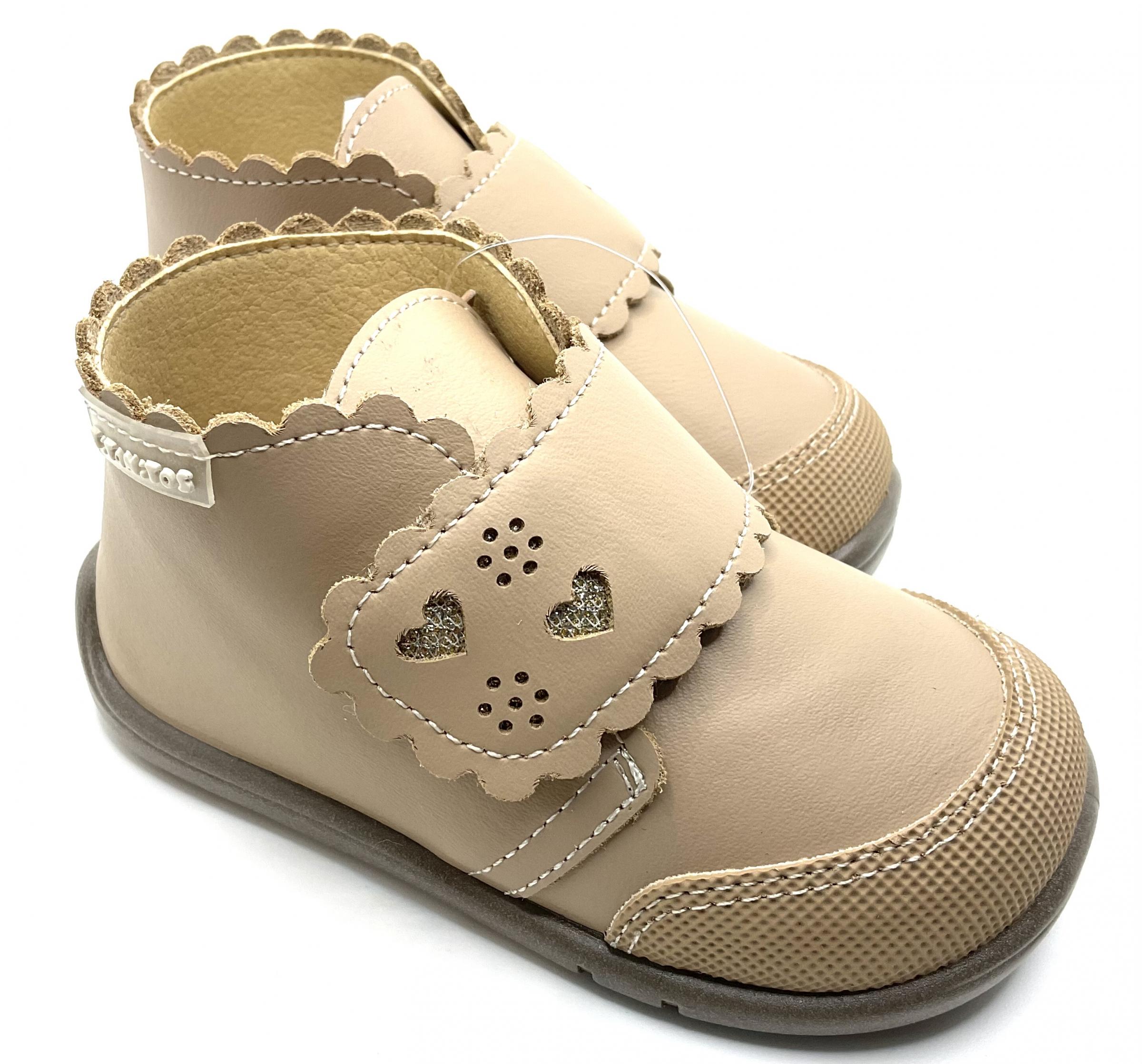 Botita de niña color camel con cierre de velcro decorado , puntera reforzada y fabricado en piel lavable.