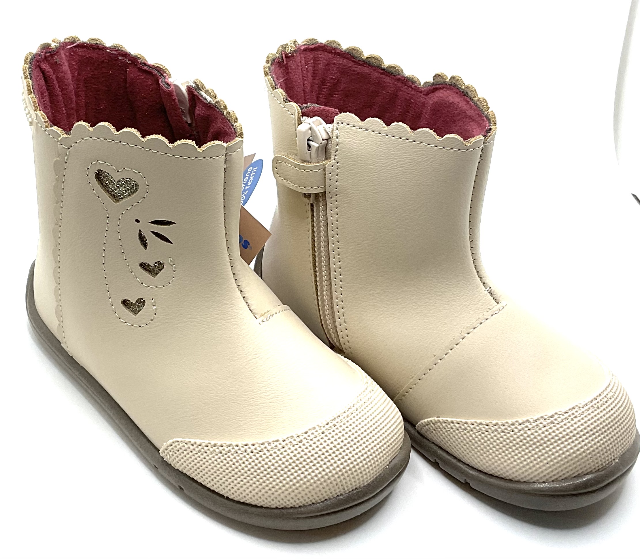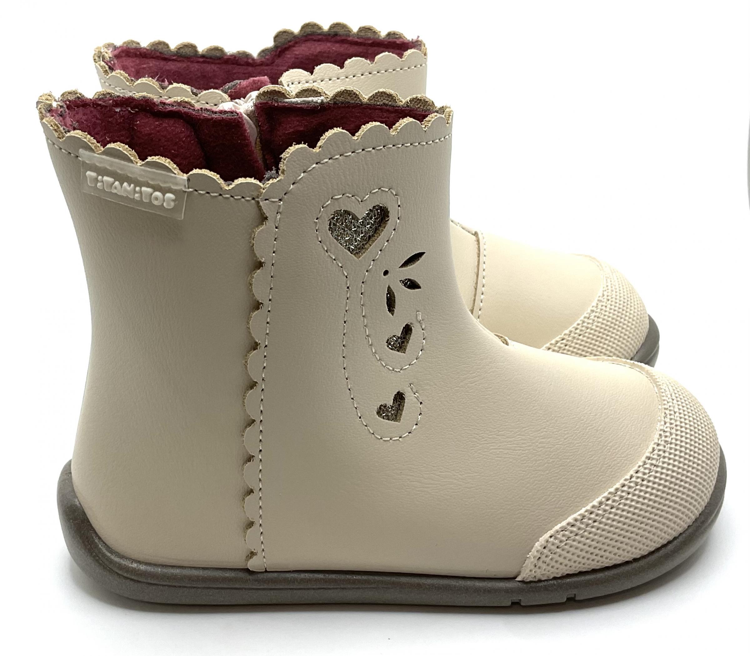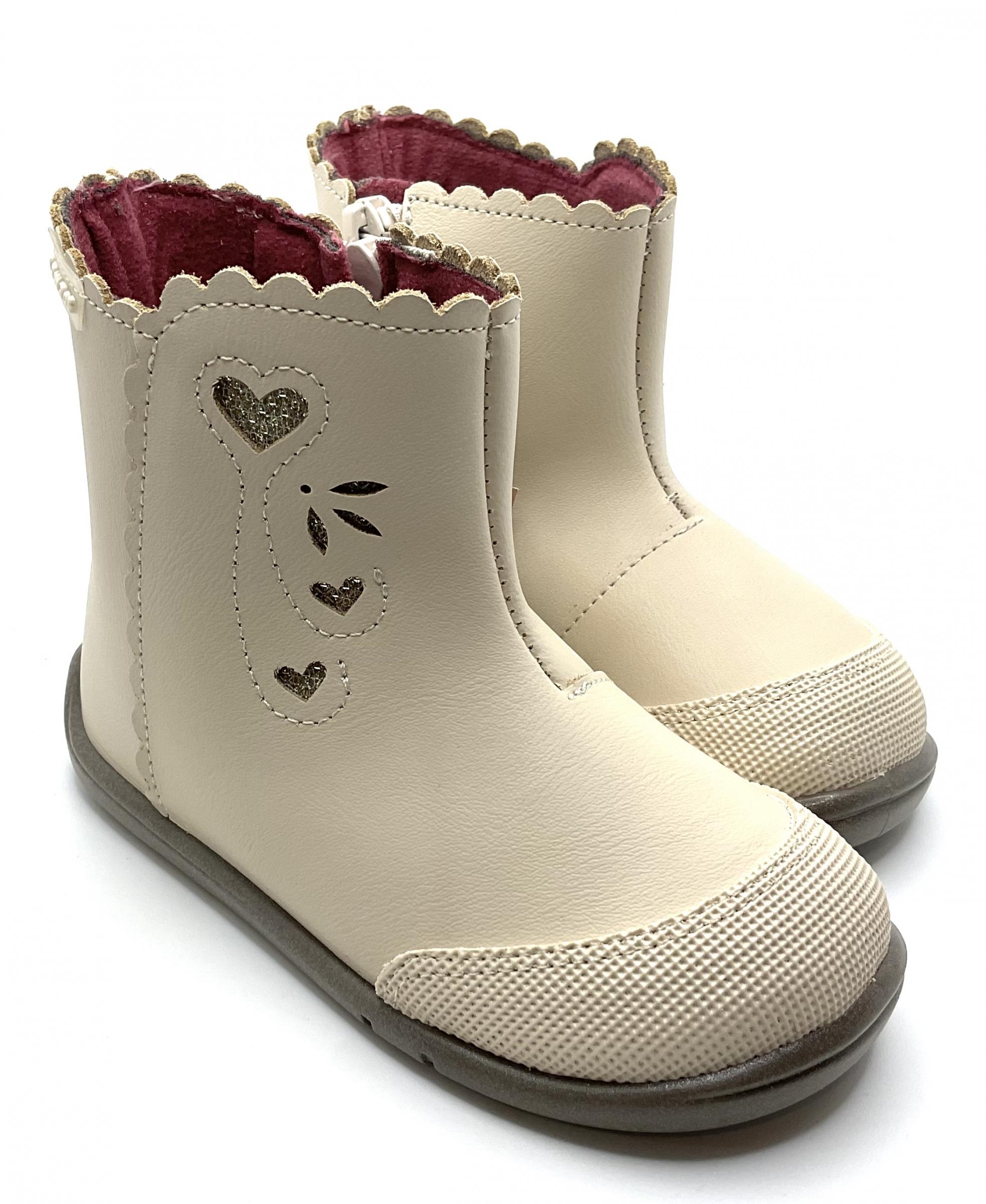 Bonito botín de niña con motivos florales en color beige, fabricado en piel lavable Con cierre de crenallera y puntera reforzada , horma respetuosa.