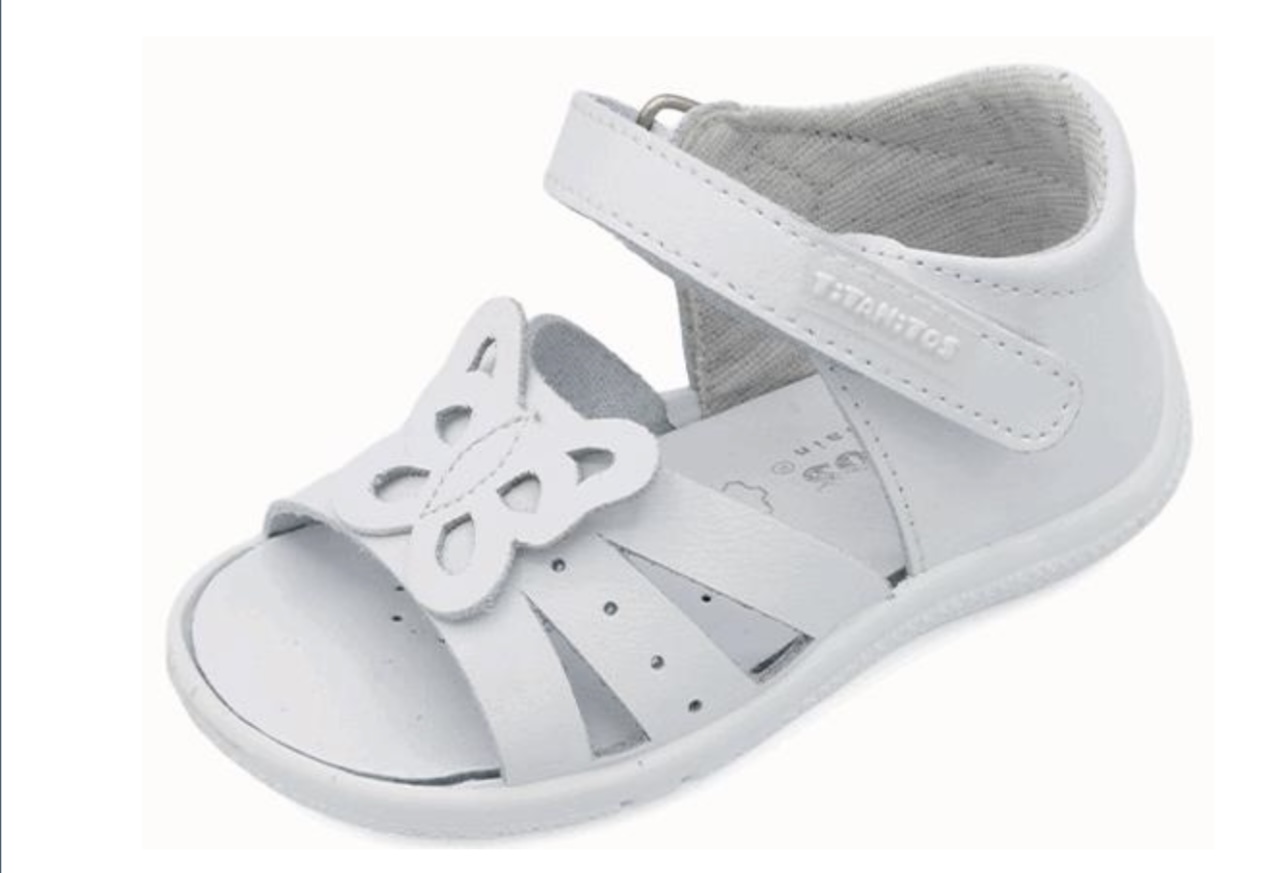 Sandalia de la marca (titanitos), fabricado en horma convencional en piel blanca, lavable con deditos al aire y mariposa de adorno sobre el empeine,, ajuste con Velcro,.