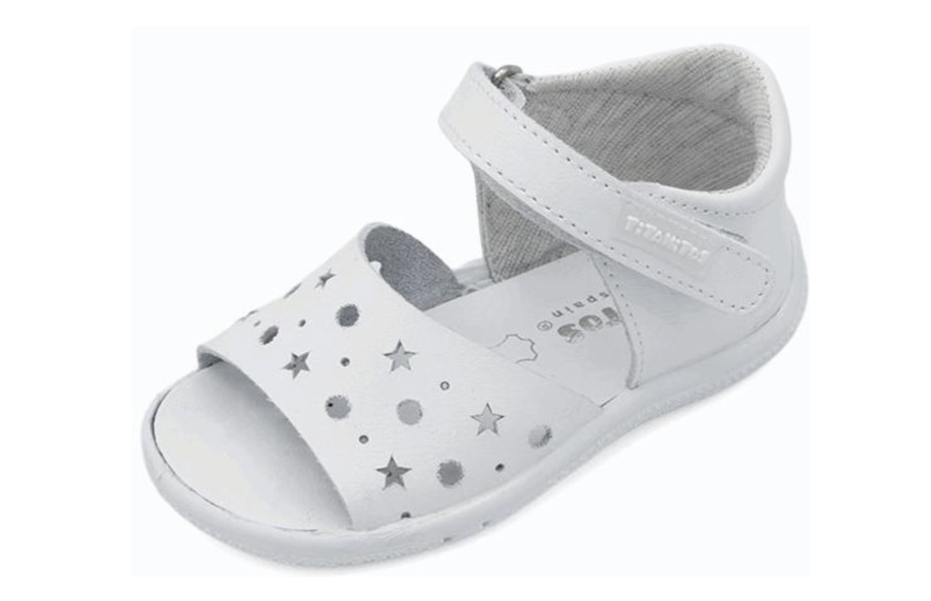 Sandalia fabricada por la marca Titanitos en piel lavable blanca con empeine perforado y Con Ajuste de velcro