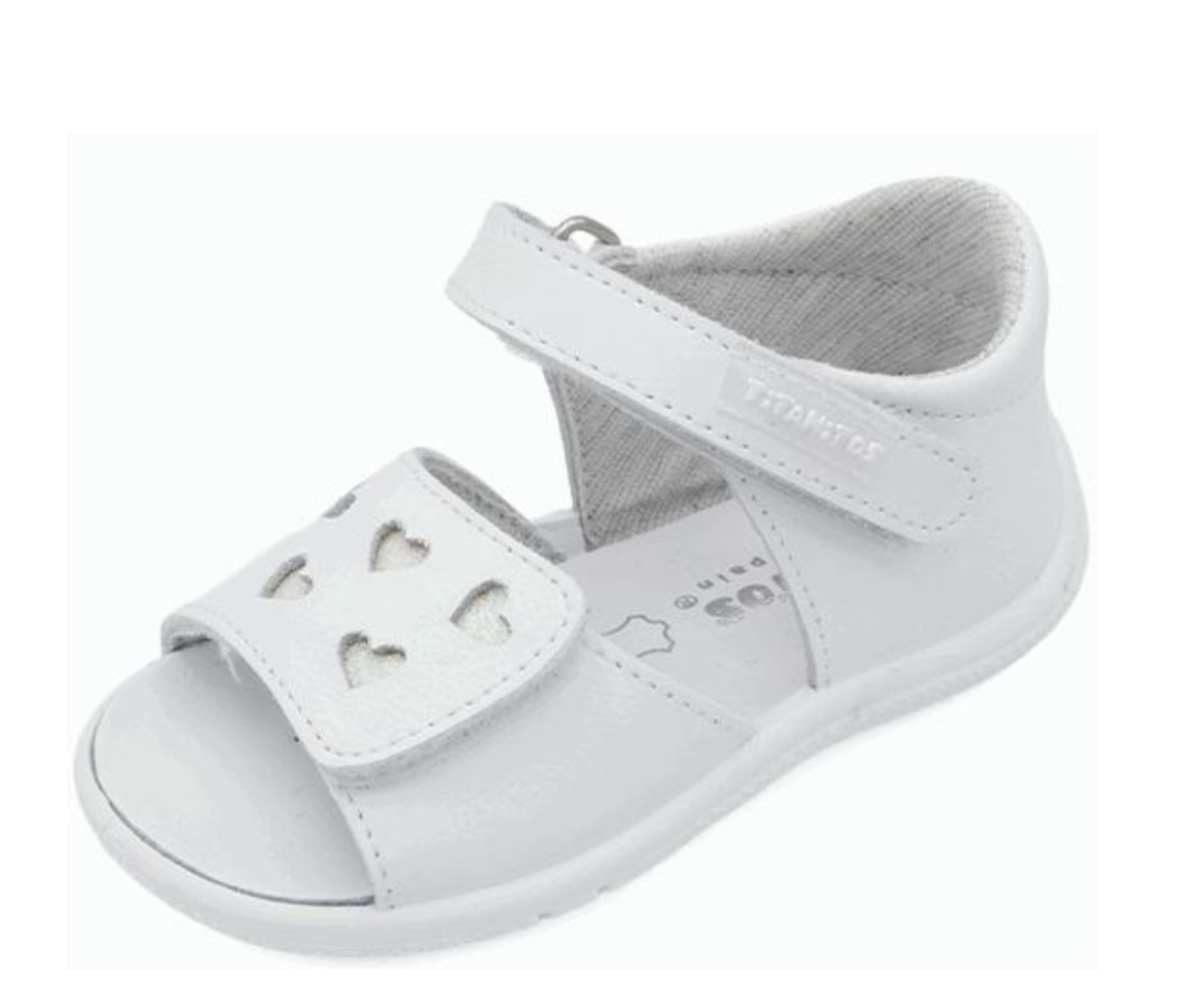 Sandalia de la marca Titanitos fabricado en piel blanca lavable, con una horma clásica Ajuste de velcro tanto en el empeine que va adornado con corazoncitos como en el talón?