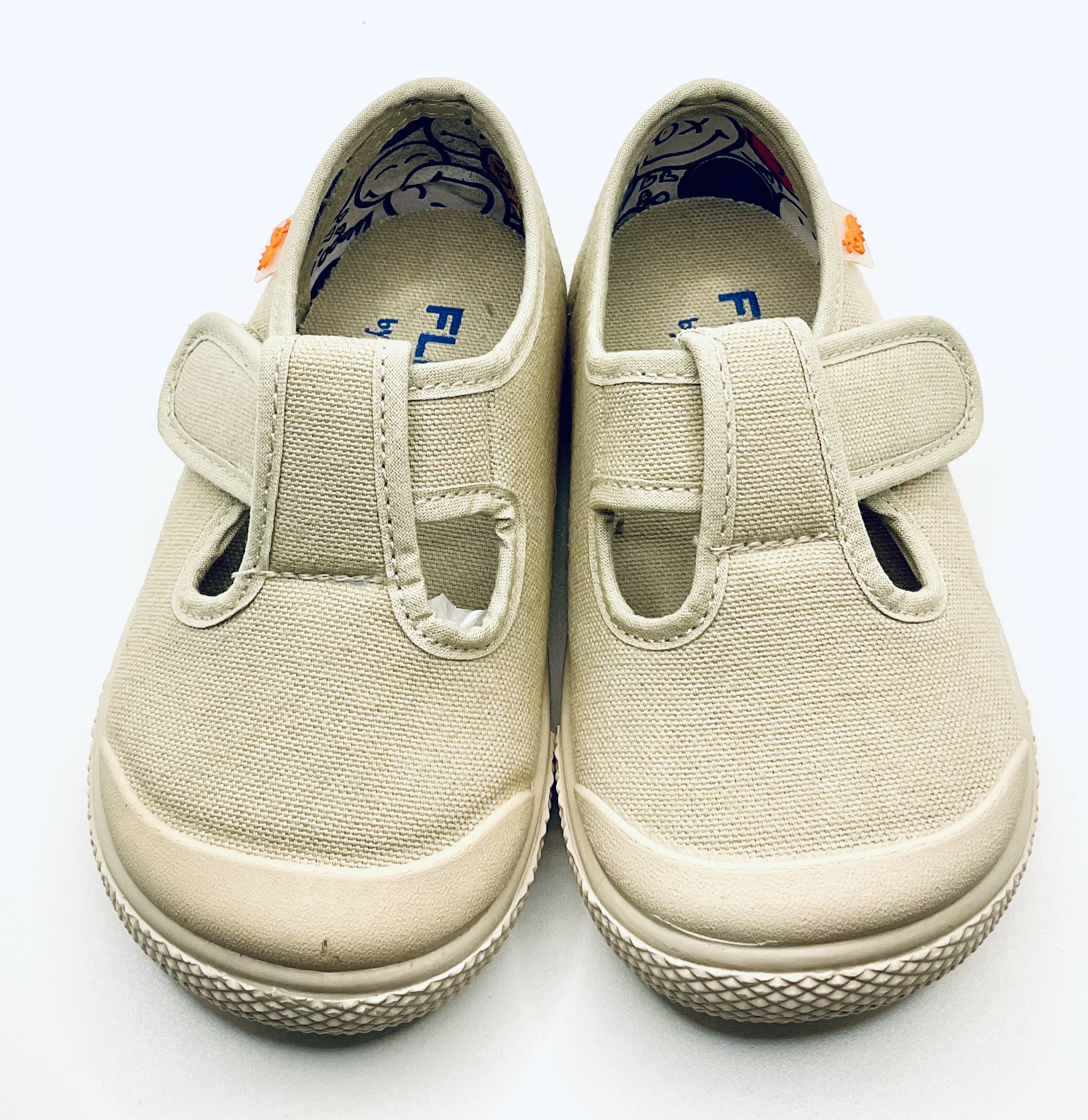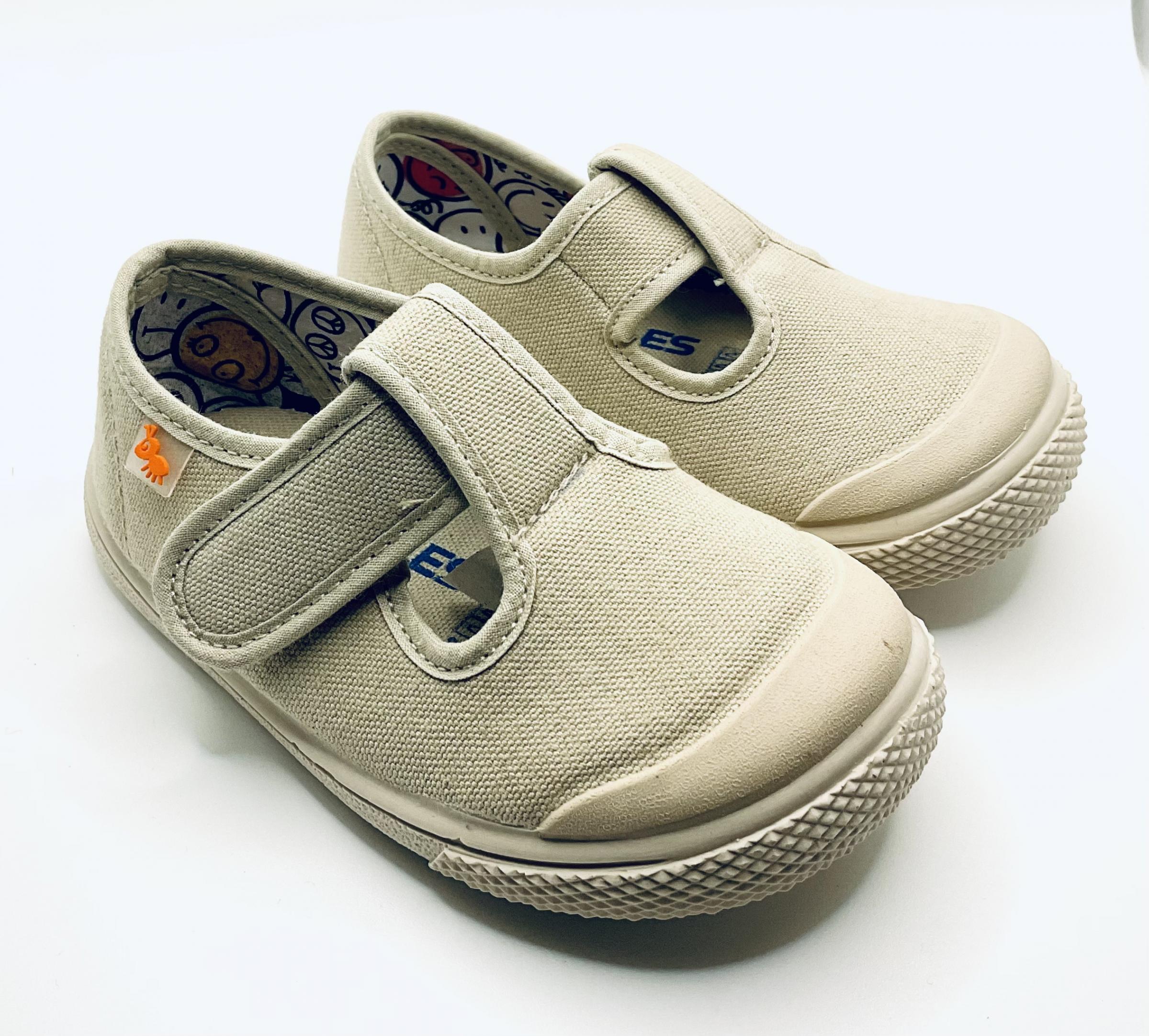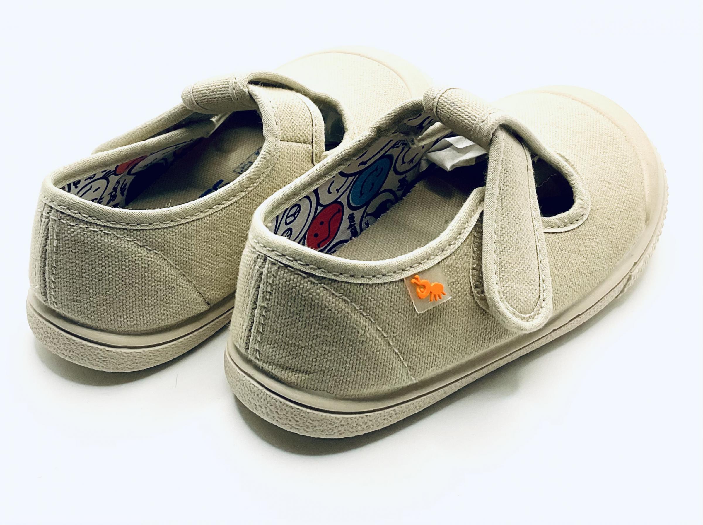 Pepito de línea causal con puntera reforzada y ajuste de Velcro . Fabricado en lona de color beis tostado. Horma Barefoot totalmente respetuosa. Se pueden lavar en lavadora, son muy ligeros y muy flexibles .