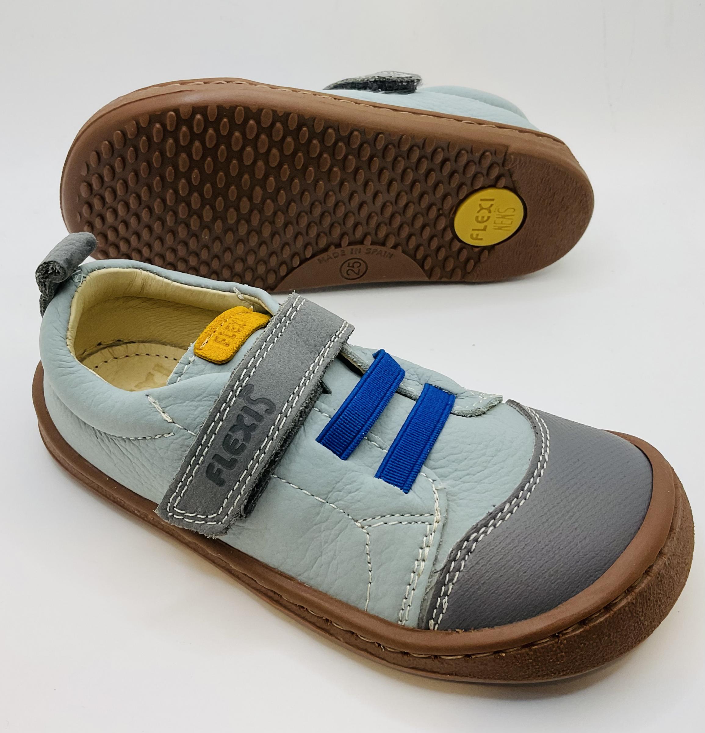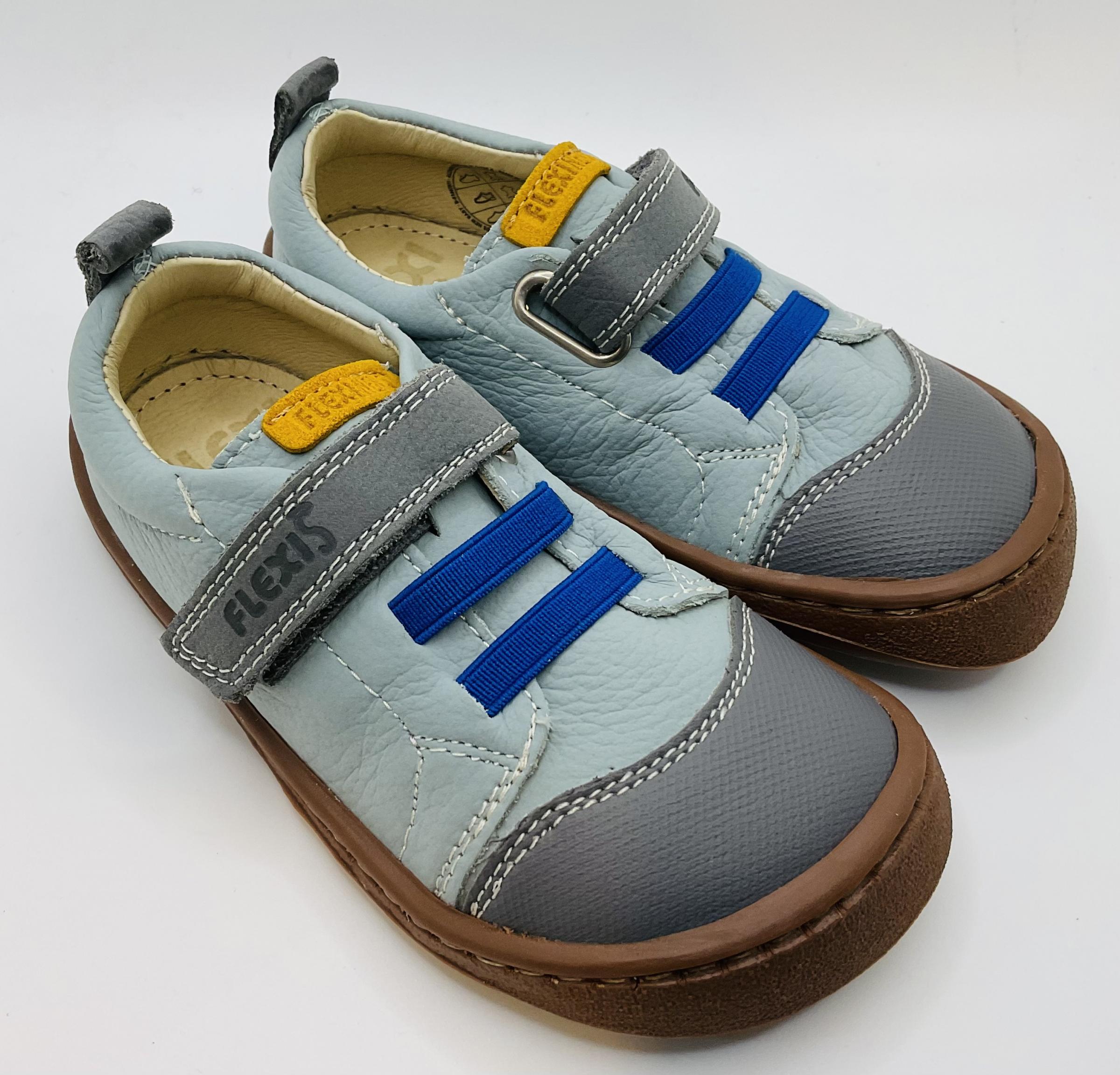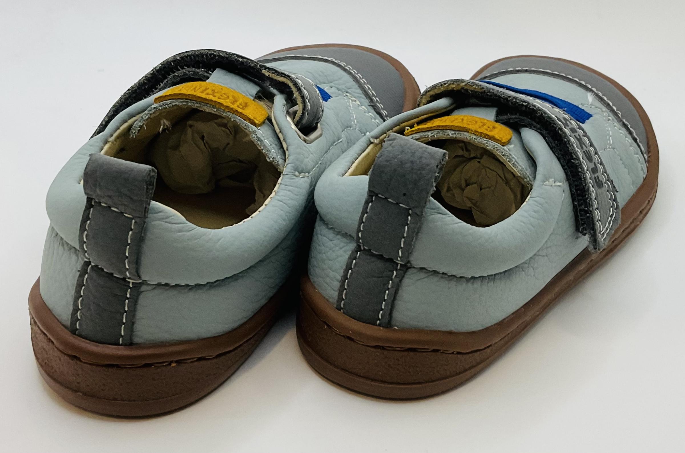 Zapato de niño, fabricado en piel, cierre en Velcro y cordones elásticos., horma Barefoot, ligeros, respetuosos y flexibles, color azul océano combinado con gris marengo, punteras reforzadas .