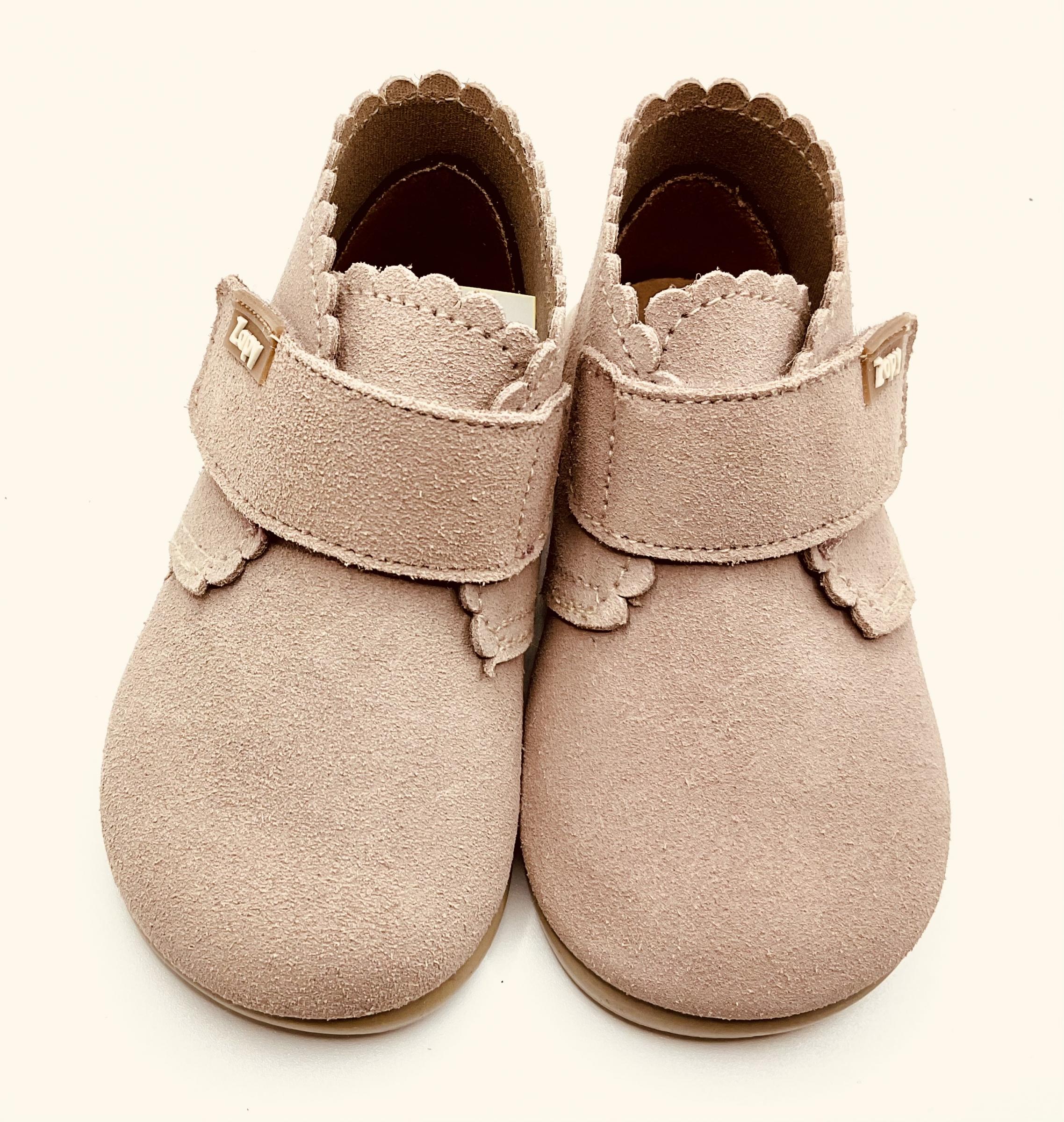 Botín de serraje rosa nude , con cierre de velcro , ligero y muy flexible , sin contrafuerte y con plantilla extraible