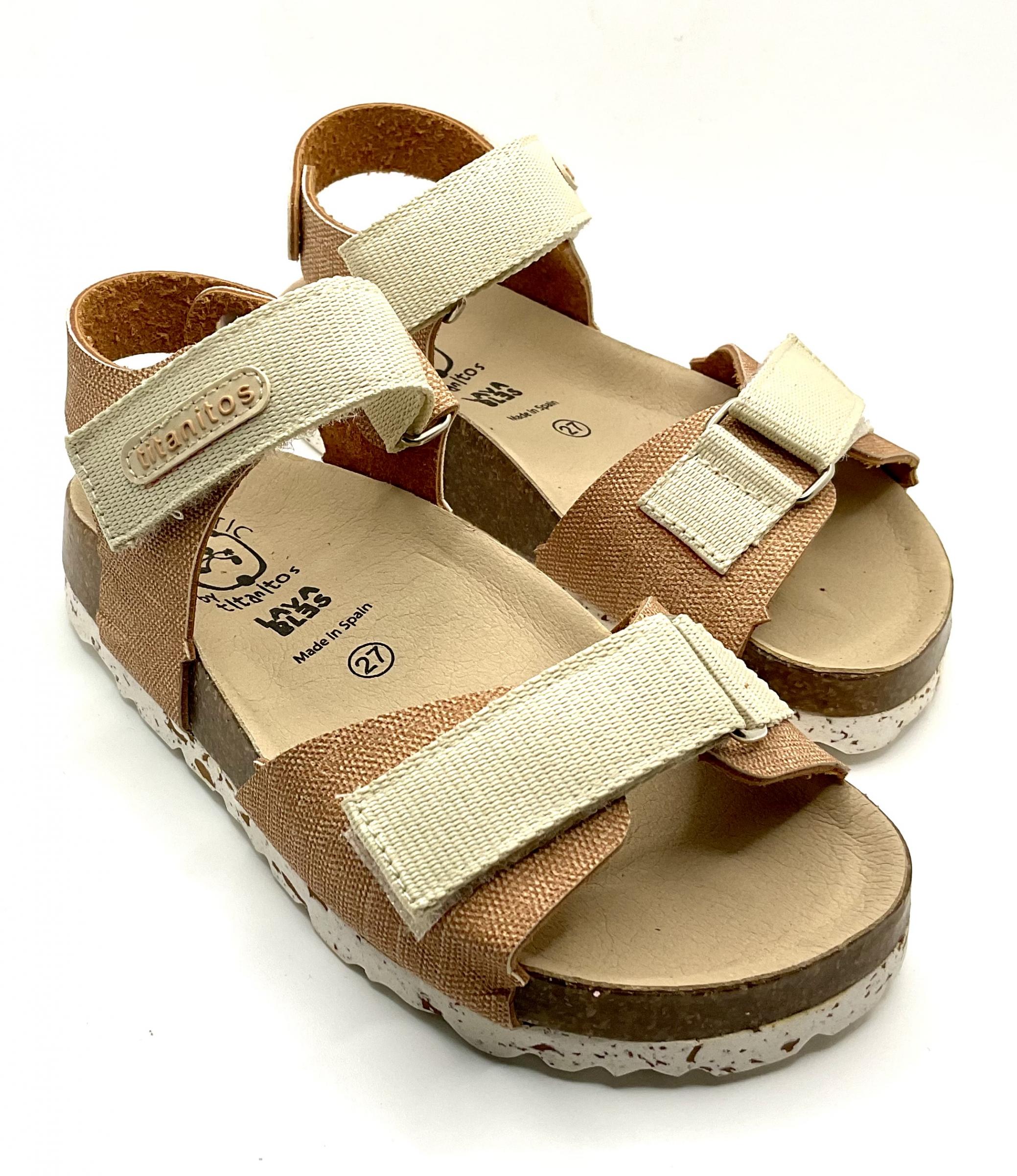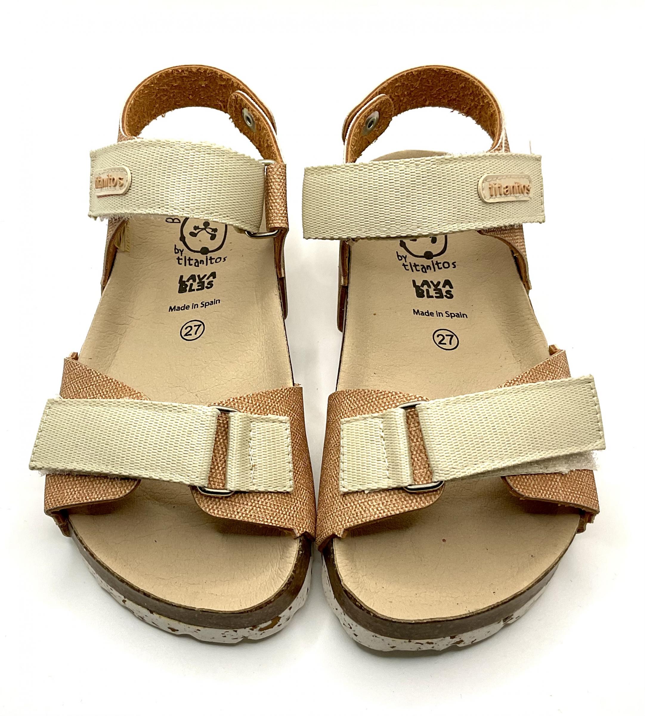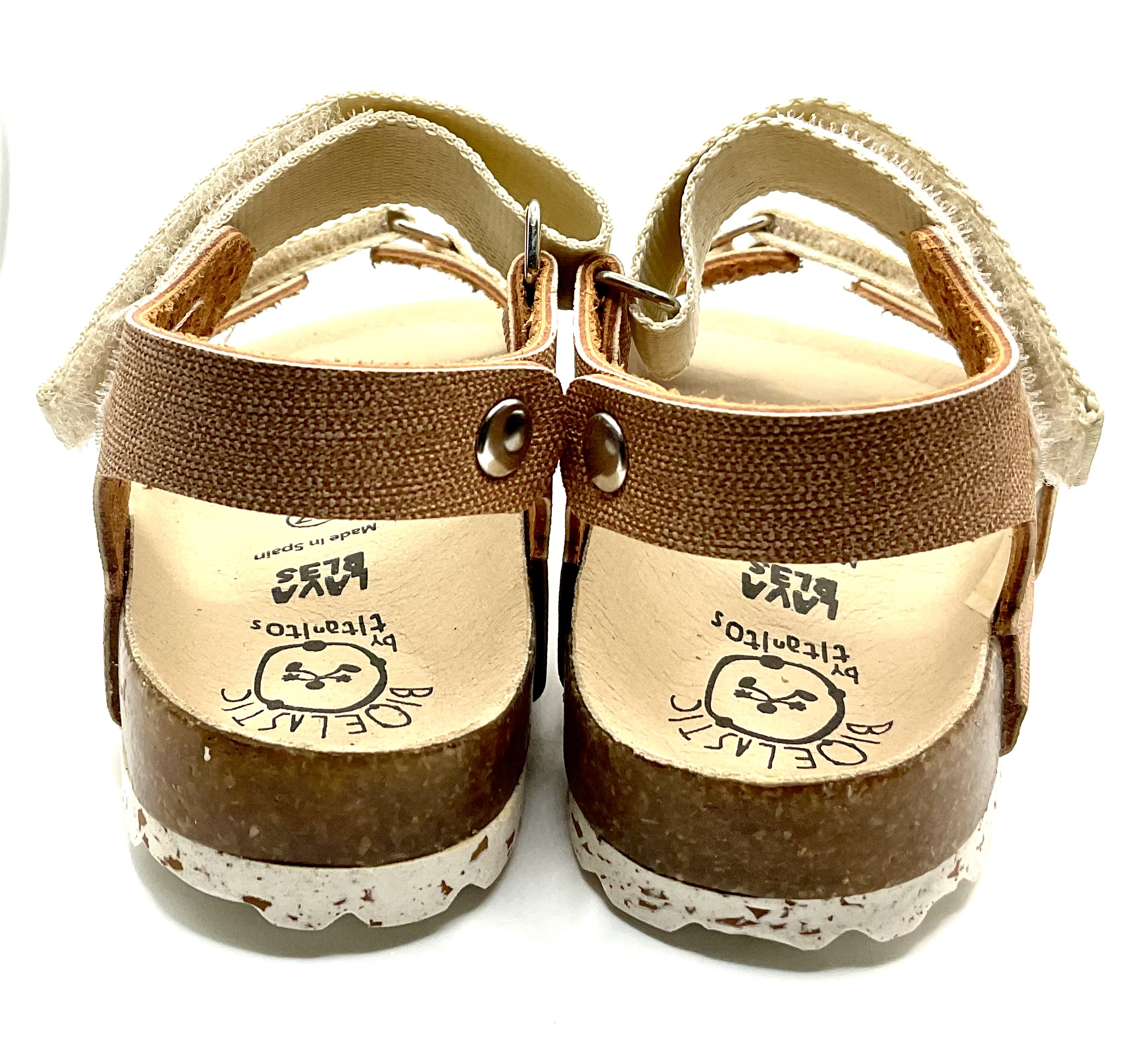 Sandalia con piso bio gel, muy ligero y flexible, fabricado por Titanitos,, ajusta con doble velcro combinando el color cuero con el color hielo