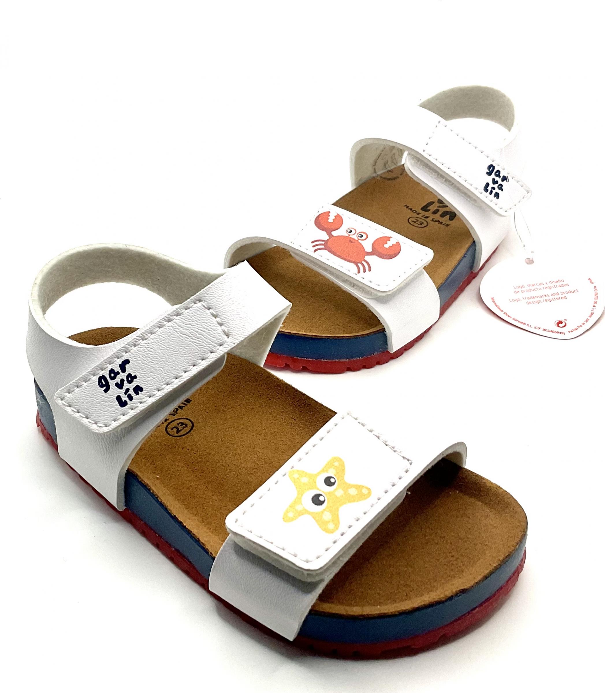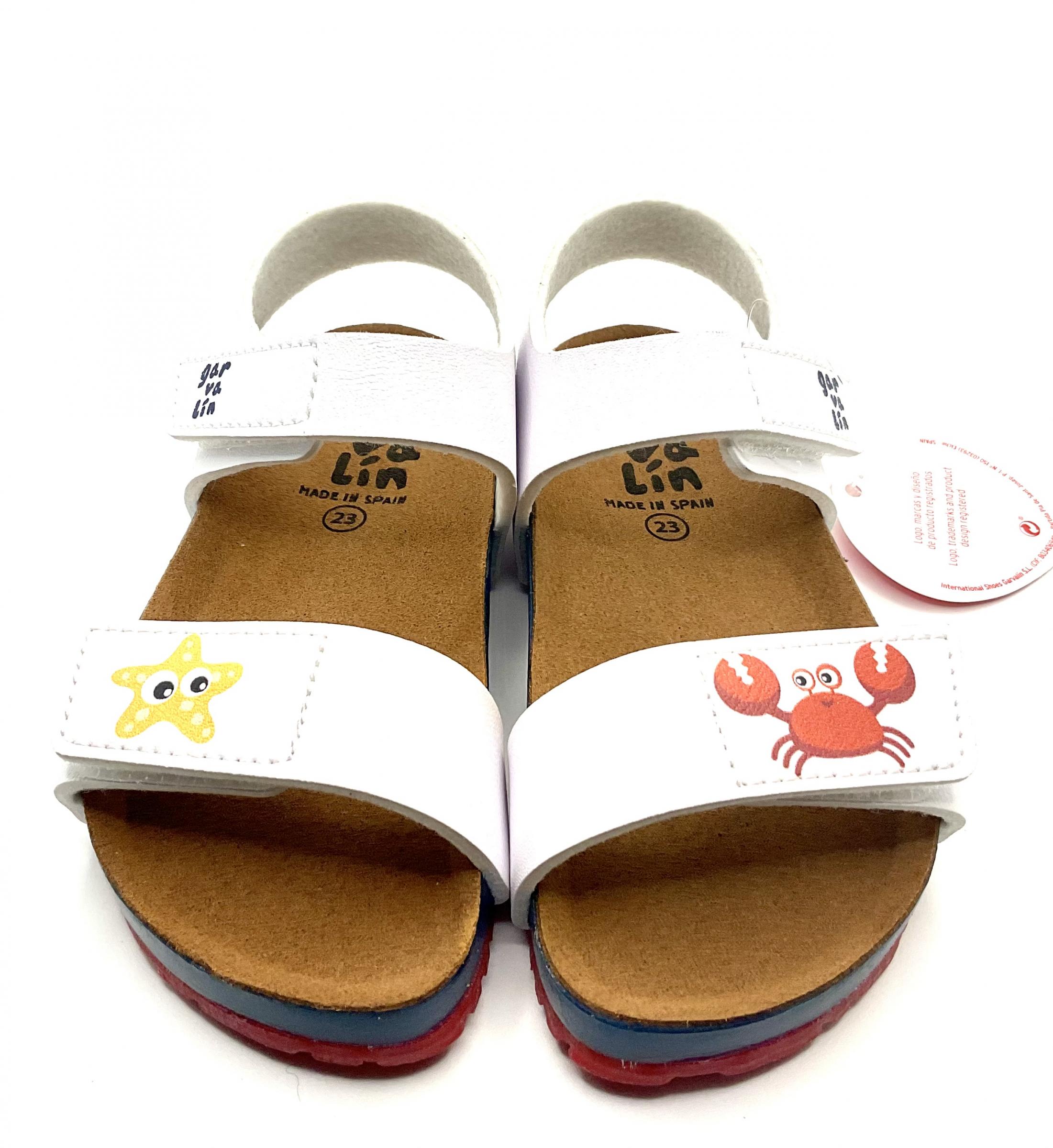 Un Twist de sandalias Bio con Cangrejito y estrellita, En color blanco, con ajuste de velcro ,ligero y muy flexible.