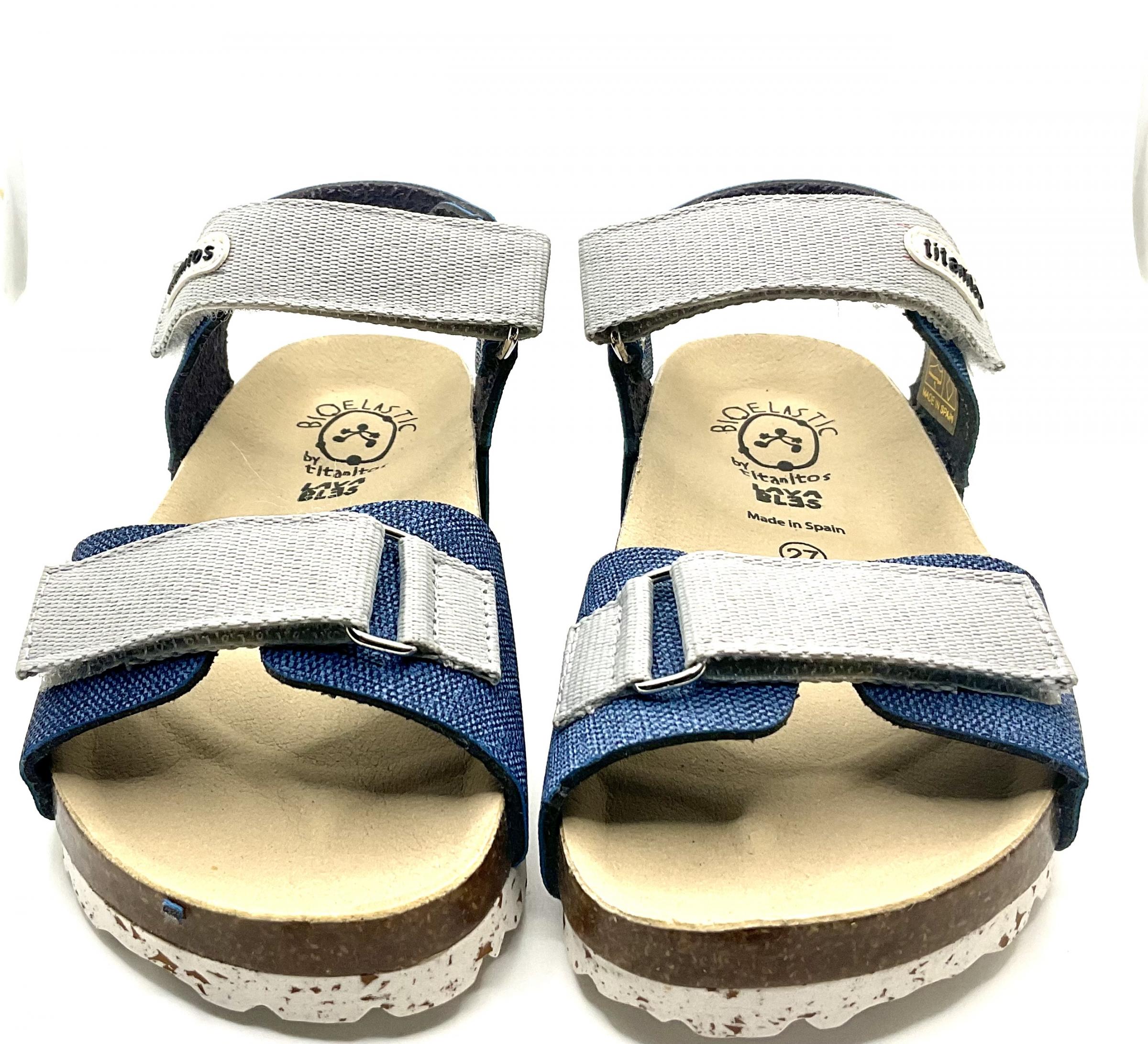 Sandalia con horma Bio de la marca (titanitos), que combina el color jeans con el gris claro ,ajuste con doble velcro piso antideslizante ,muy ligeras ,no pesan nada.
