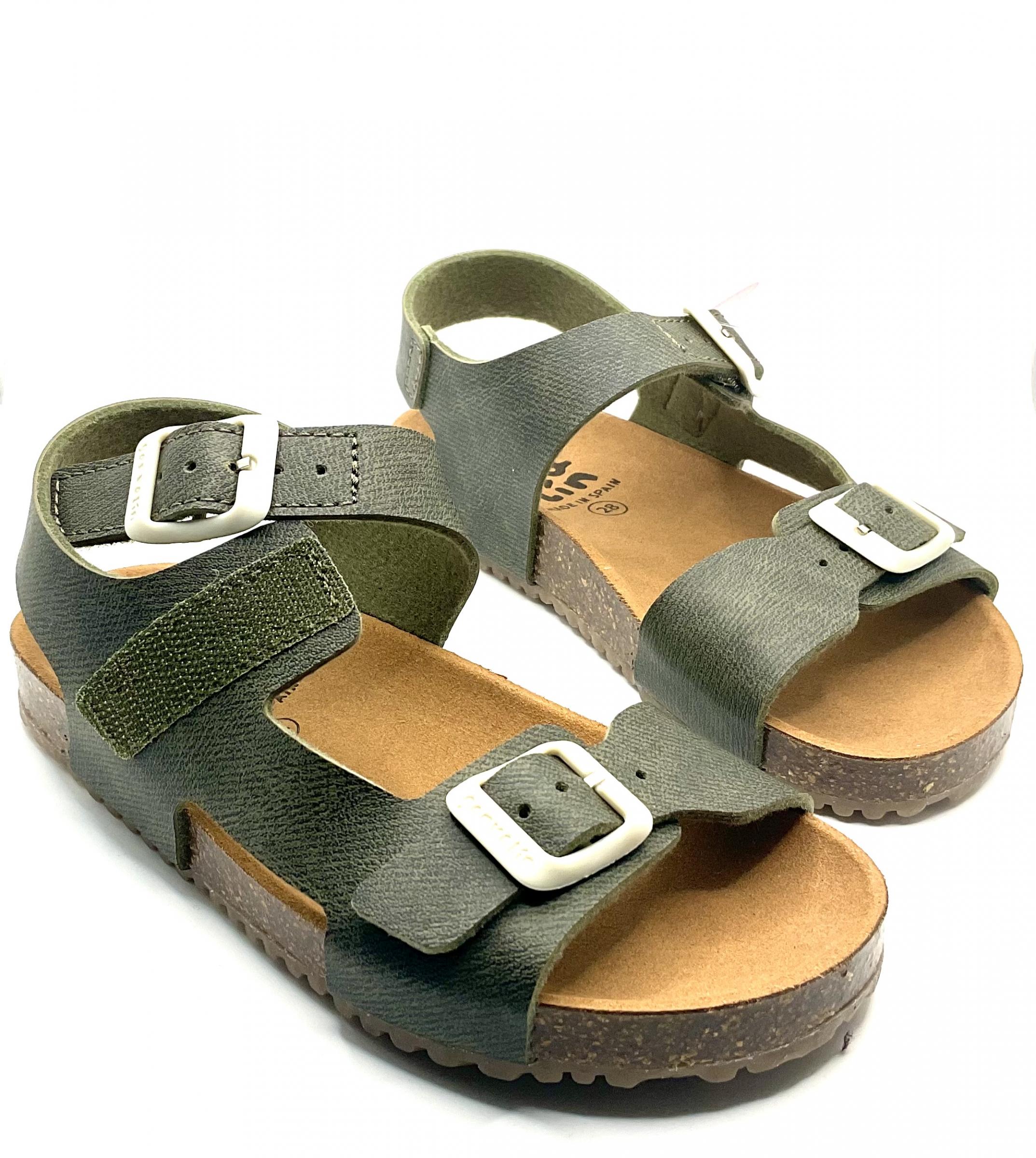 Sandalia, con piso BIO de la marca Garvalin en color verde militar , muy ligeras, con ajuste de Velcro En el metatarso y adorno de hebilla