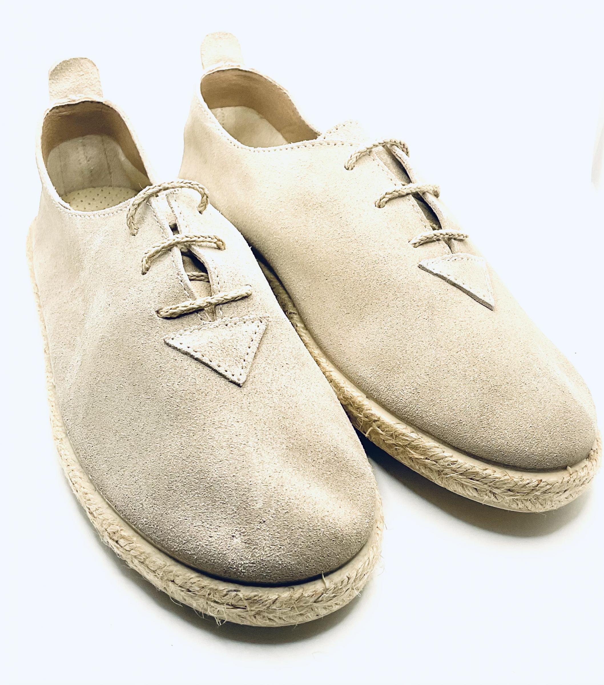 Blucher fabricado en piel de serraje en color beigs ,ajuste con cordones de cáñamo , fabricado con piso piso de goma y rematado con embellecedor de esparto , ideal para niños de primera comunión .