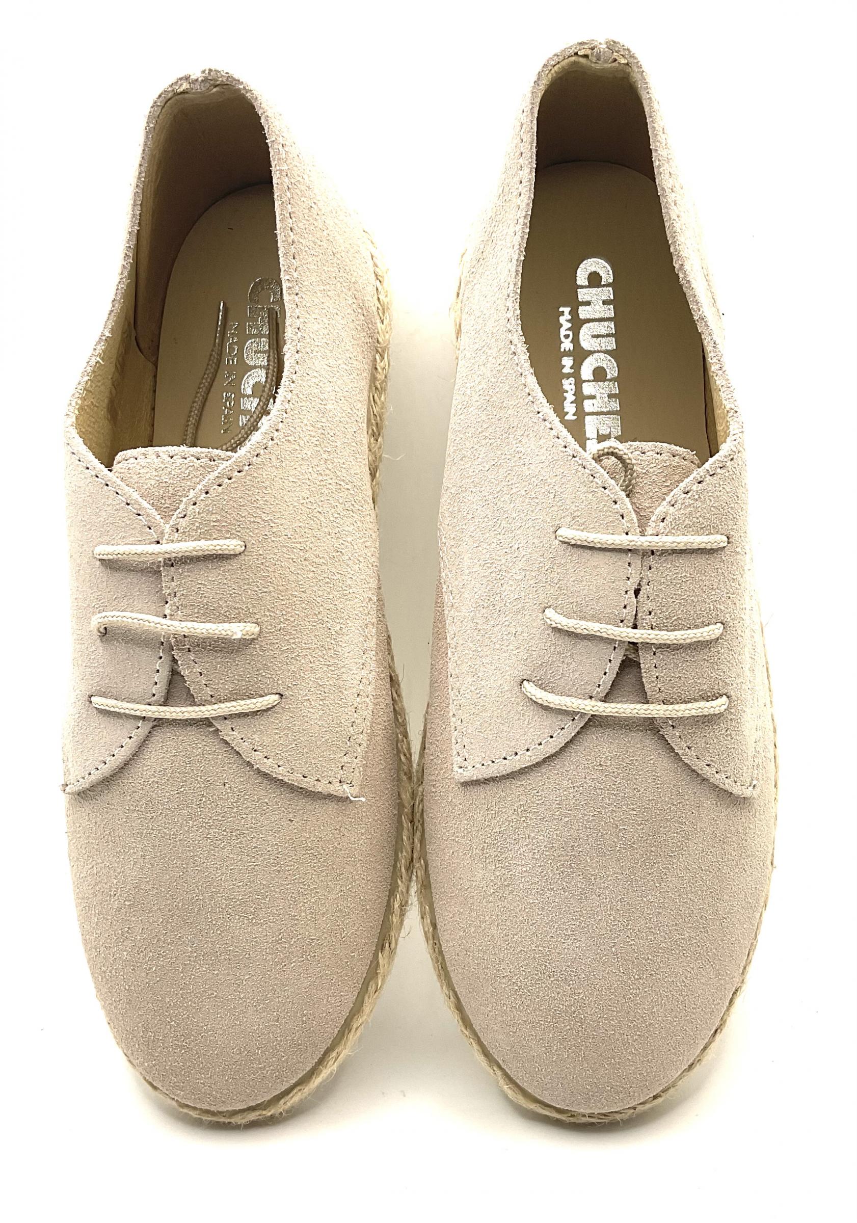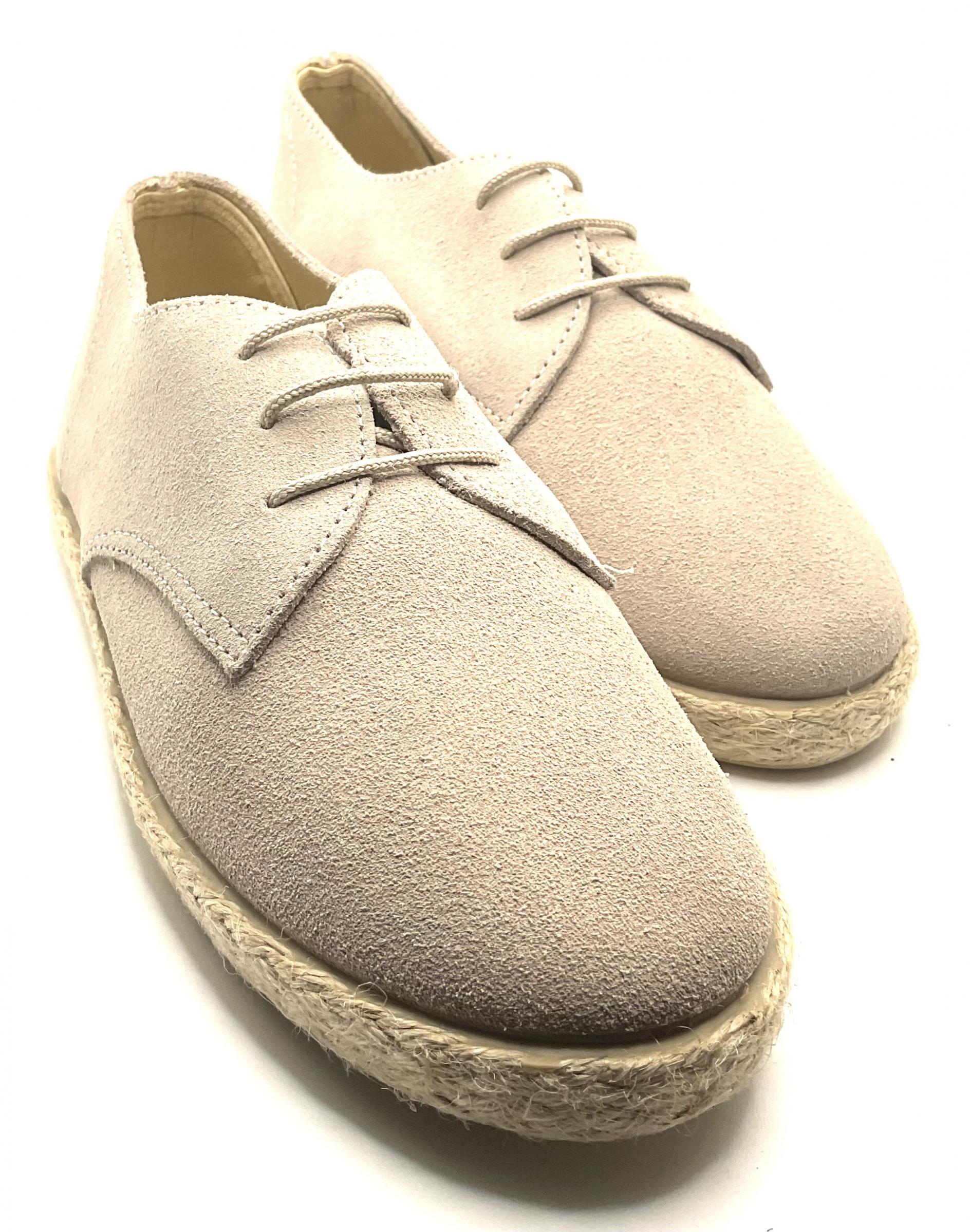 Zapato Blucher niño, con piso de yute Y ajuste con cordón, fabricado en piel de serraje color arena . Ideal para un día tan especial como la primera comunión.