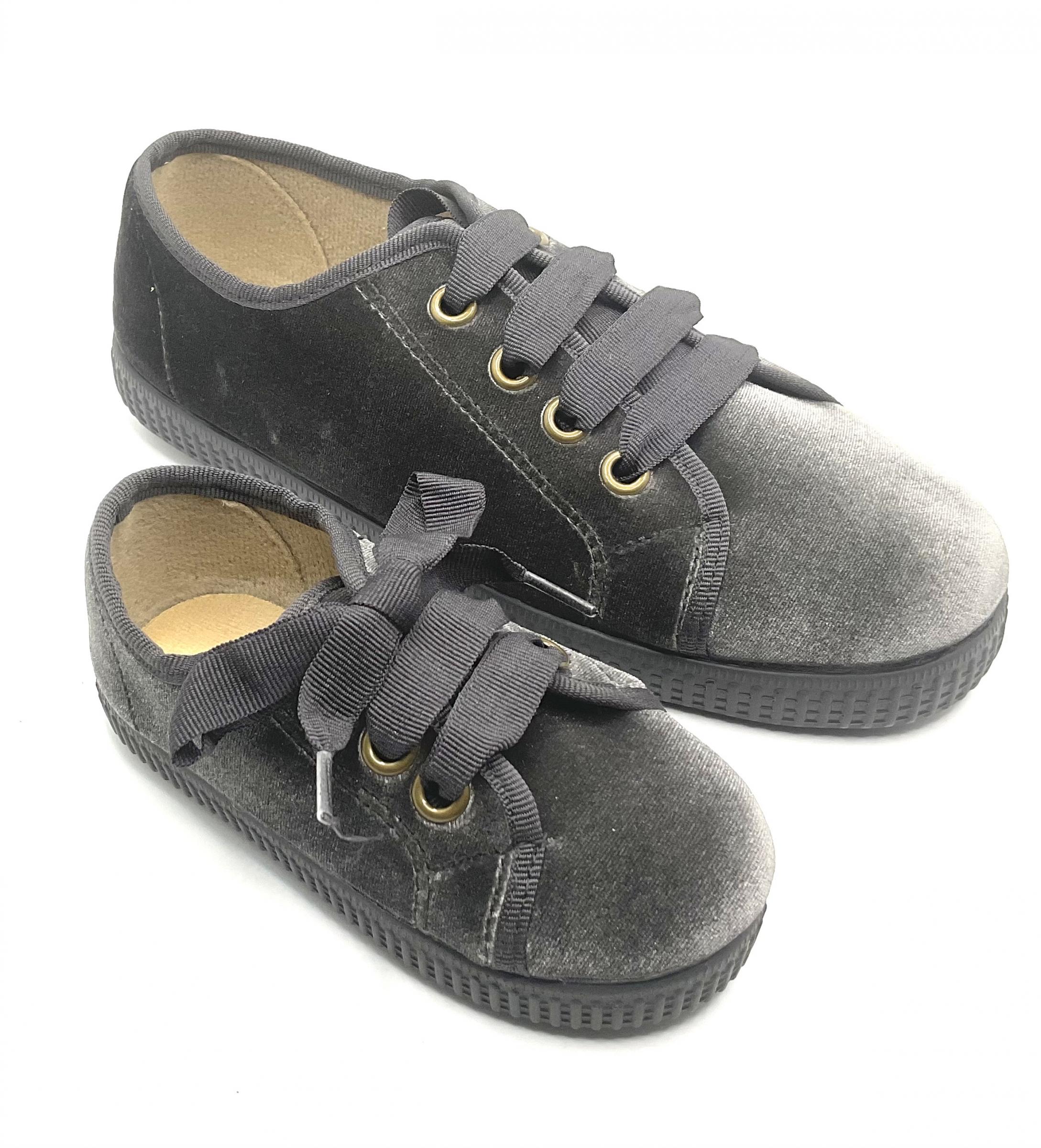 Blucher de terciopelo gris, ajuste con lazo - cordón, piso de goma .