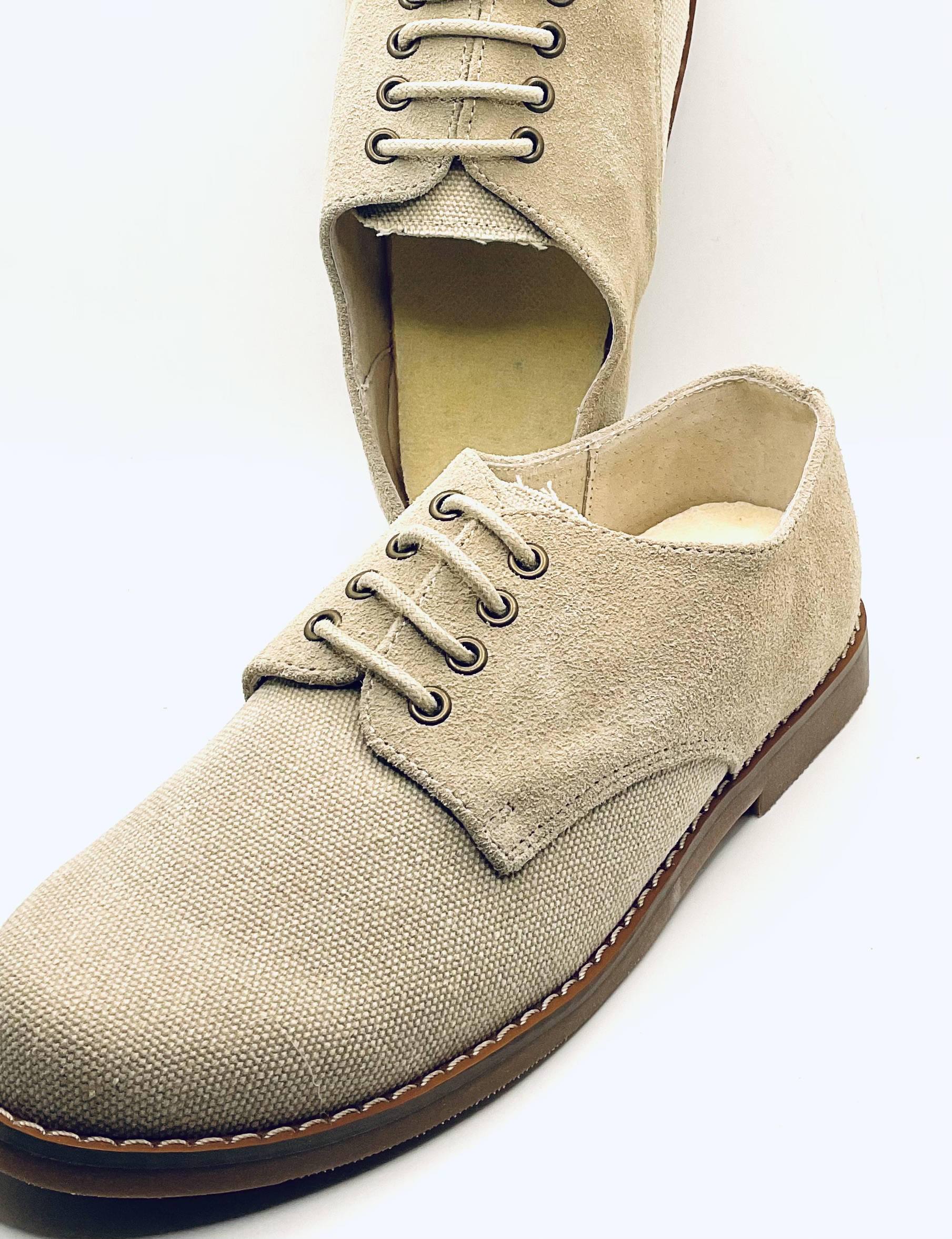 Zapato clásico para primera comunión en color beige , combinando piel de ante con lino en color crudo.