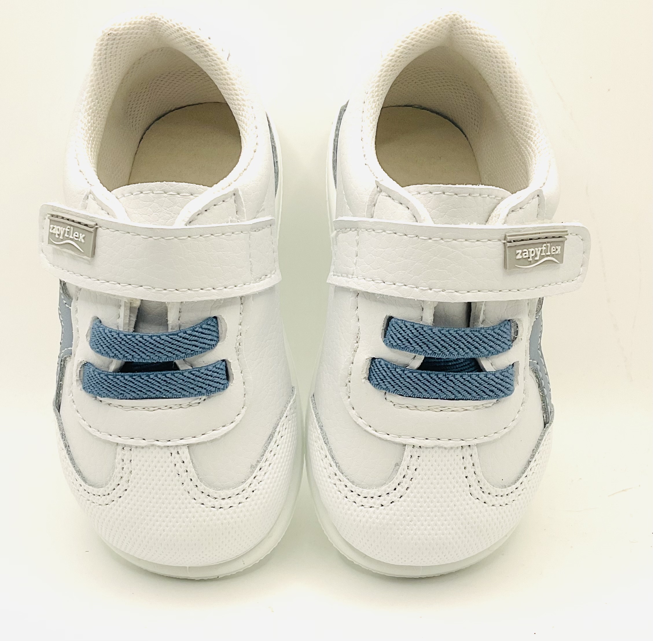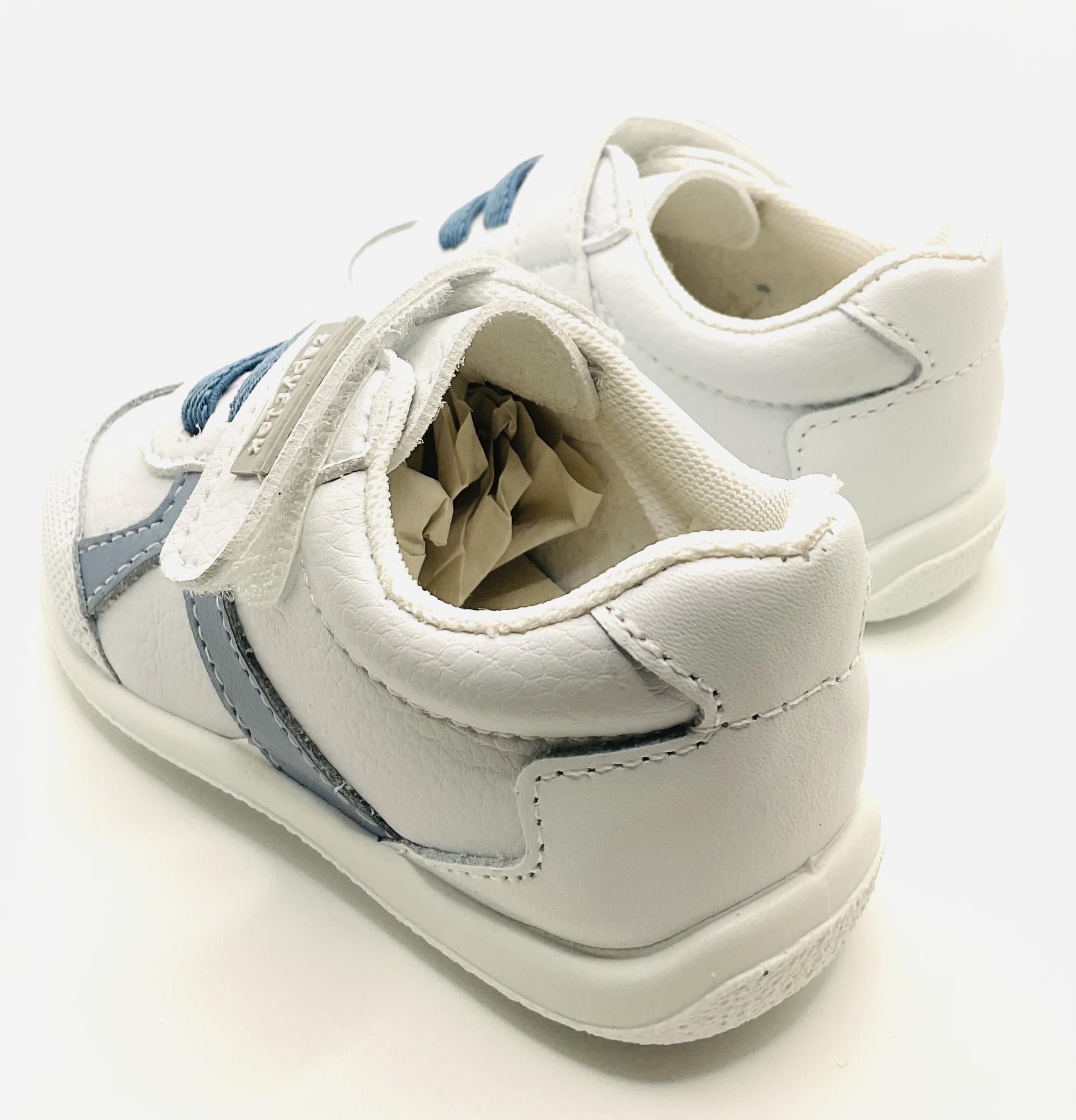 Deportivas blancas, con adornos en azul, ajuste con velcro y cordones elásticos también en azul, horma respetuosa, ligera y muy flexible. Para empeine medio bajo , con todas las características del calzado respetuoso , respetando el desarrollo de los pies de vuestros hijos , libre de contrafuertes, con zero drop y muy flexibles en metatarso.