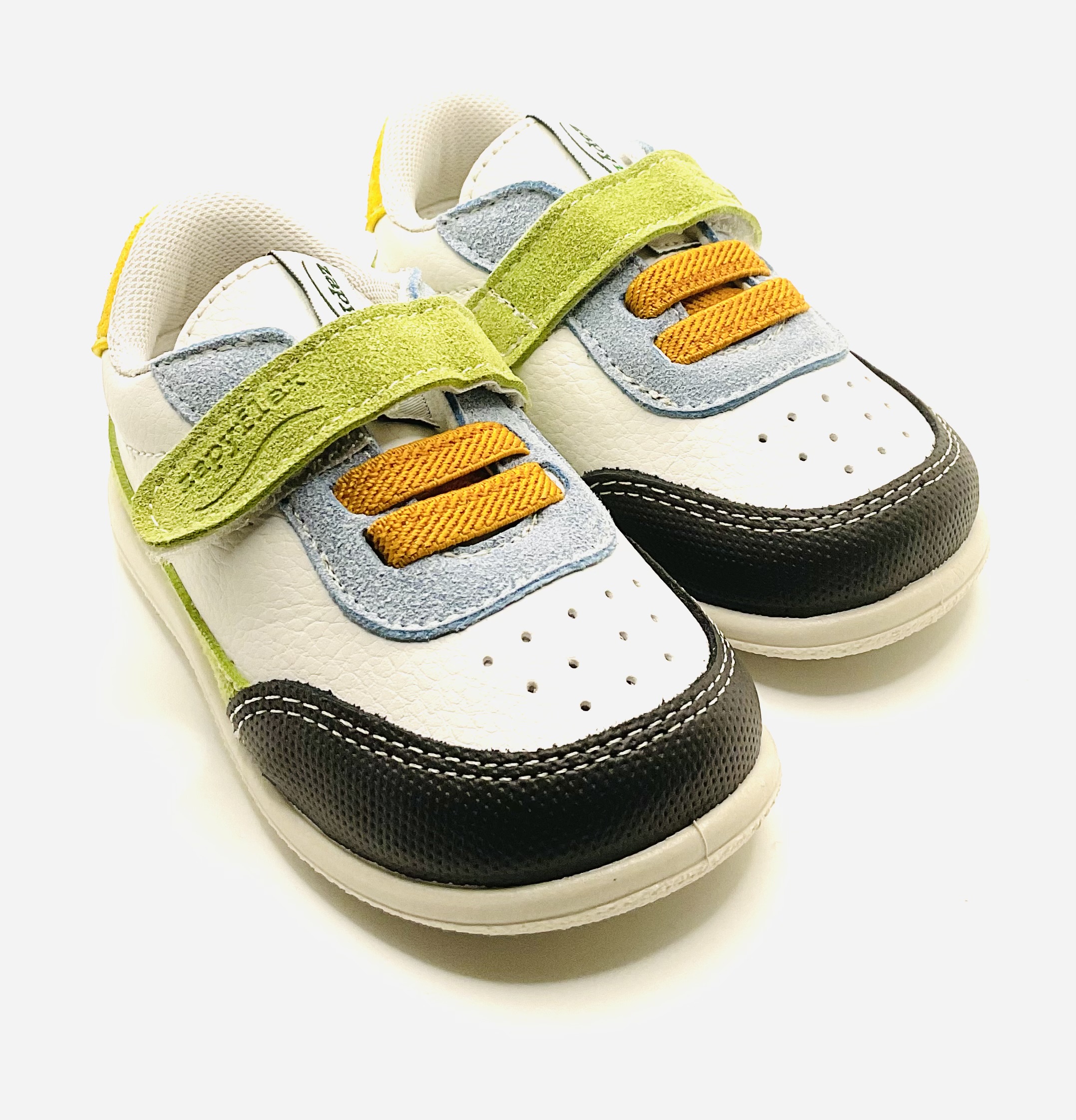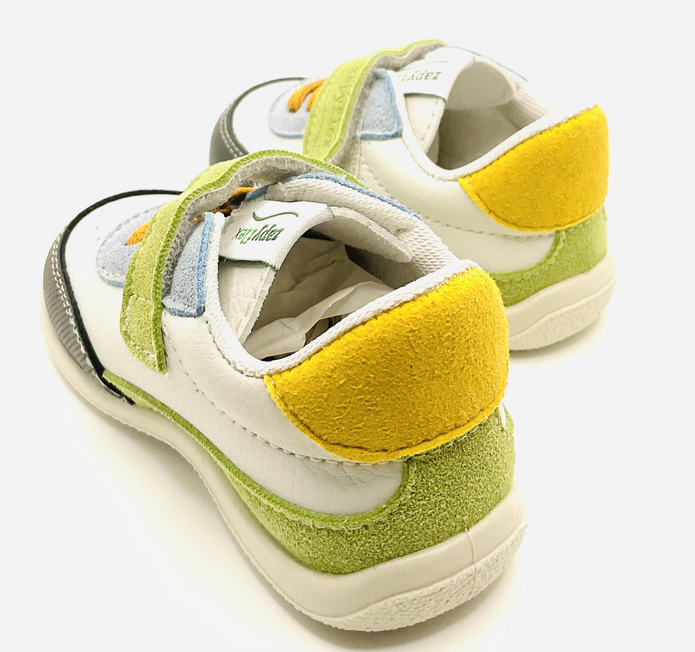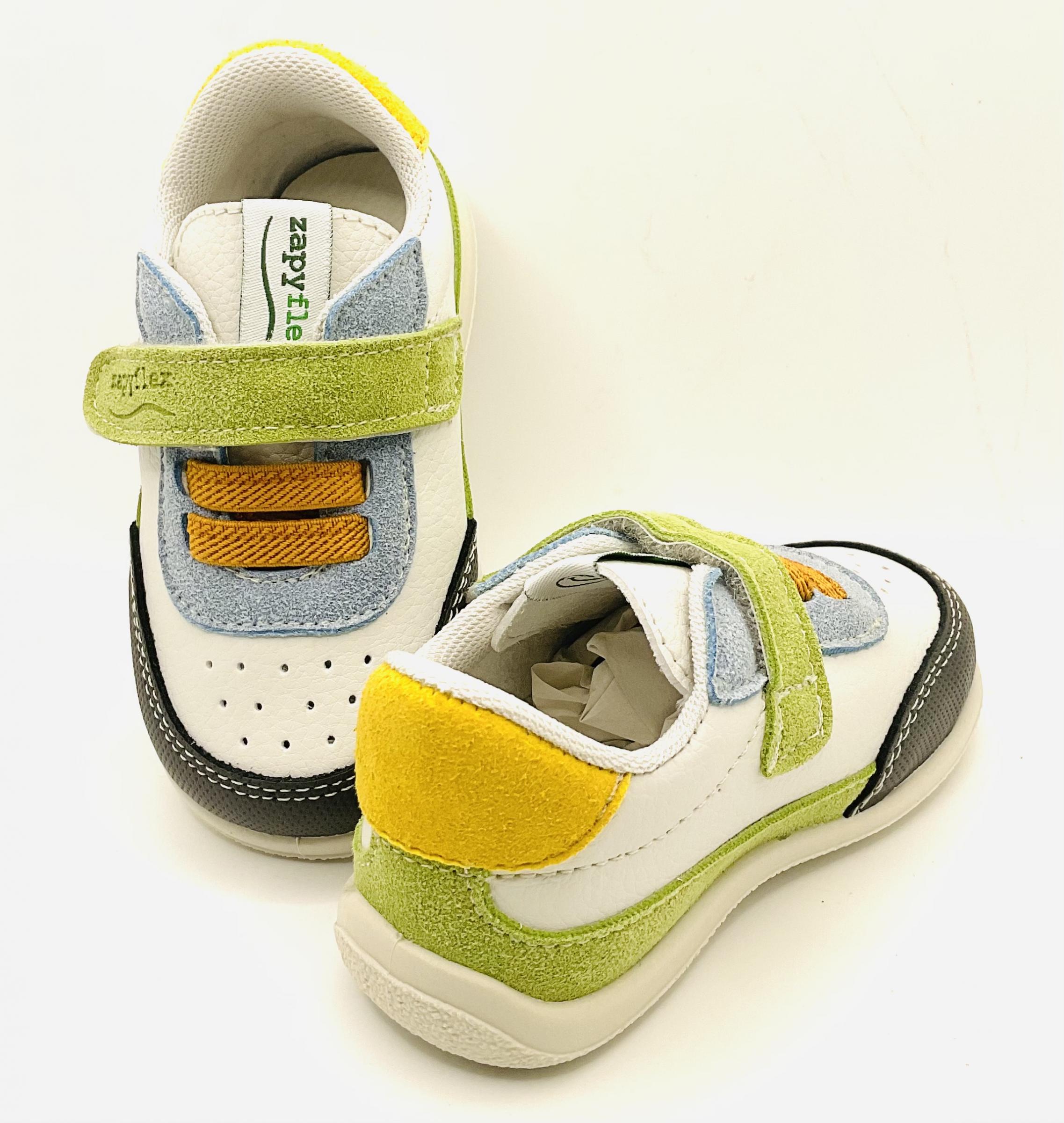Deportivas de la marca Zappy, con horma Barefoot y respetuosas, respetando el desarrollo natural de los pies de tus hijos, sin contrafuertes, con cero Drop y muy flexibles en la zona del metatarso, fabricadas en piel blanca, con una bonita combinación en tonos azules, celestes y pistacho. La puntera es reforzada .