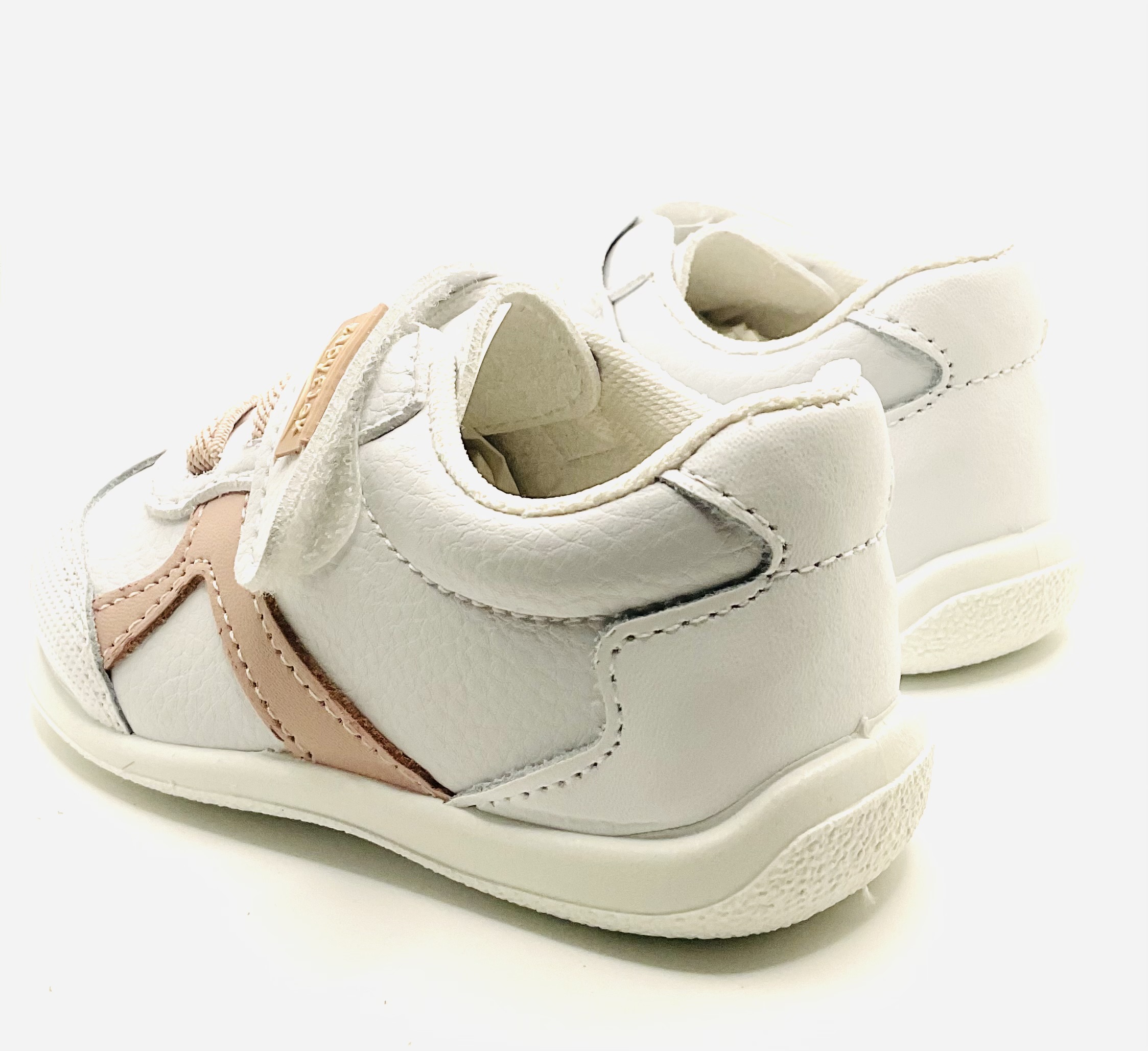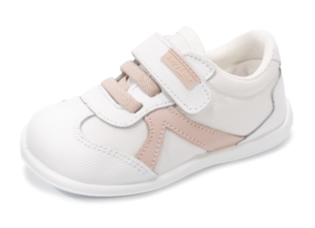 Deportiva blanca de piel de la marca Zappy, con adornos en rosa, ajuste y cierre con velcro y cordones elásticos también en color rosa, horma completamente respetuosa ,muy ligera y flexible.