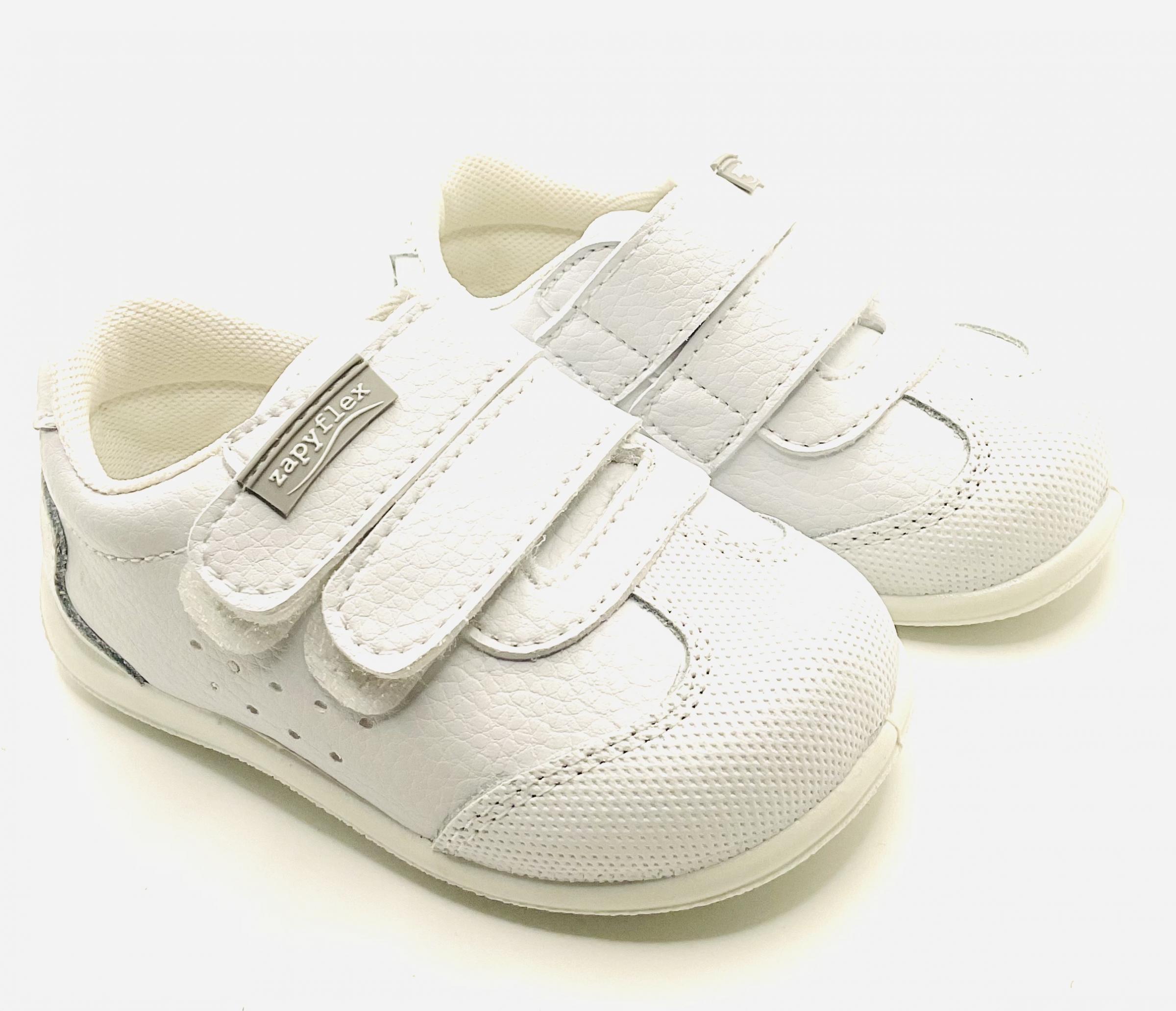 Deportiva Blanca de la marca Zappy, con ajuste de doble velcro y puntera reforzada . completamente respetuosa, sin contrafuertes, muy flexibles en el metatarso y con zero Drop.