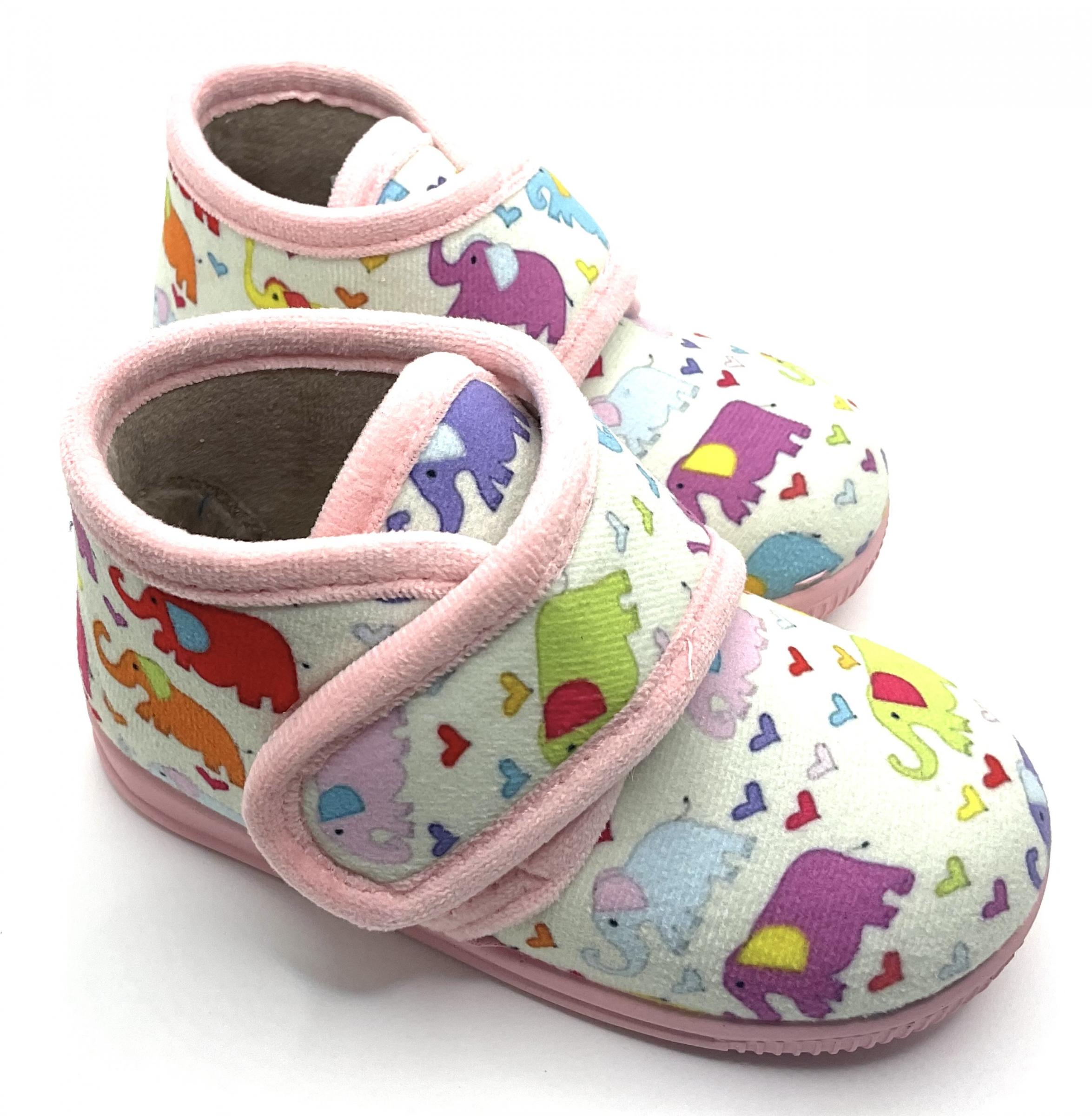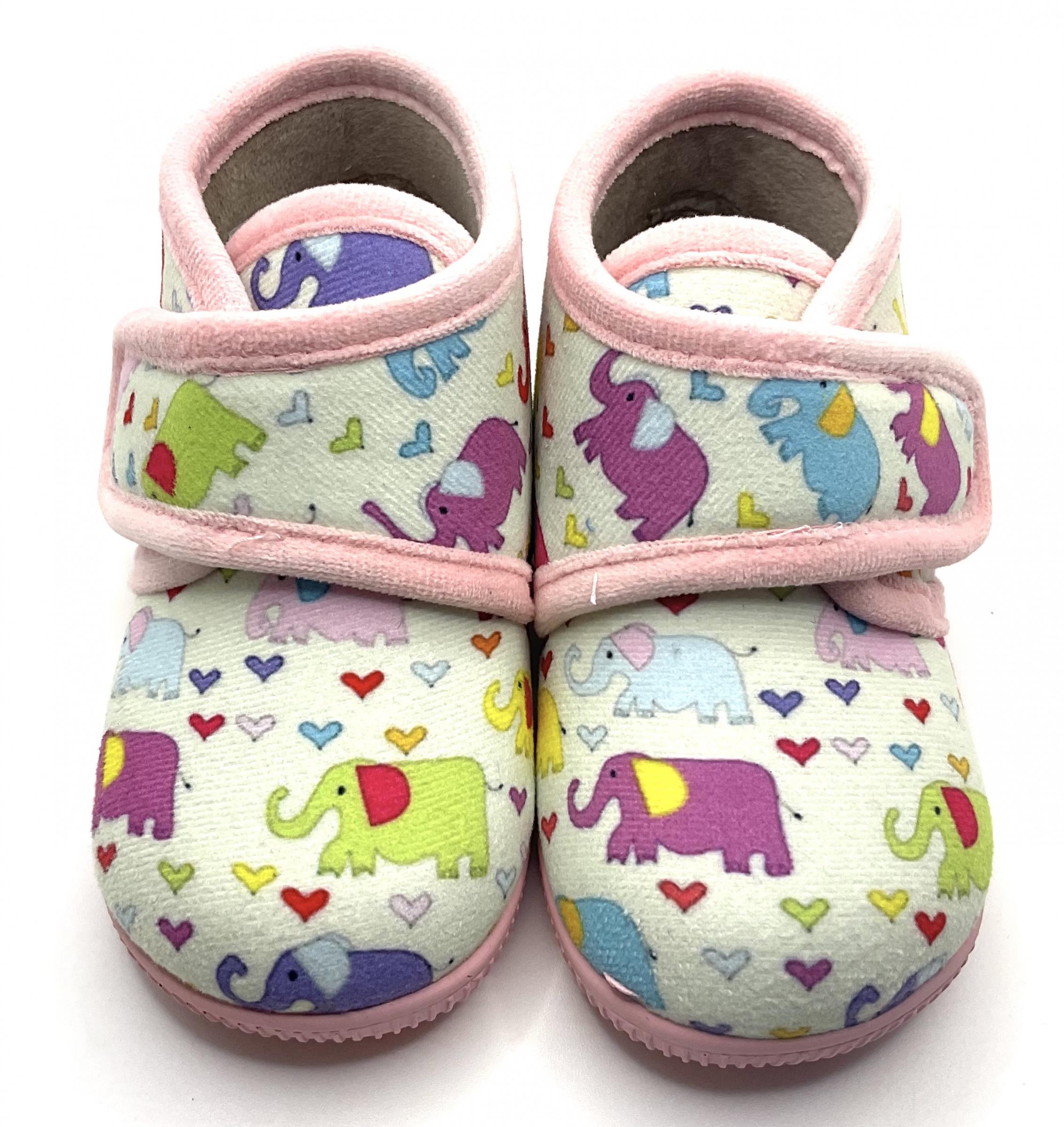 Zapatillas de estar por casa, fabricadas en una felpa muy suave, con cierre de velcro, sin costuras, ni contrafuertes internos, ligeras y muy flexibles y con un precioso dibujito de elefantes de colores
