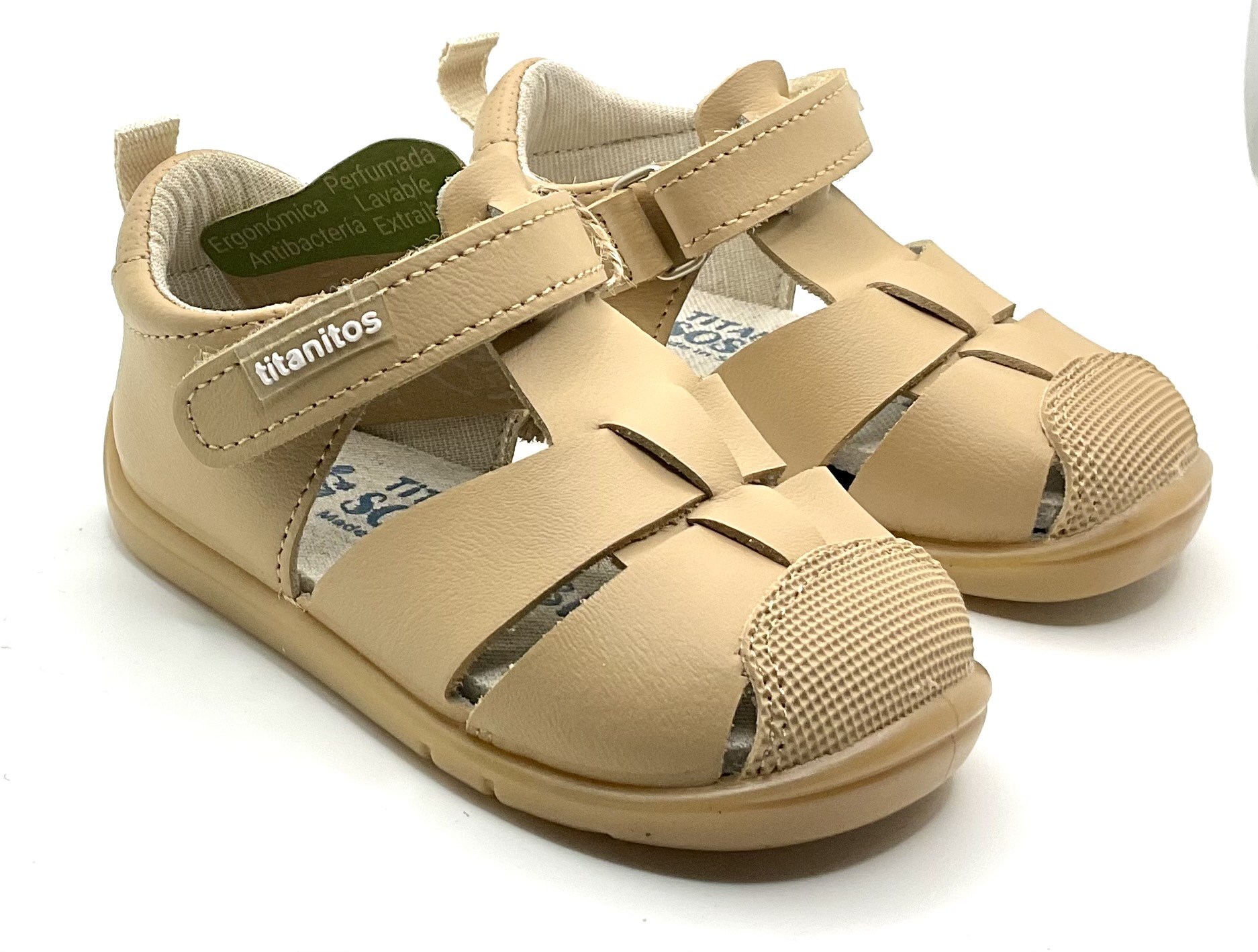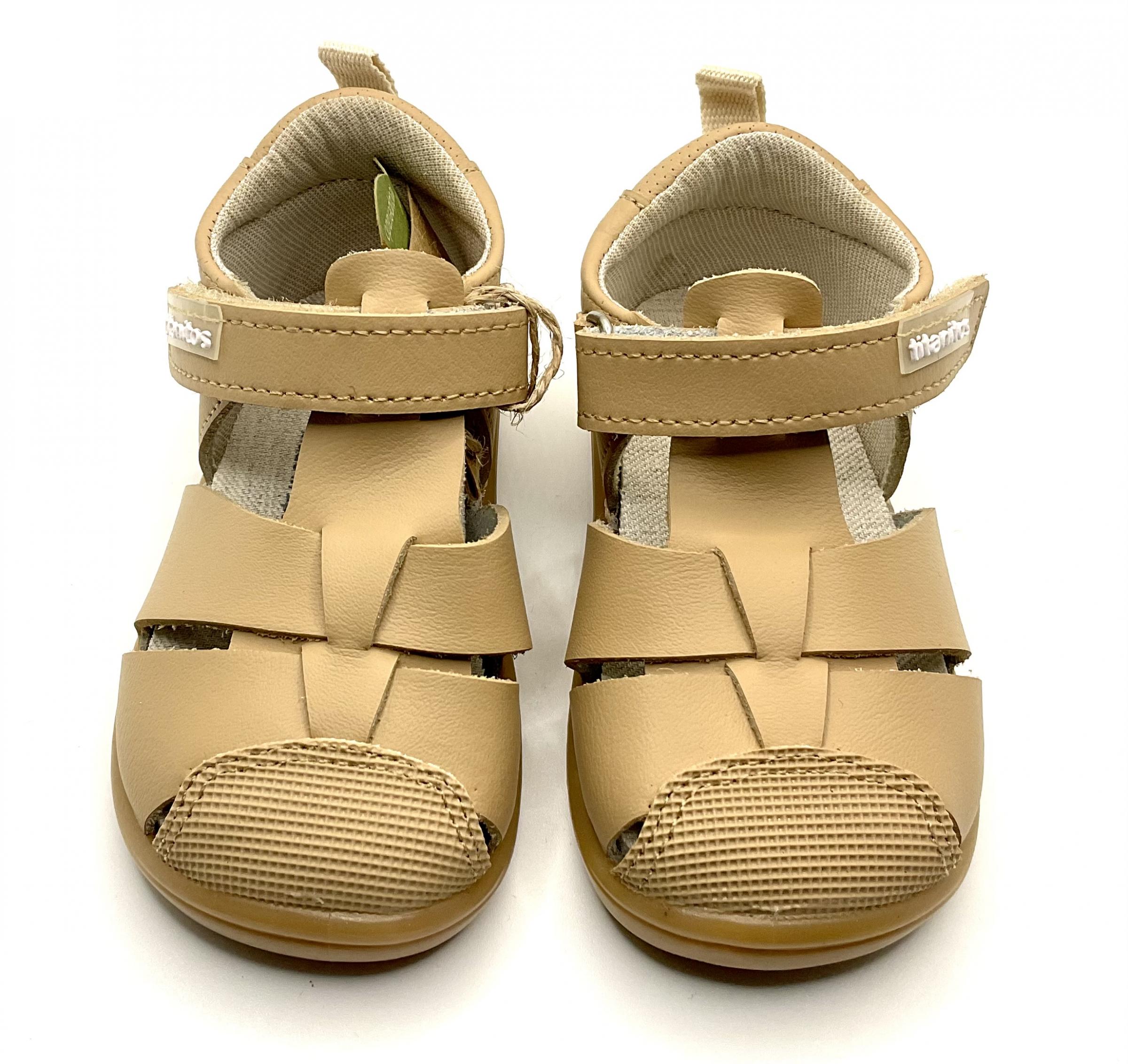 Sandalia de horma respetuosa de la marca (titanitos) fabricada en piel lavable de color , no tiene contrafuertes ni Drop. La plantilla es extraíble y son muy flexibles en el metatarsiano.
