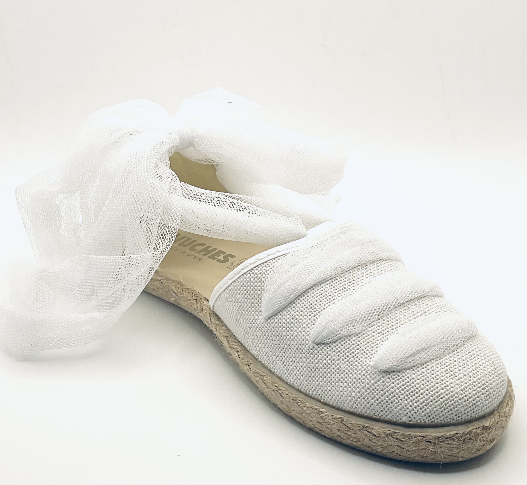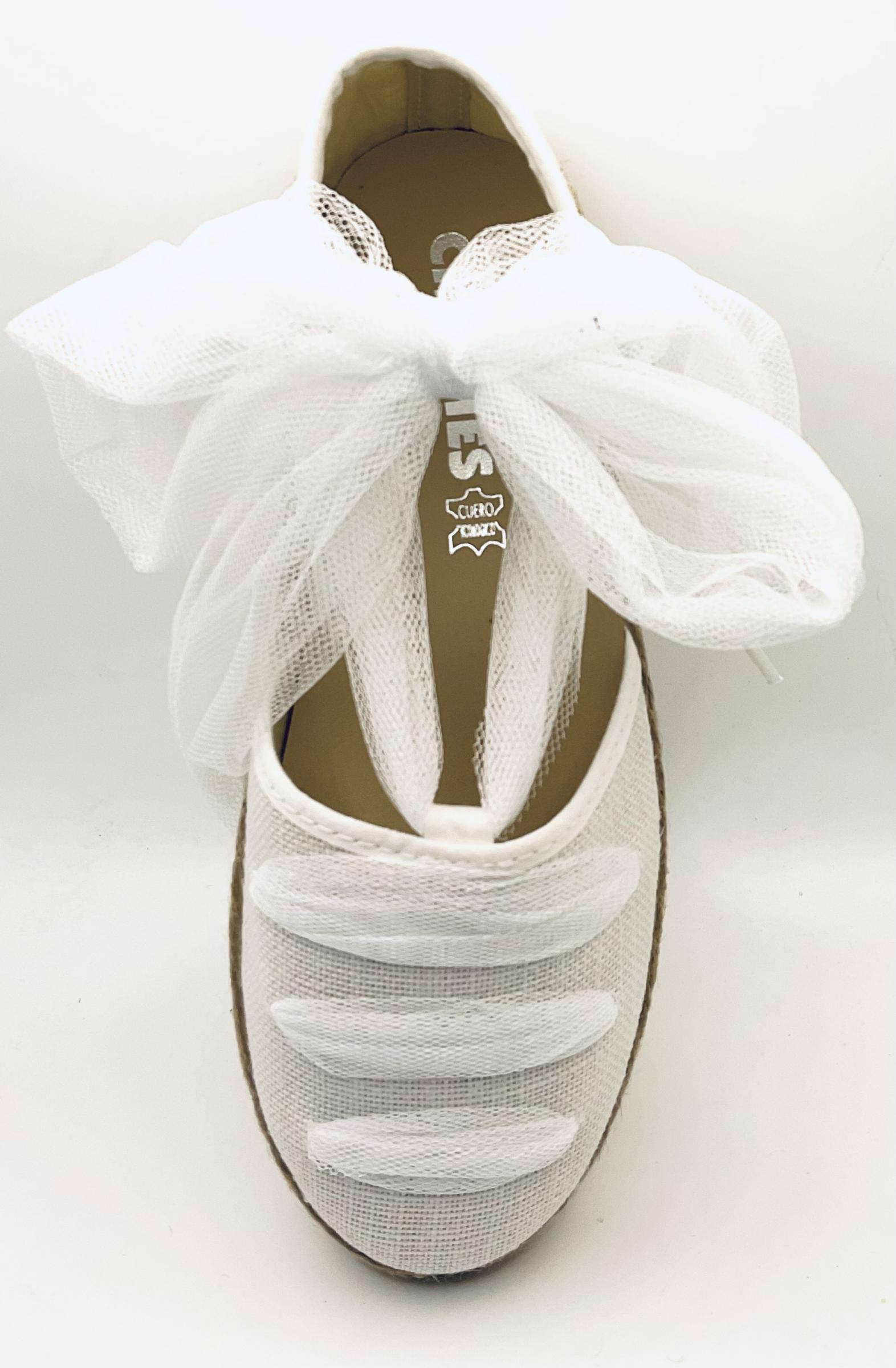 Zapatillas de esparto en color blanca fabricada en lino de algodón con cintas cruzadas, tanto en la pala como en el tobillo con cinta de tul a tono con el zapato.
