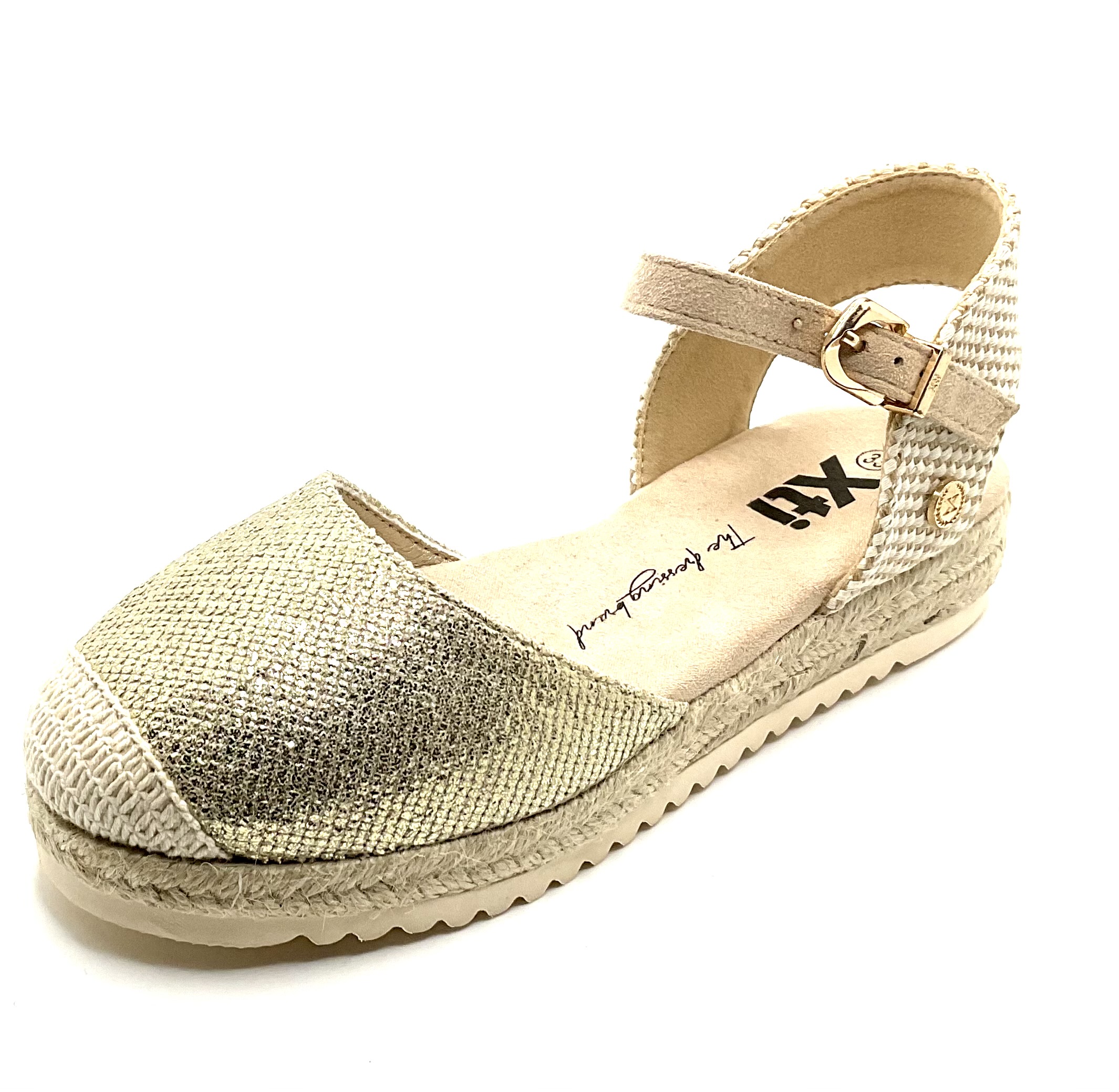 esparto de la marca XTI con una leve plataforma y en color metalizado oro, Con talón abierto y cierre de Villa ideal para esas pre adolescentes y adolescentes que quieren un zapato arregladito que combine con todo.