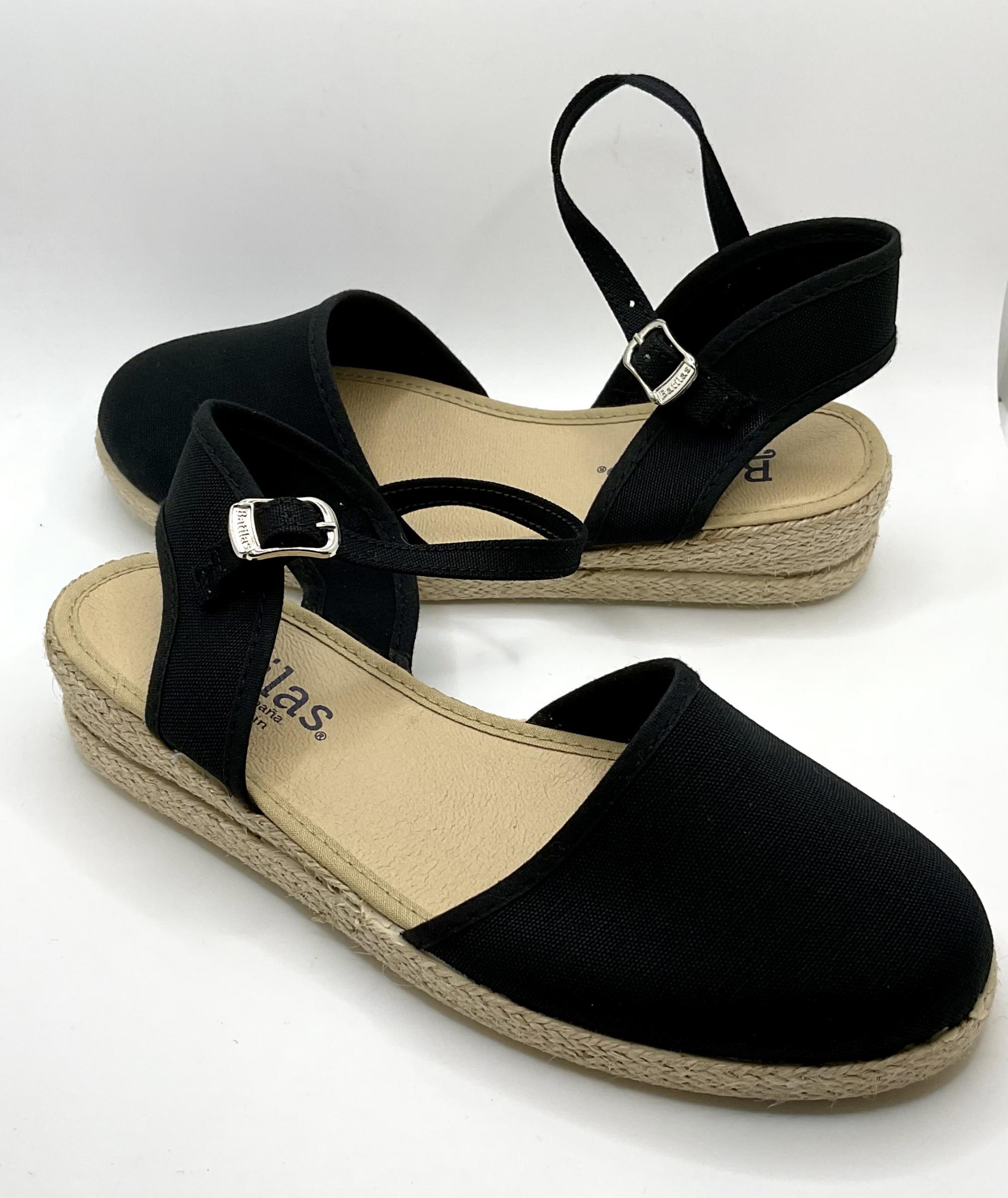 Zapatillas de Esparto con una pequeña cuña de 1 cm y medio, Fabricada en lona de algodón negra, con ajuste de Hebilla