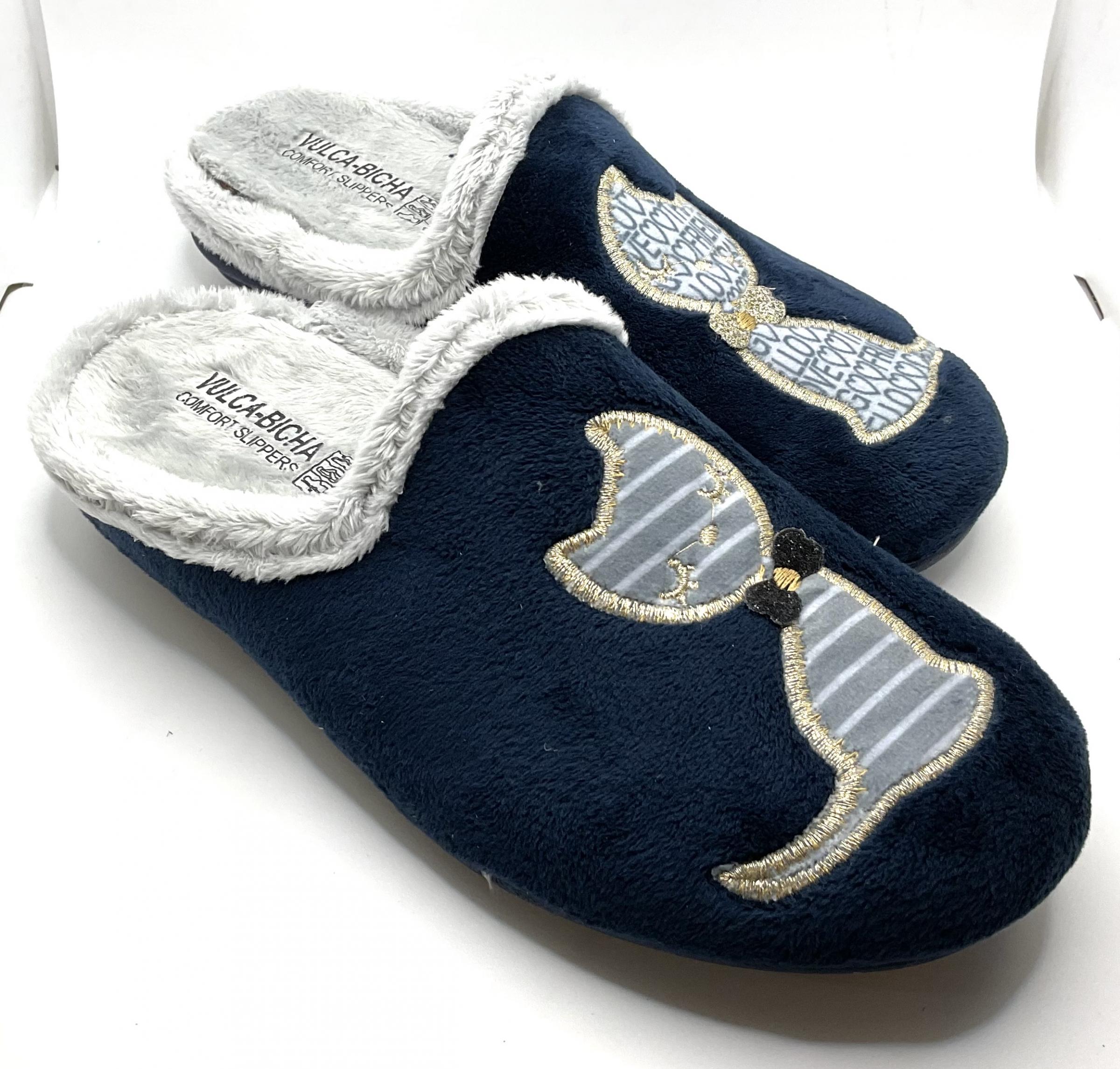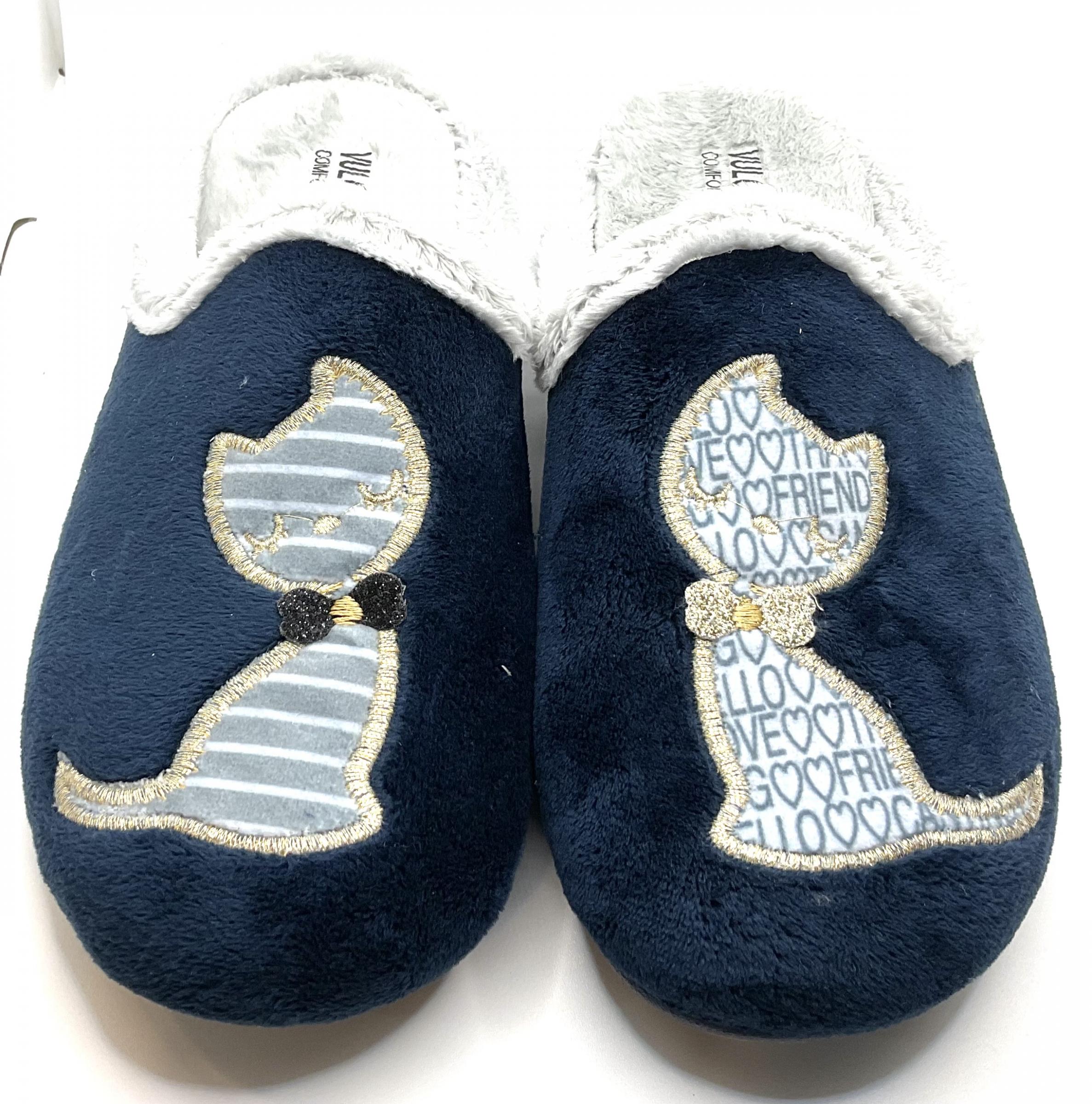Zapatillas para estar en casa en felpa azul MARINA con bordado de gatos,, Ligeras y flexibles, muy calentitas, sin costuras interiores y sin contrafuertes.