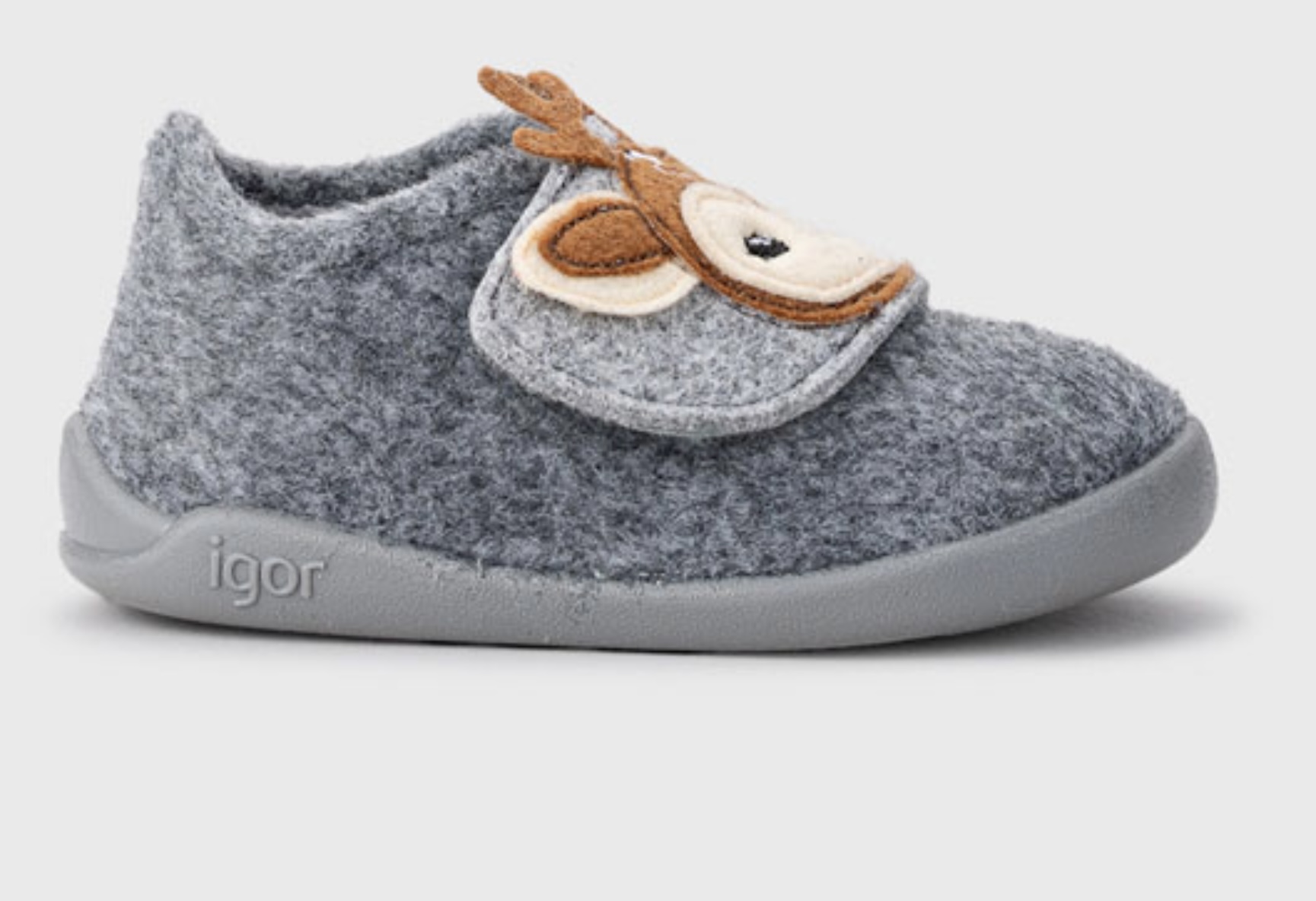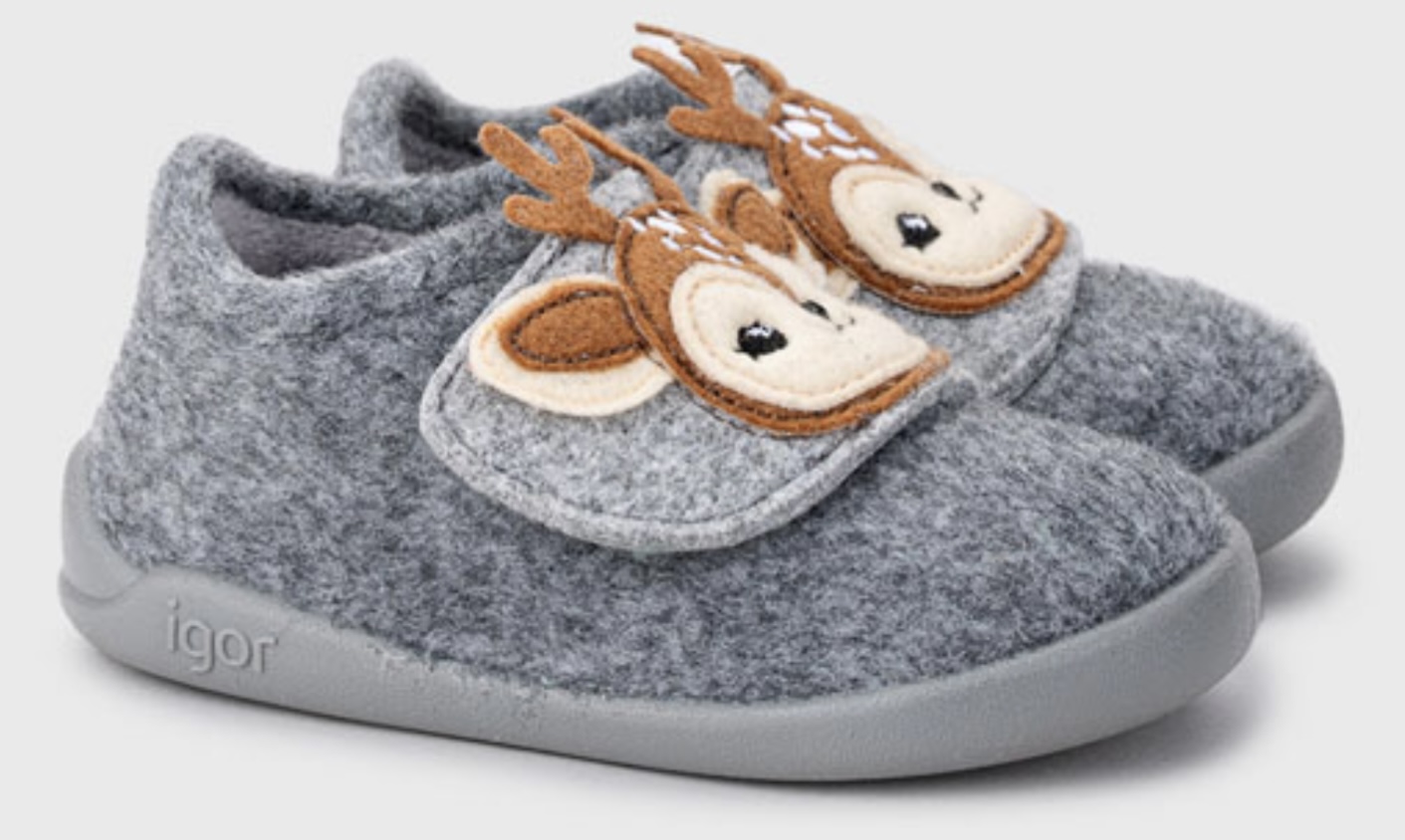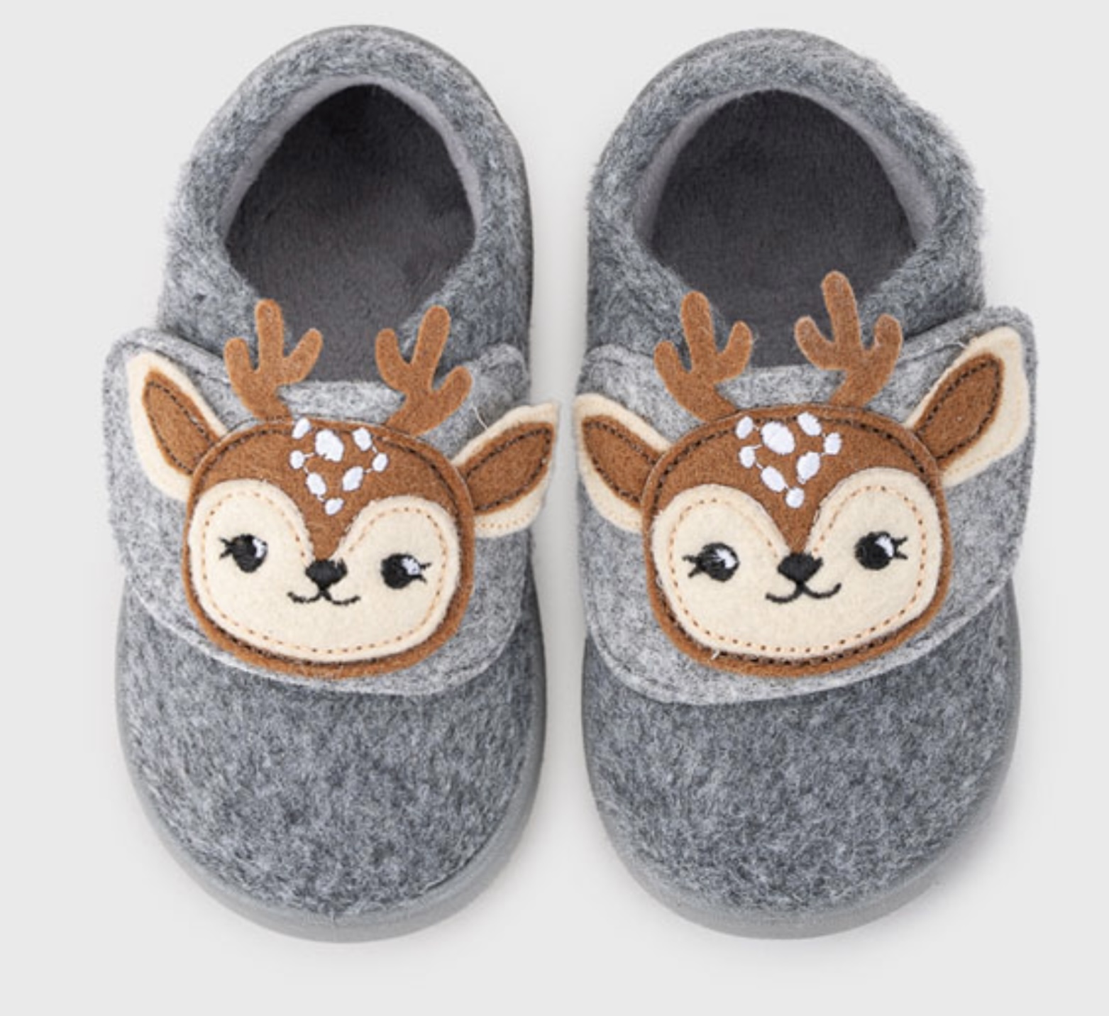 zapatilla de estar por casa para niños y niñas con detalle de reno, de concepto barefoot medium, cero drop, flexible y blandita, fabricada en un tejido súper blandito, calentito y suave.