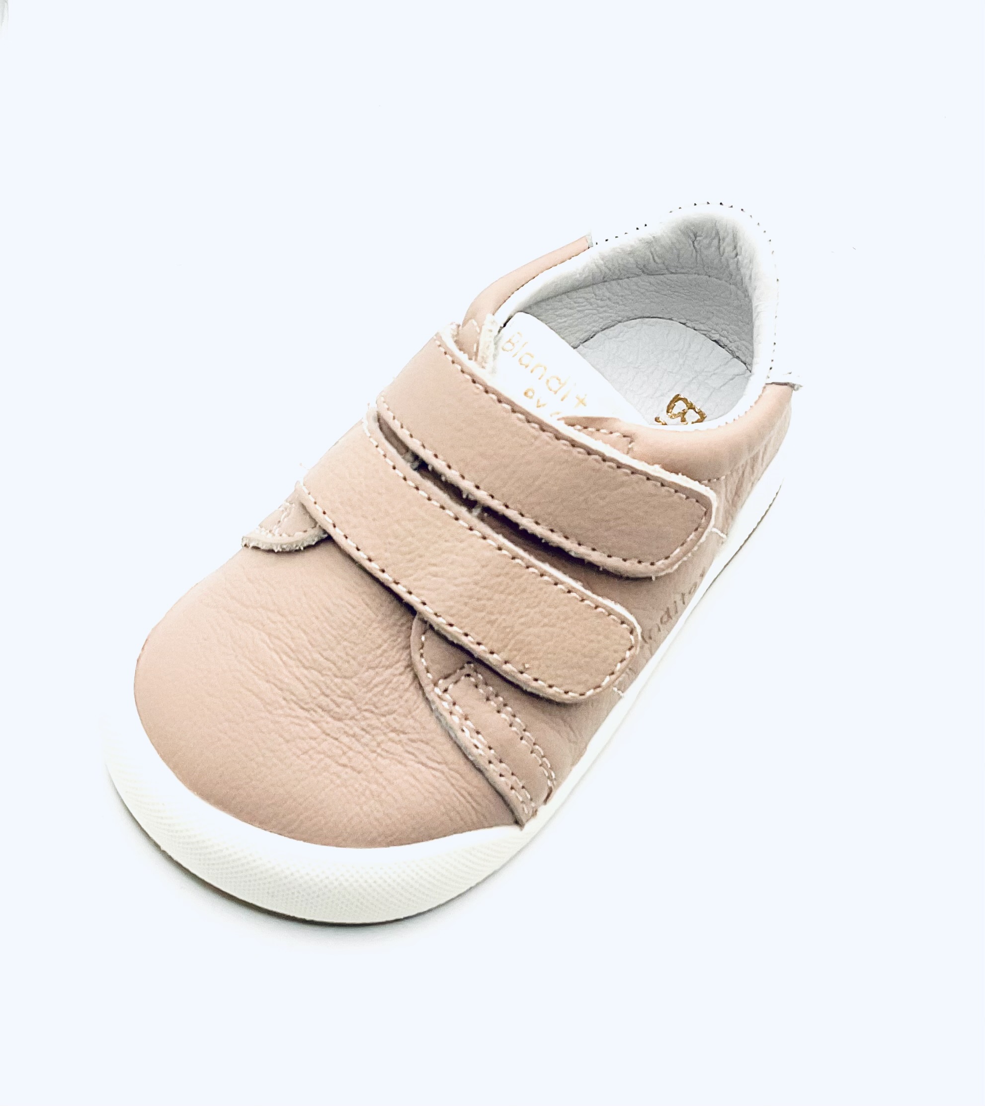 Deportiva respetuosa de la marca Blanditos, fabricada en piel de color rosa palo, ajuste con doble Velcro, Puntera, reforzada, flexible en metatarsiano, plantilla extraíble y piso antideslizante.