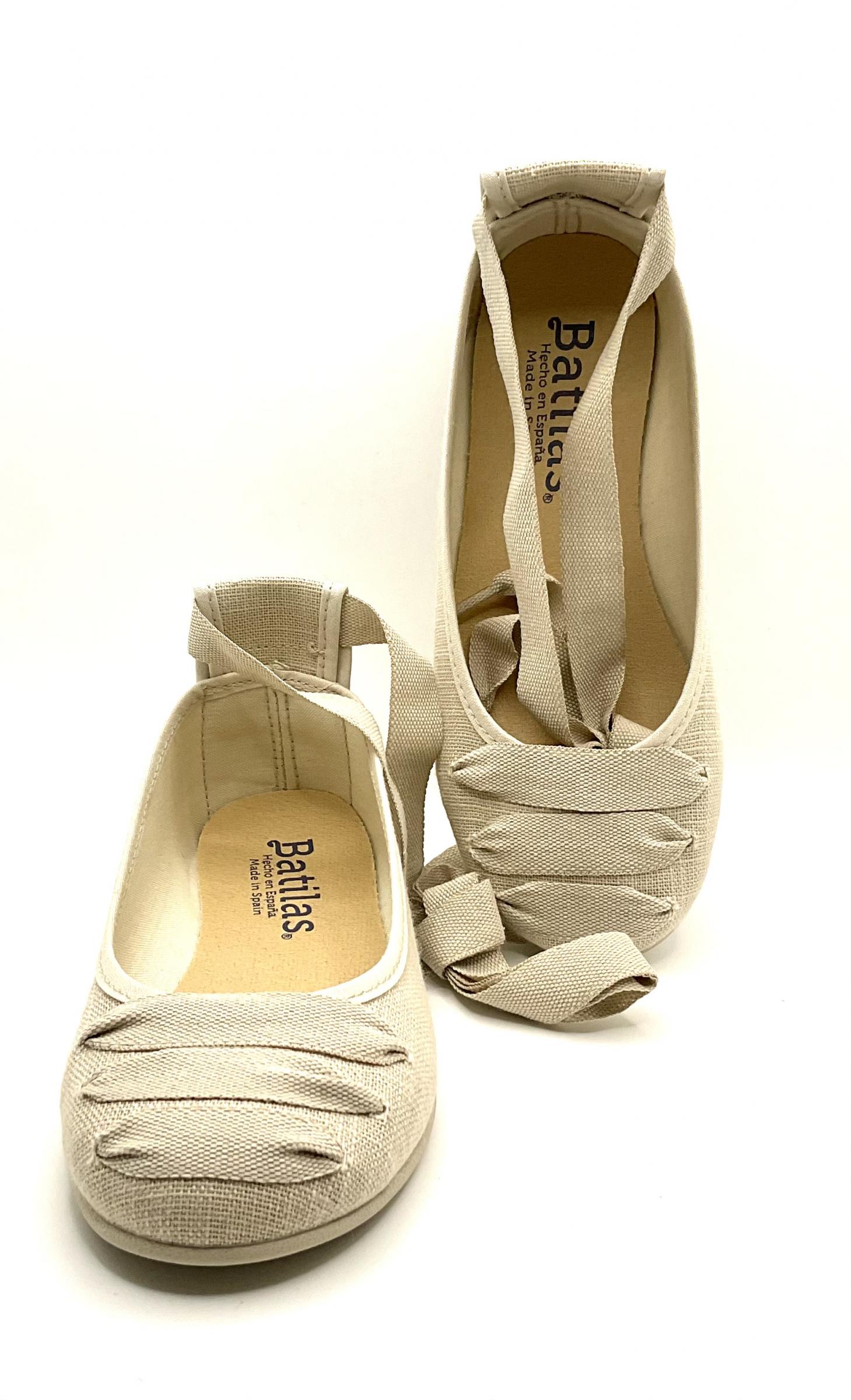 Manoletinas atadas al tobillo con cintas de algodón , y piso de goma a tono en color arena, muy ligeras y flexibles .