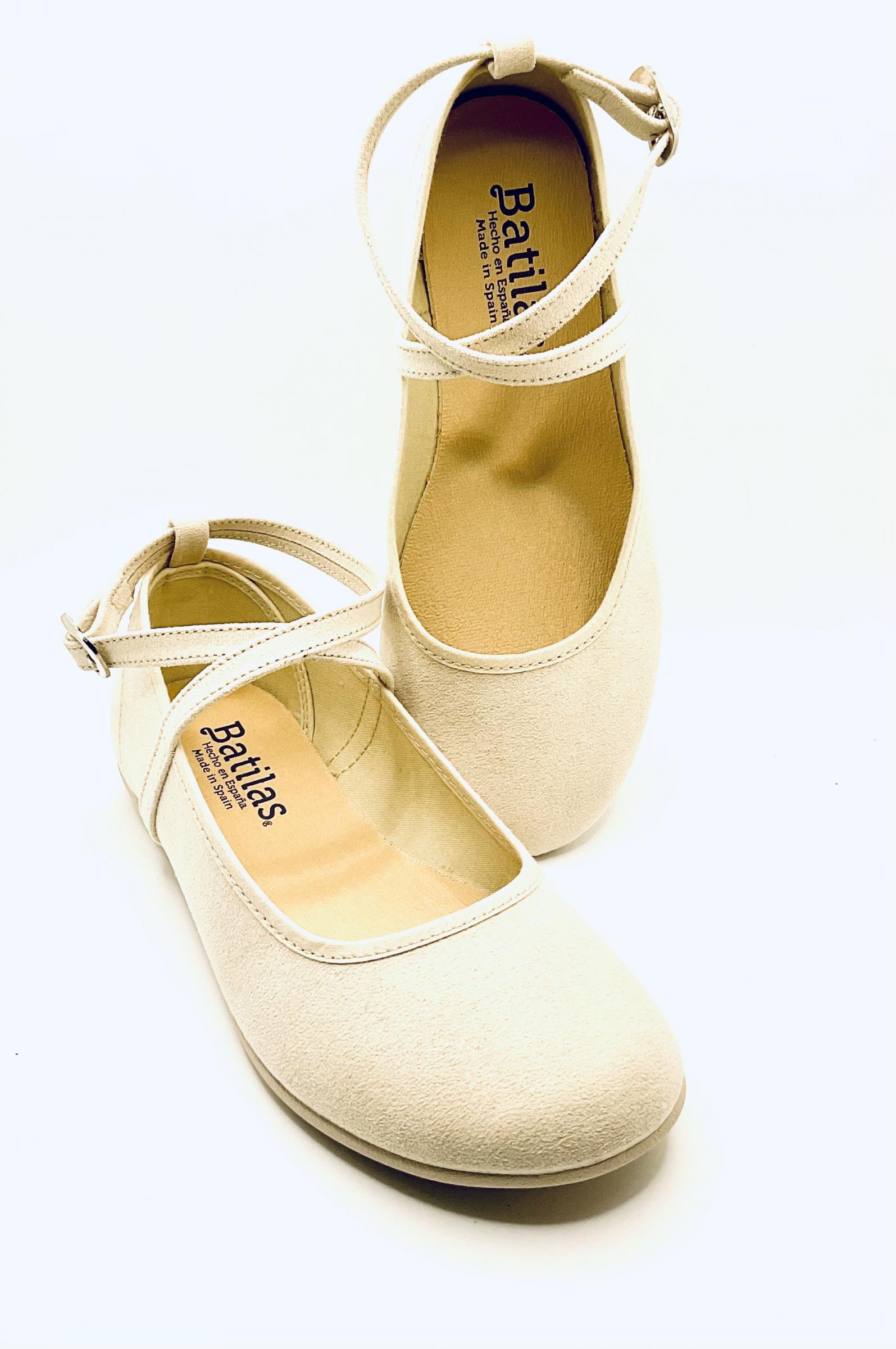 Manoletina tipo Gilda con cruce en el empeine ,atada al tobillo Mediante hebilla. Fabricada en Serratex de color beis, con piso de goma al tono, lo que hace que este calzado se ajuste perfectamente al pie y pueda ser lavado ,un zapato ligero y muy flexible para un día tan especial como el de su primera comunión