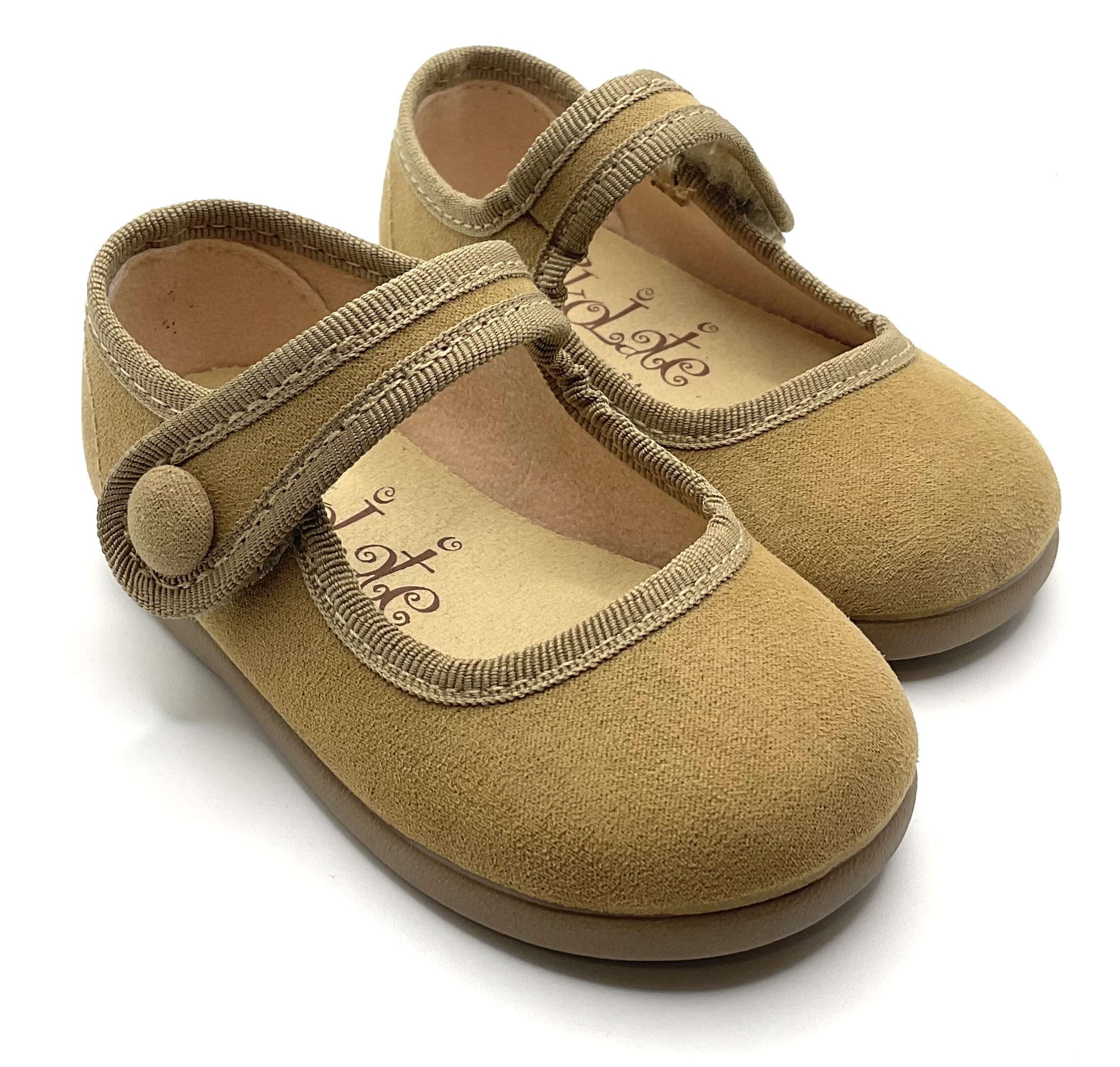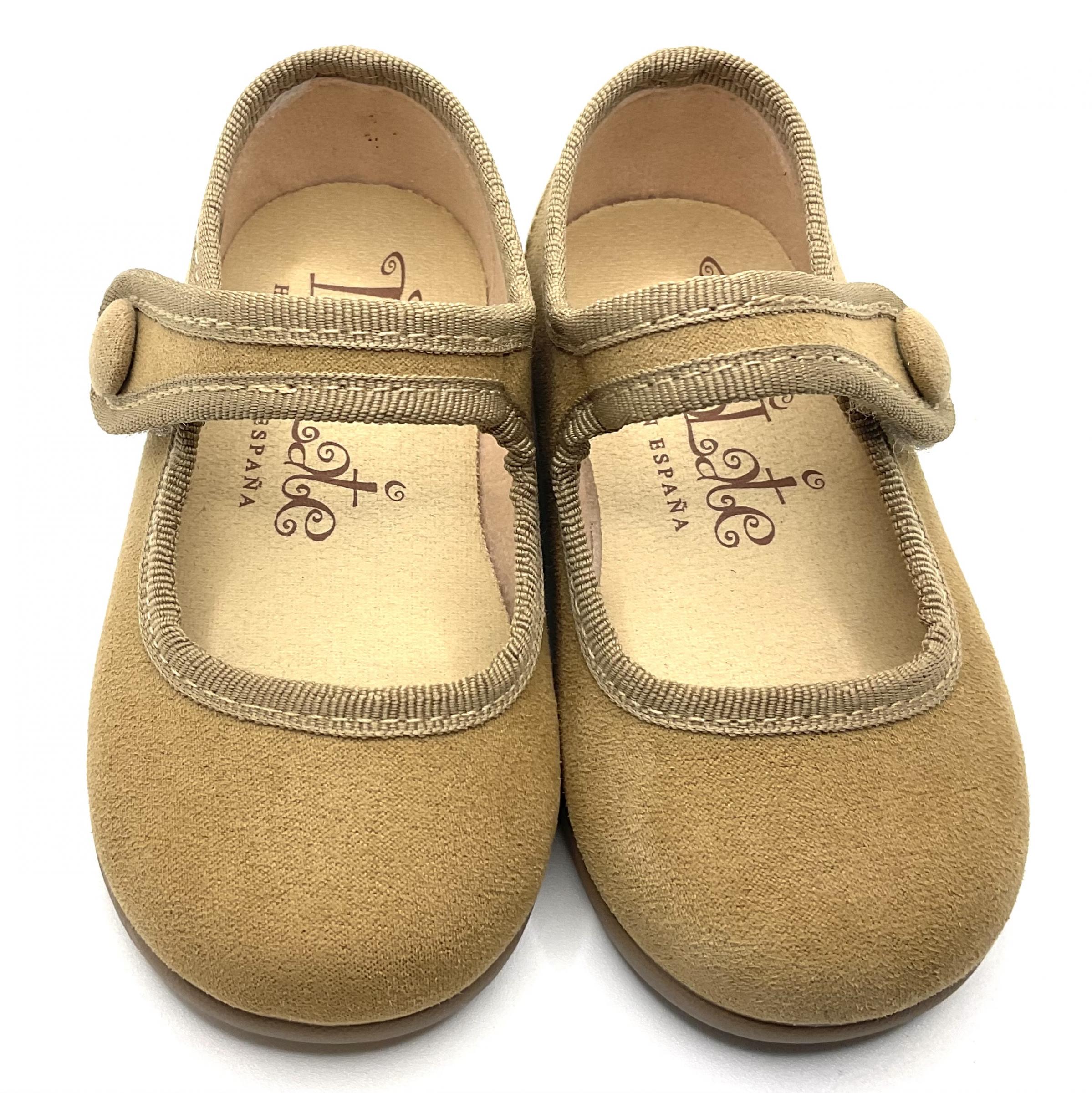 Merceditas, con cierre de Velcro y botón de adorno, fabricada en tela de Serrateix, en color Camel, ligera flexible y