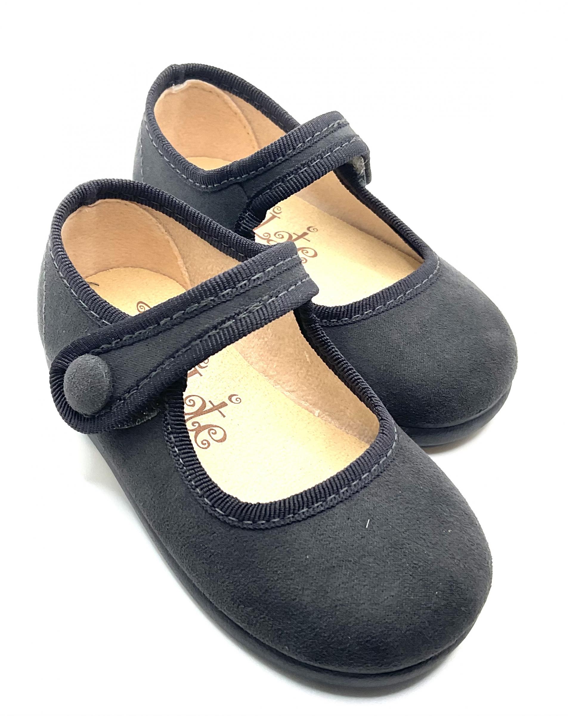 Merceditas, con cierre de velcro y adorno de botón, en color gris, fabricada en tela de Serrateix, ligera, flexible y lavable, su horma es clásica y convencional.