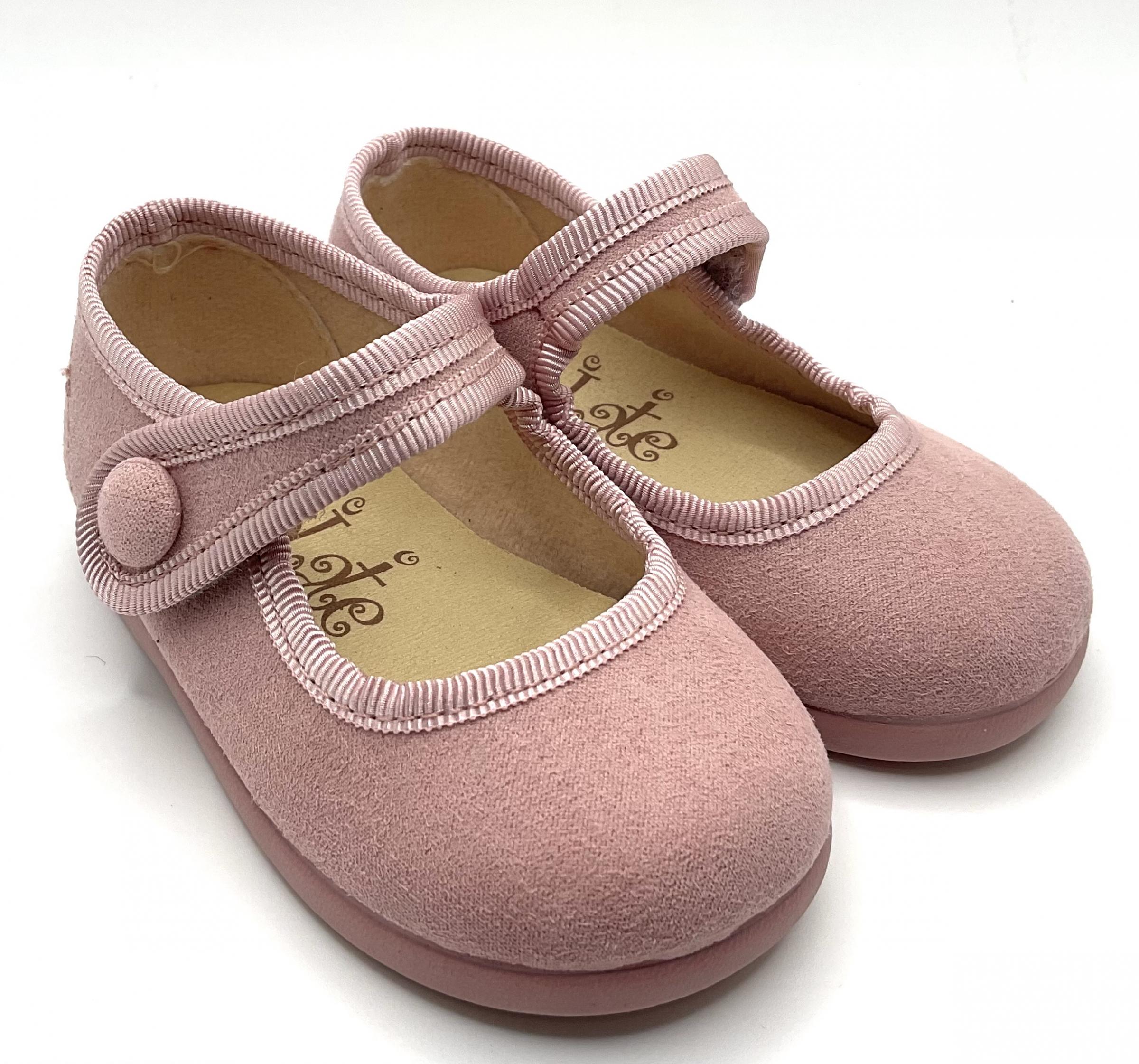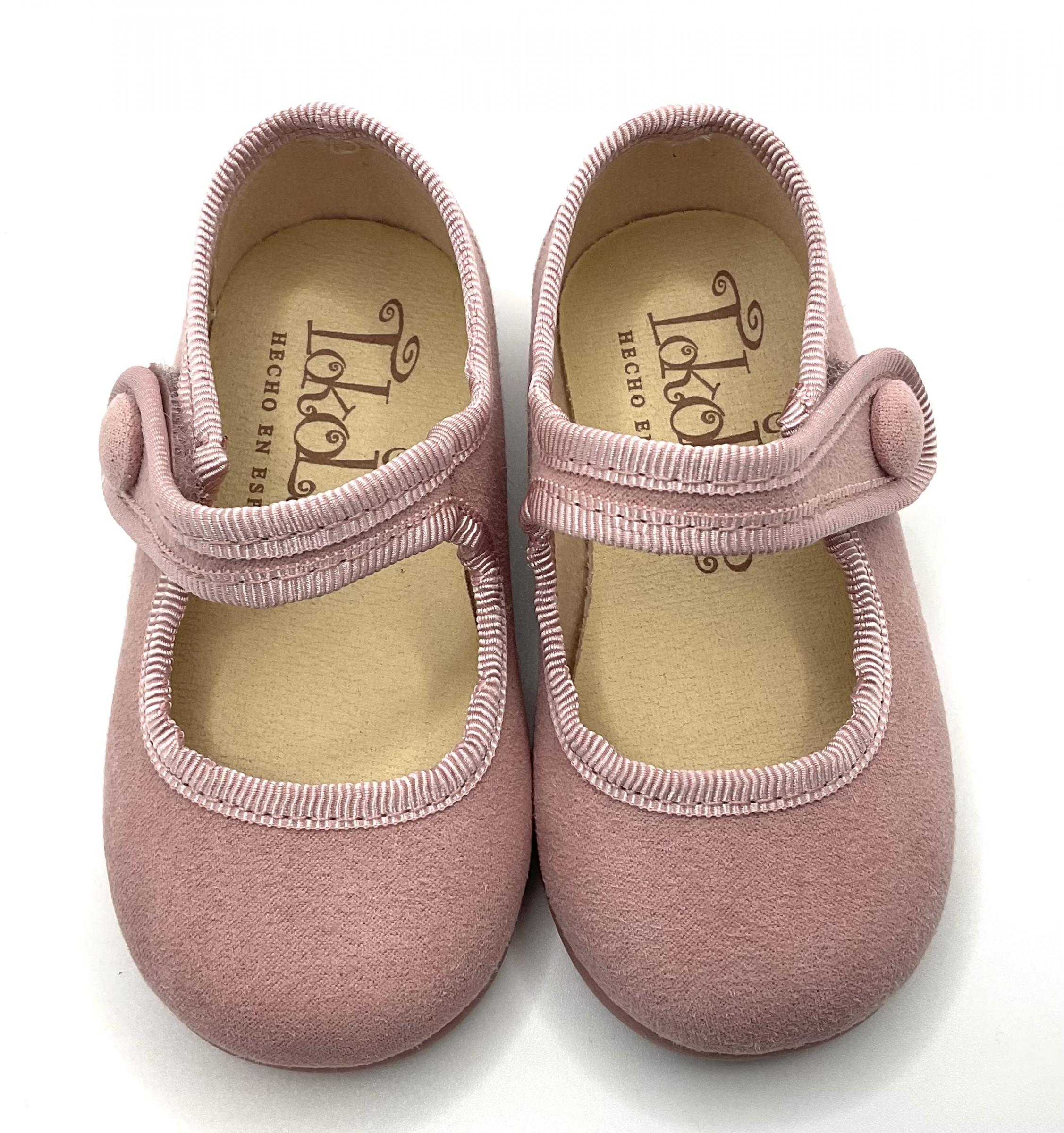 Merceditas, con cierre de velcro y botón de adorno, fabricada en tejido de Serrateix, rosa, maquillaje, ligera, flexible y lavable, su horma es clásica y convencional